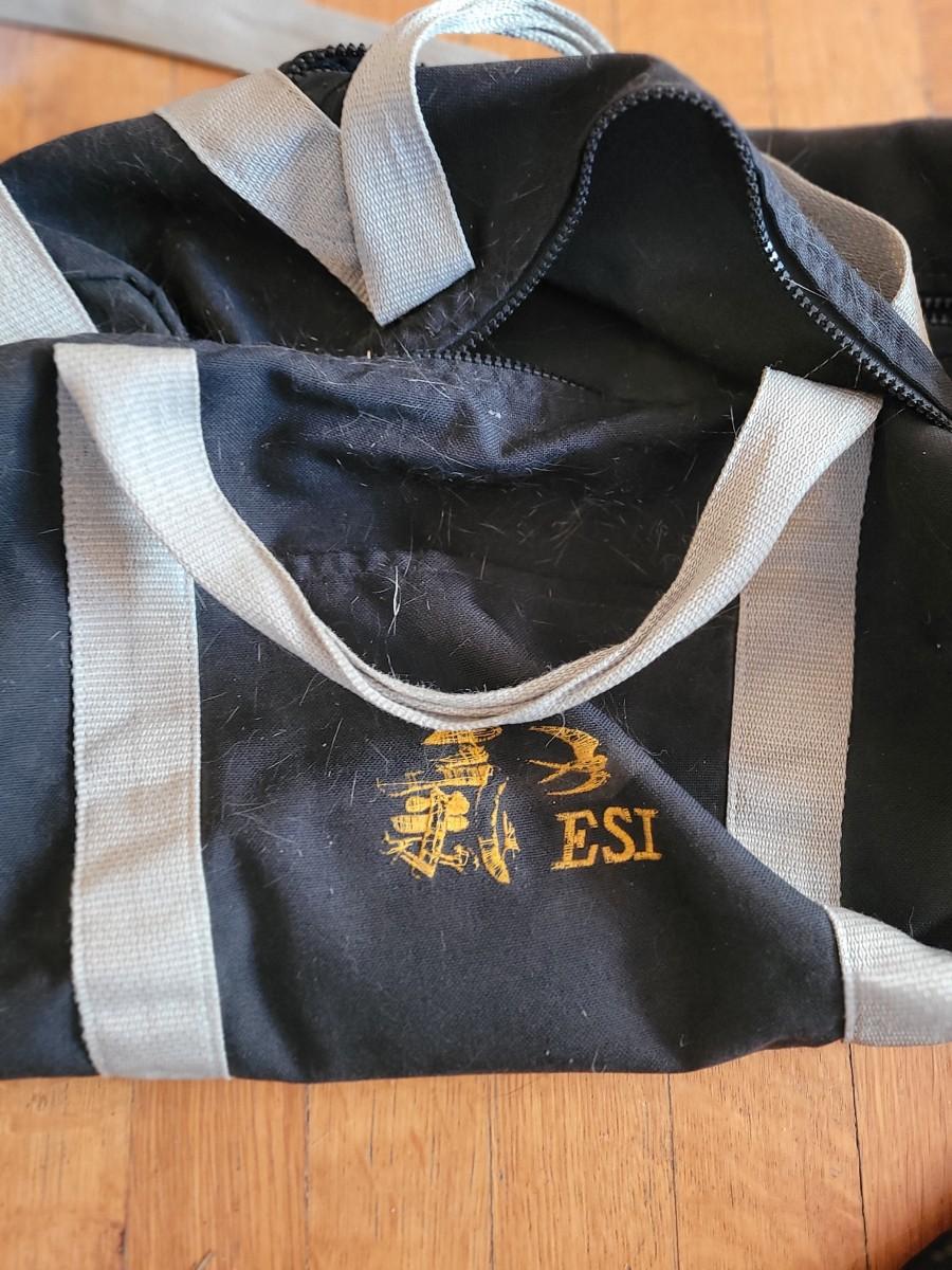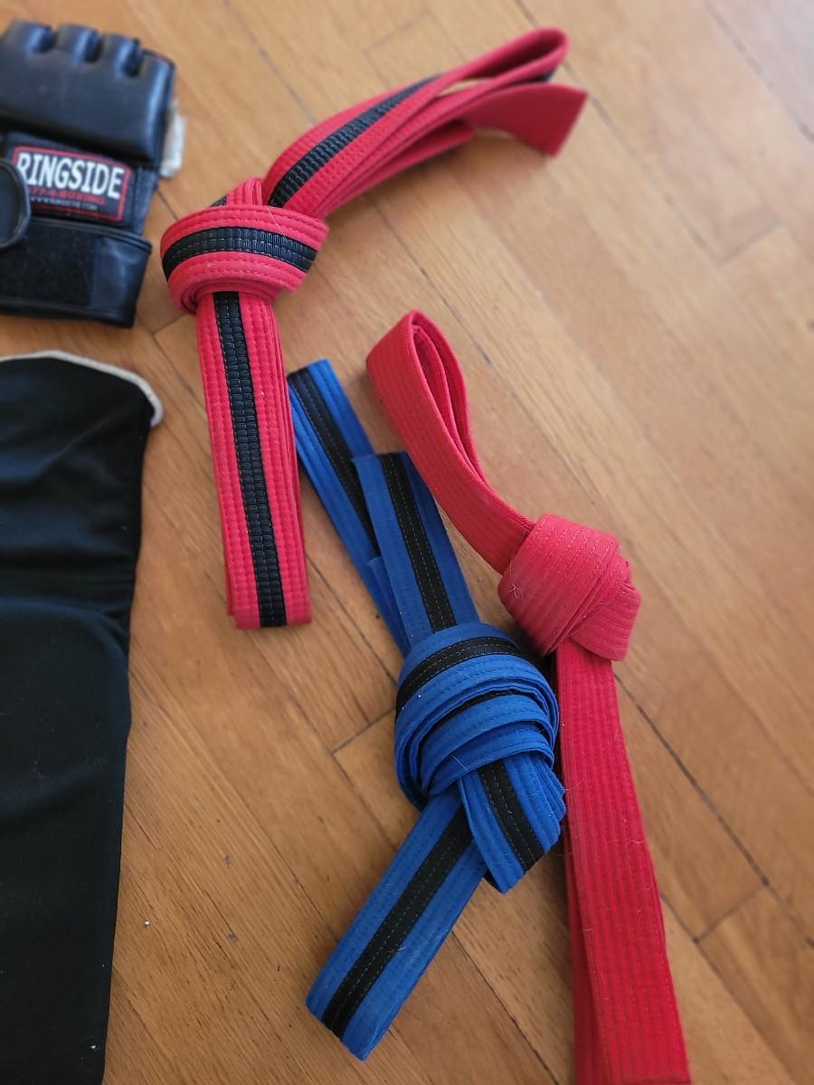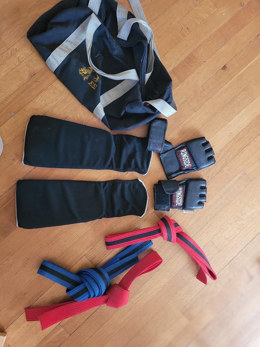 Set up forearm protectors, under glove hand protectors, karate belts in a gym bag