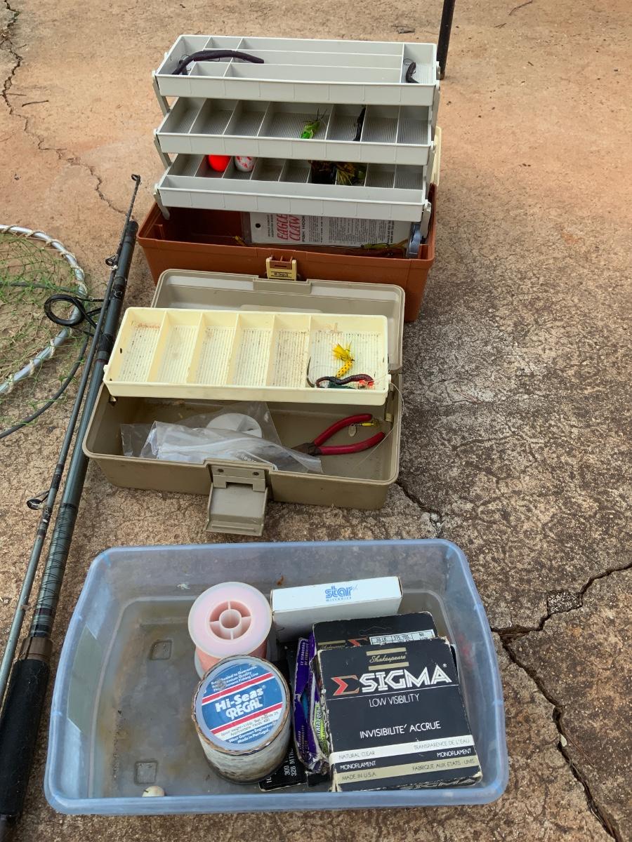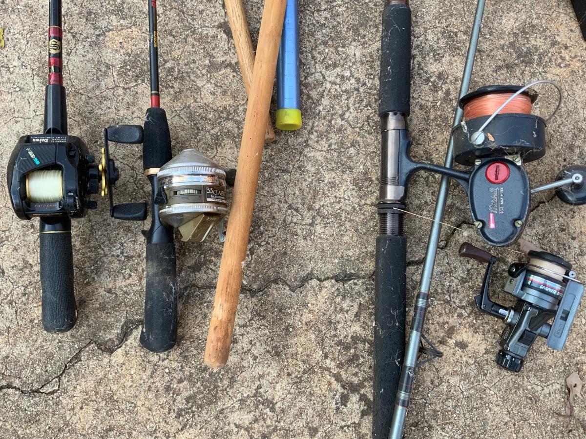 Lot of Fishing equipment including 4 vintage reels and nets.. Diwali Graphite spool SK1350, Daiwa PS215B Hi speed Baitcaster, Zebco 33, Mitchell 402 Salt Water reel.