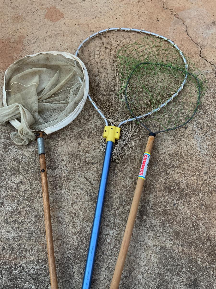 Lot of Fishing Equipment including 4 Vintage Reels and Nets