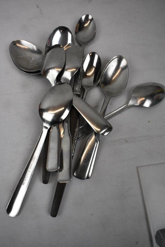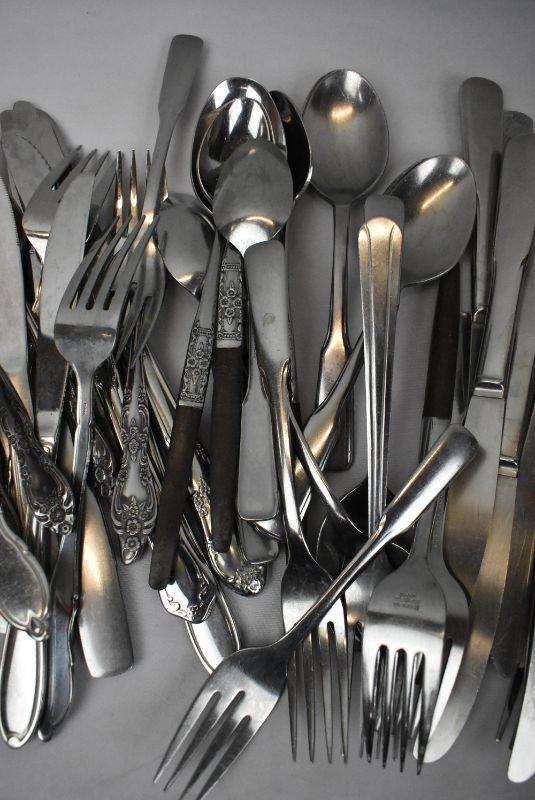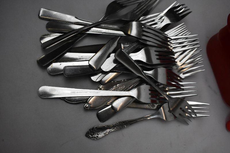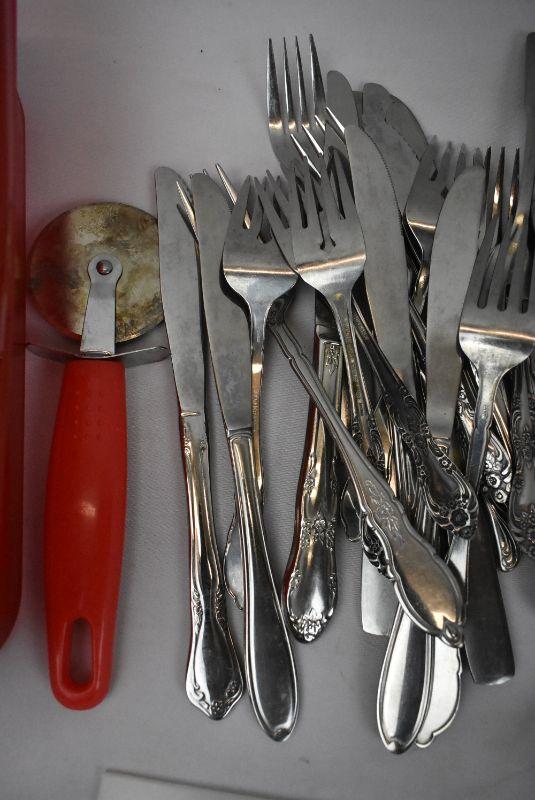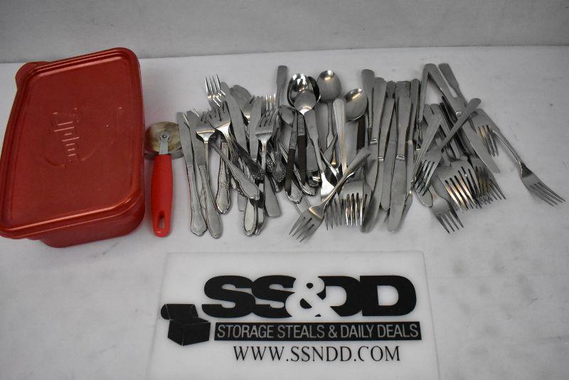 Lot of Flatware in Red Ziploc Tub 27 Forks, 25 Knives, 13 Spoons, 1 pizza cutter