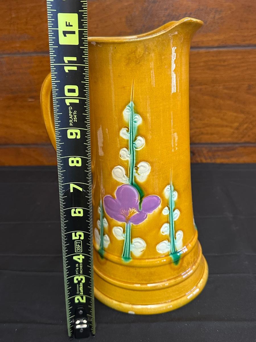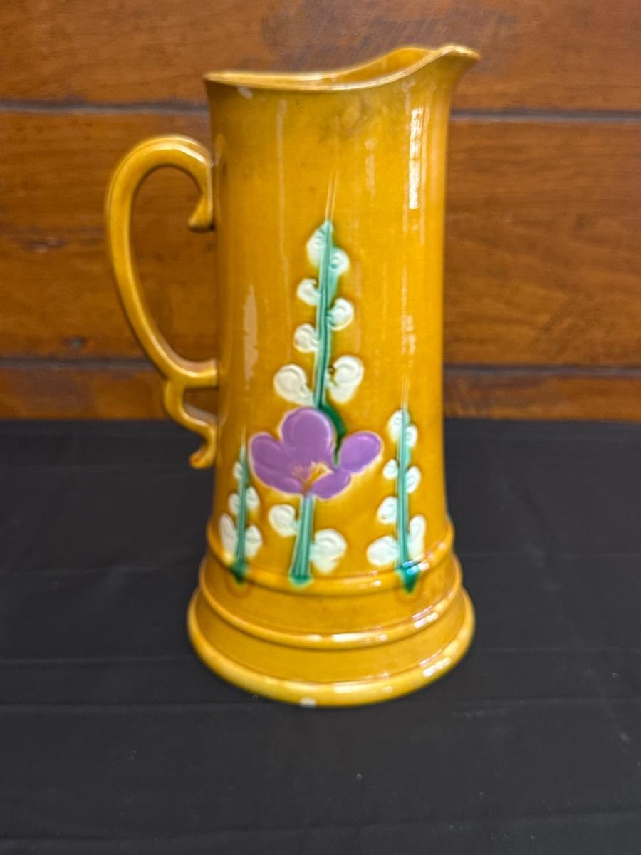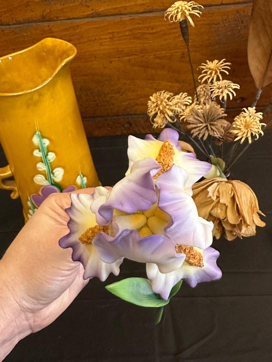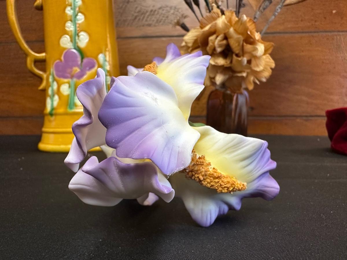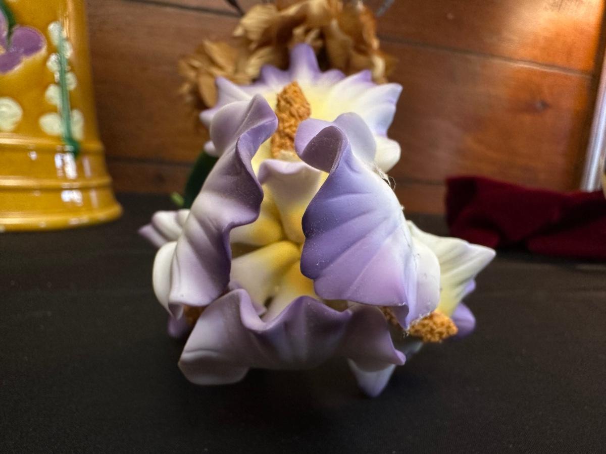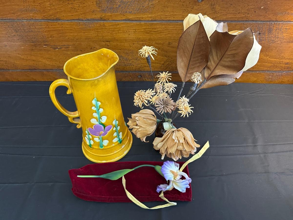Includes a deep yellow pitcher, a porcelain delicate purple flower and a faux flower arrangement