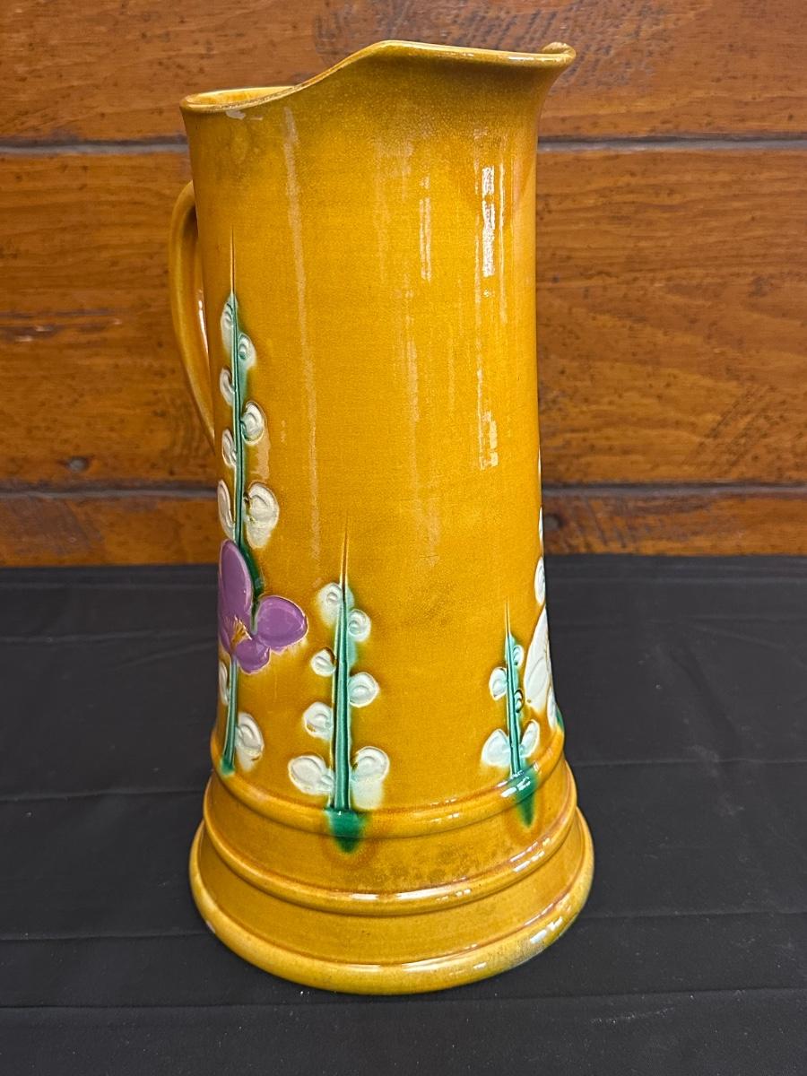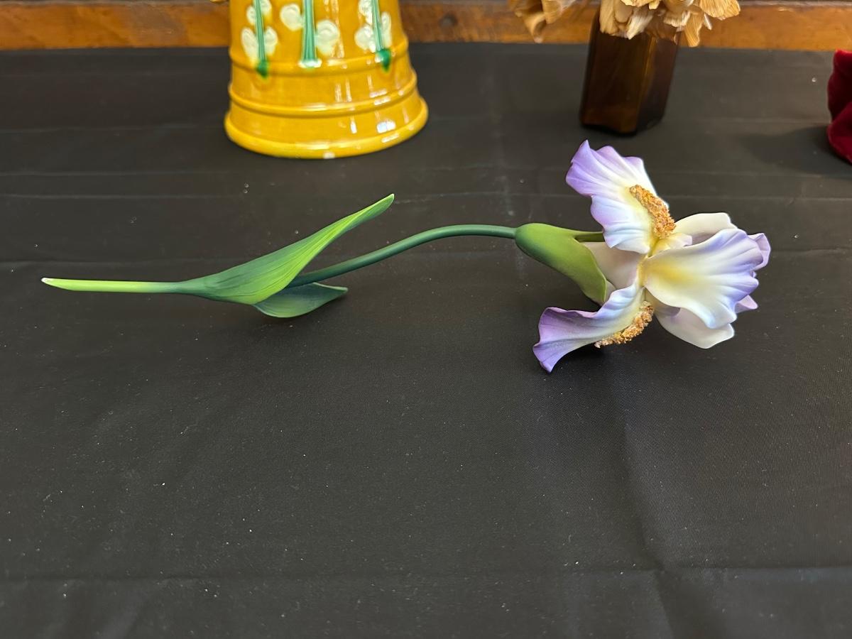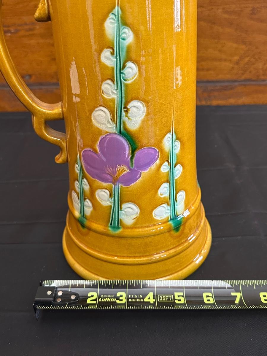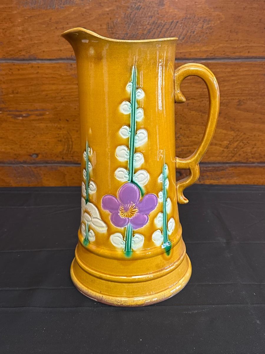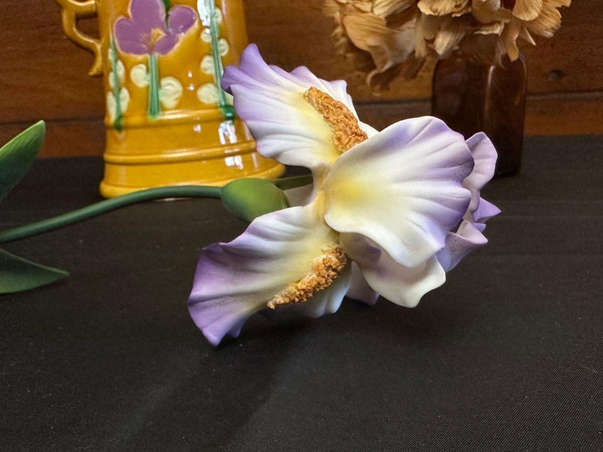 Includes a deep yellow pitcher, a porcelain delicate purple flower and a faux flower arrangement