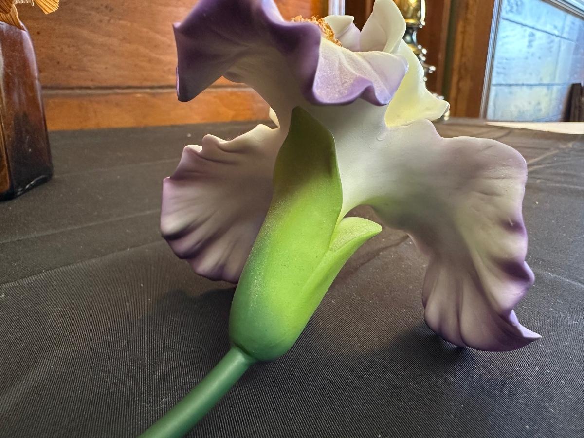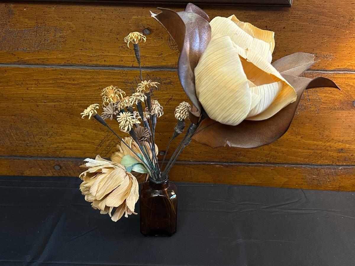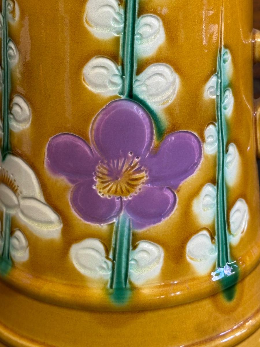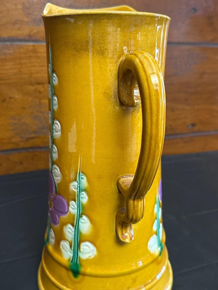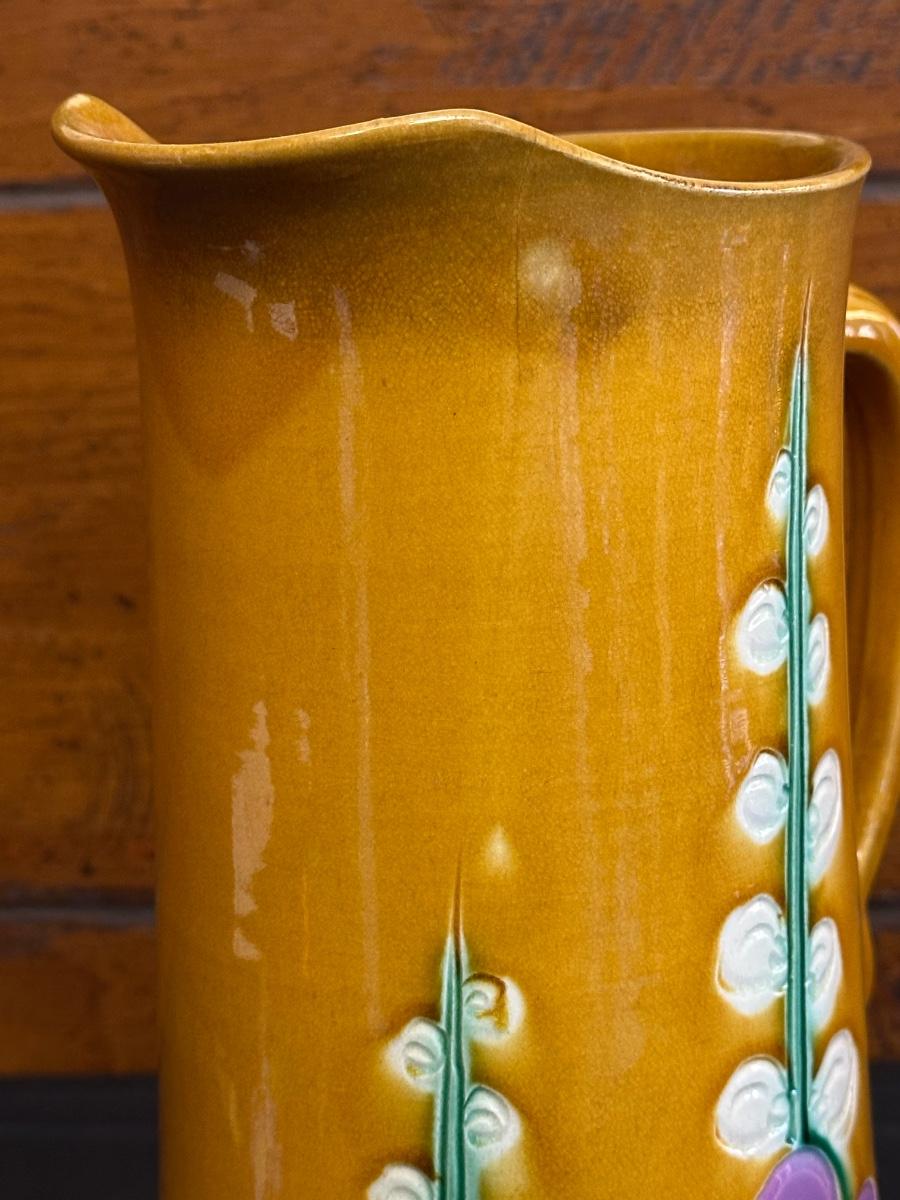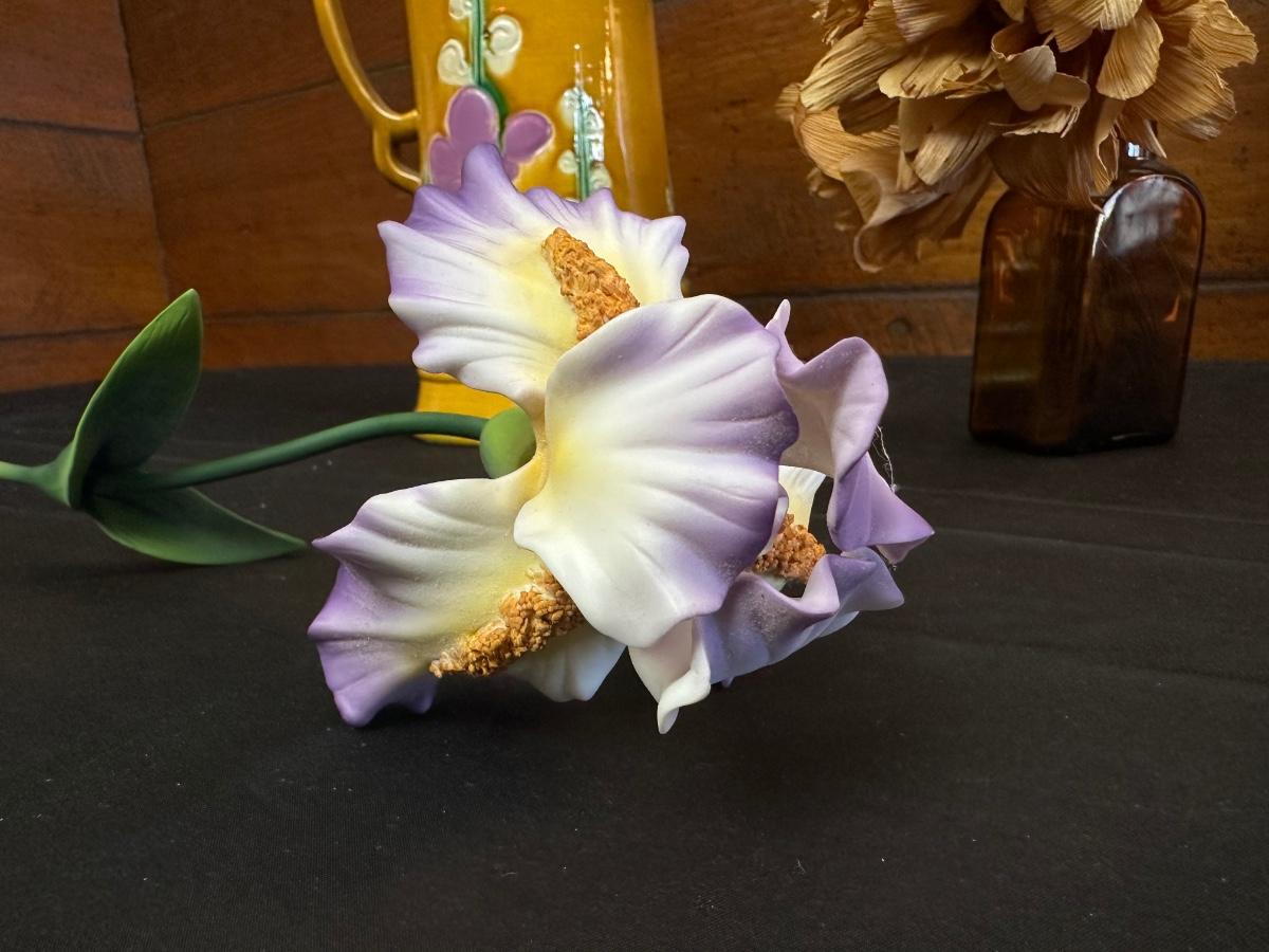 Includes a deep yellow pitcher, a porcelain delicate purple flower and a faux flower arrangement