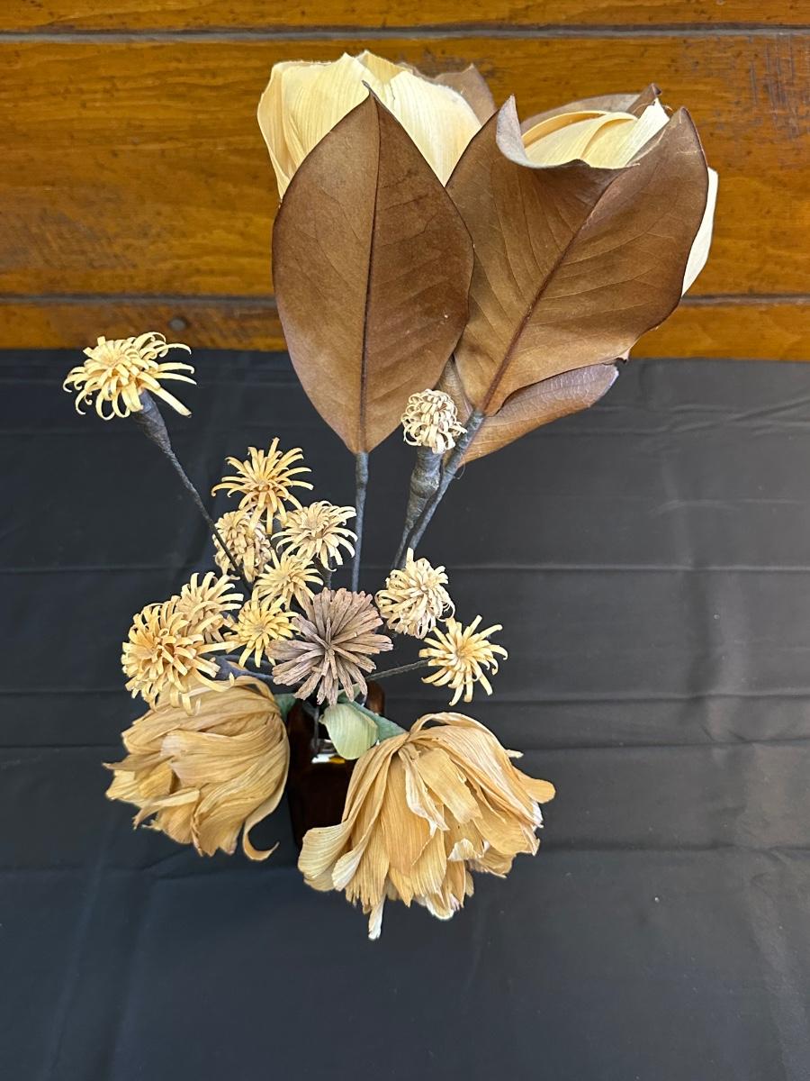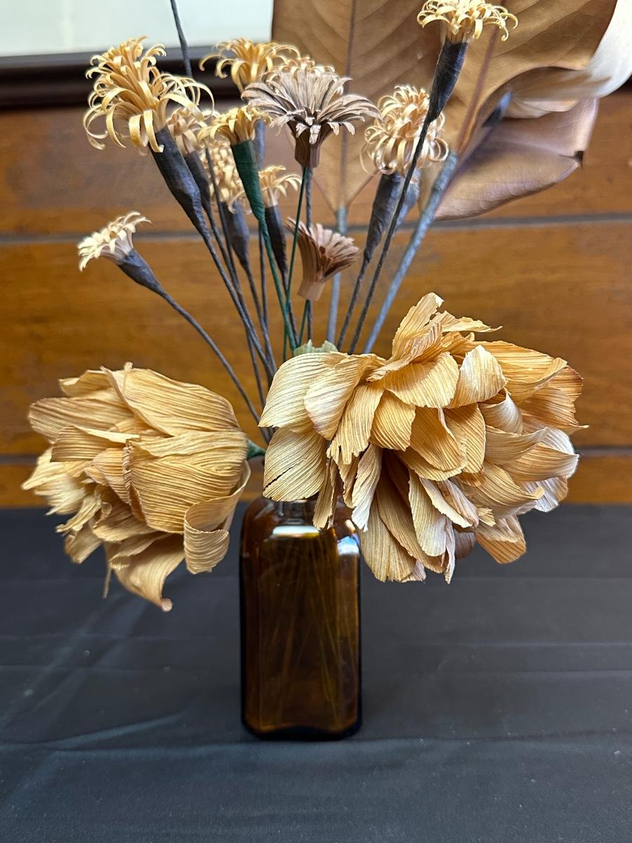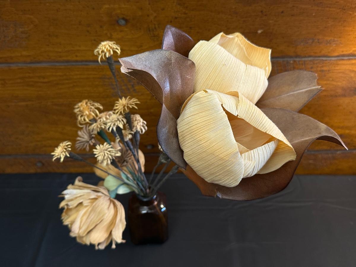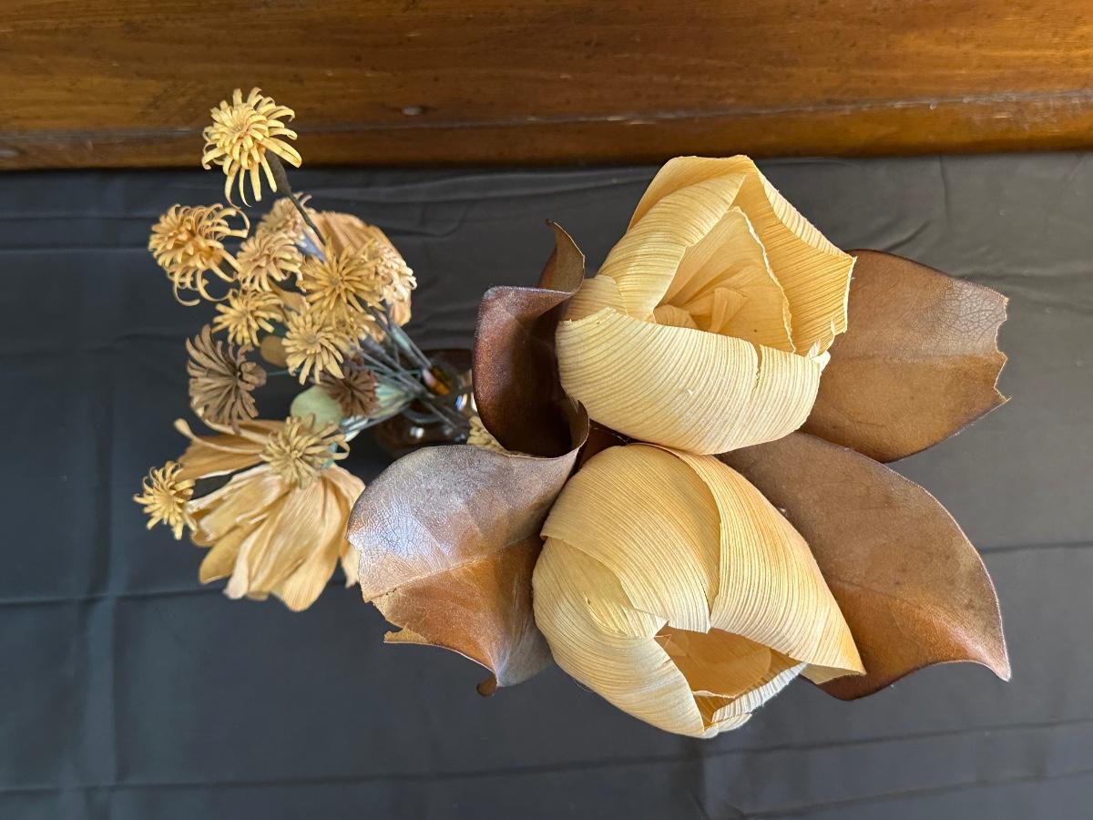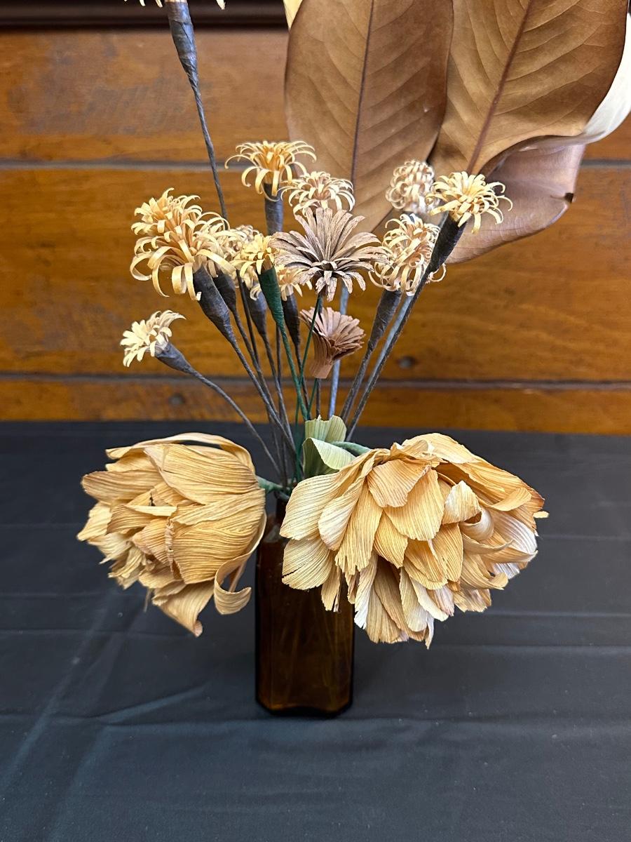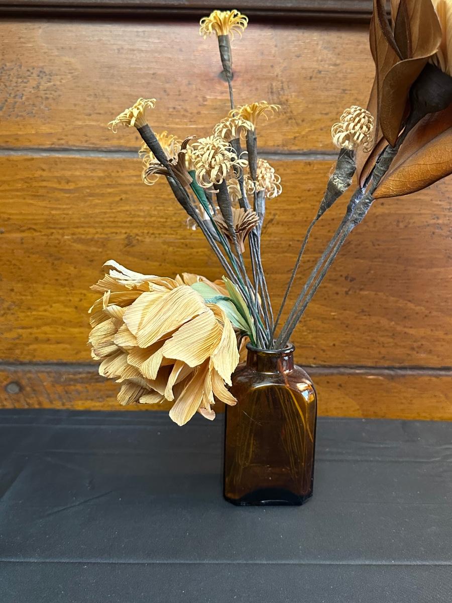 Includes a deep yellow pitcher, a porcelain delicate purple flower and a faux flower arrangement
