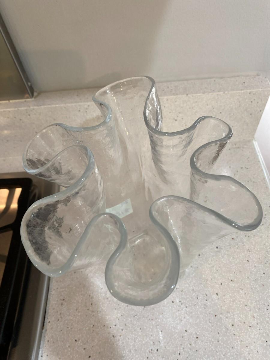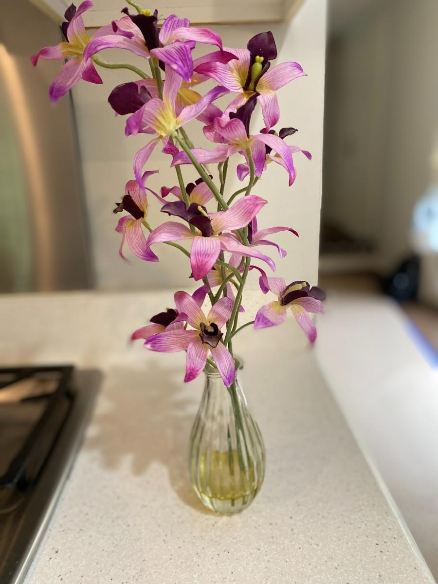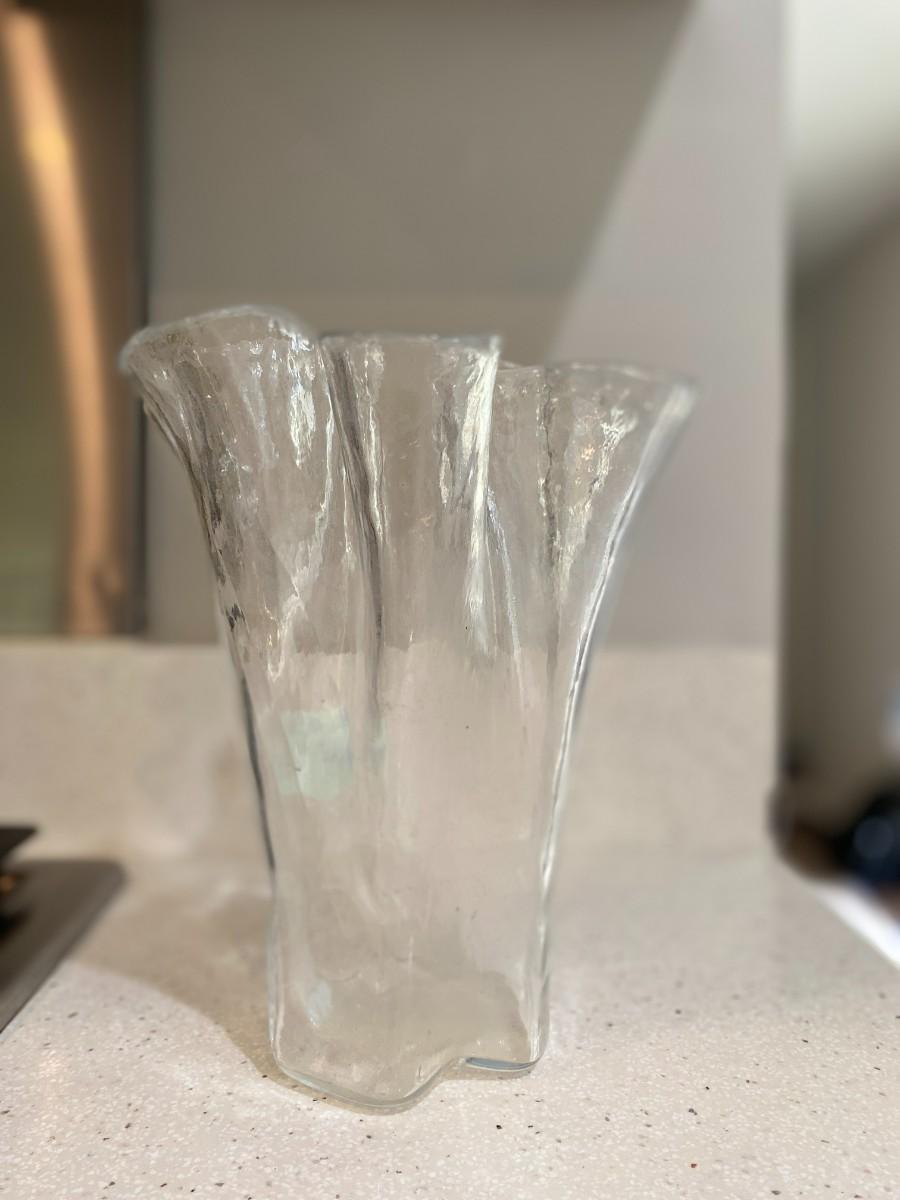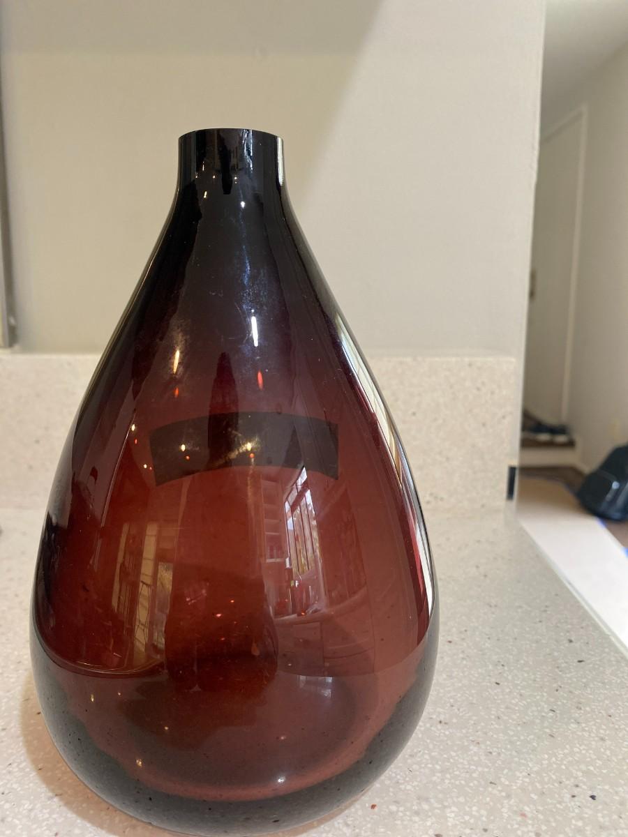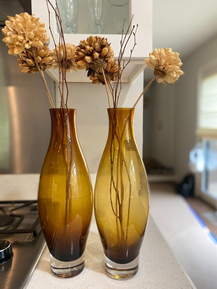 2 sets of amber. 2 clear glass and on 1 red glass vases included. Some come with faux flowers. Shapes and sizes vary. Tallest vase measures 13"h.