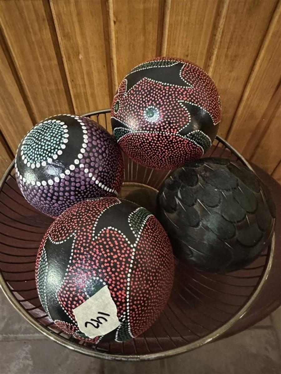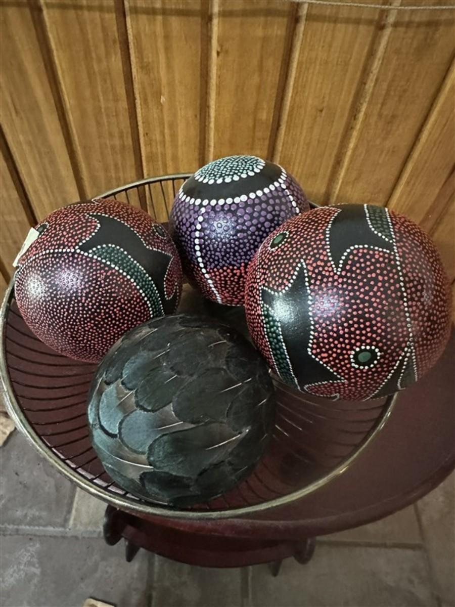142 Lot of Four Designer Decorative Balls with Silver-plate Bowl
