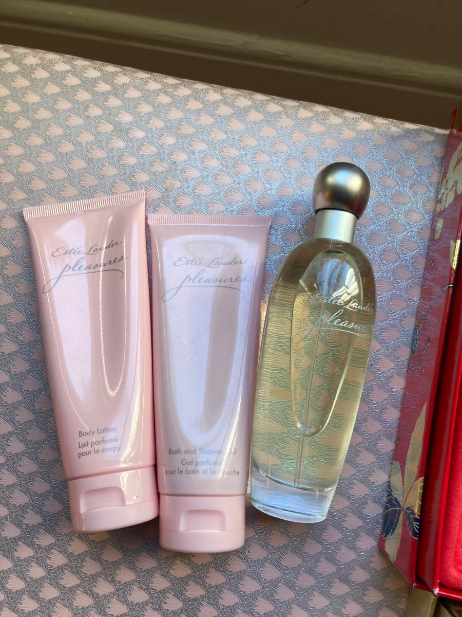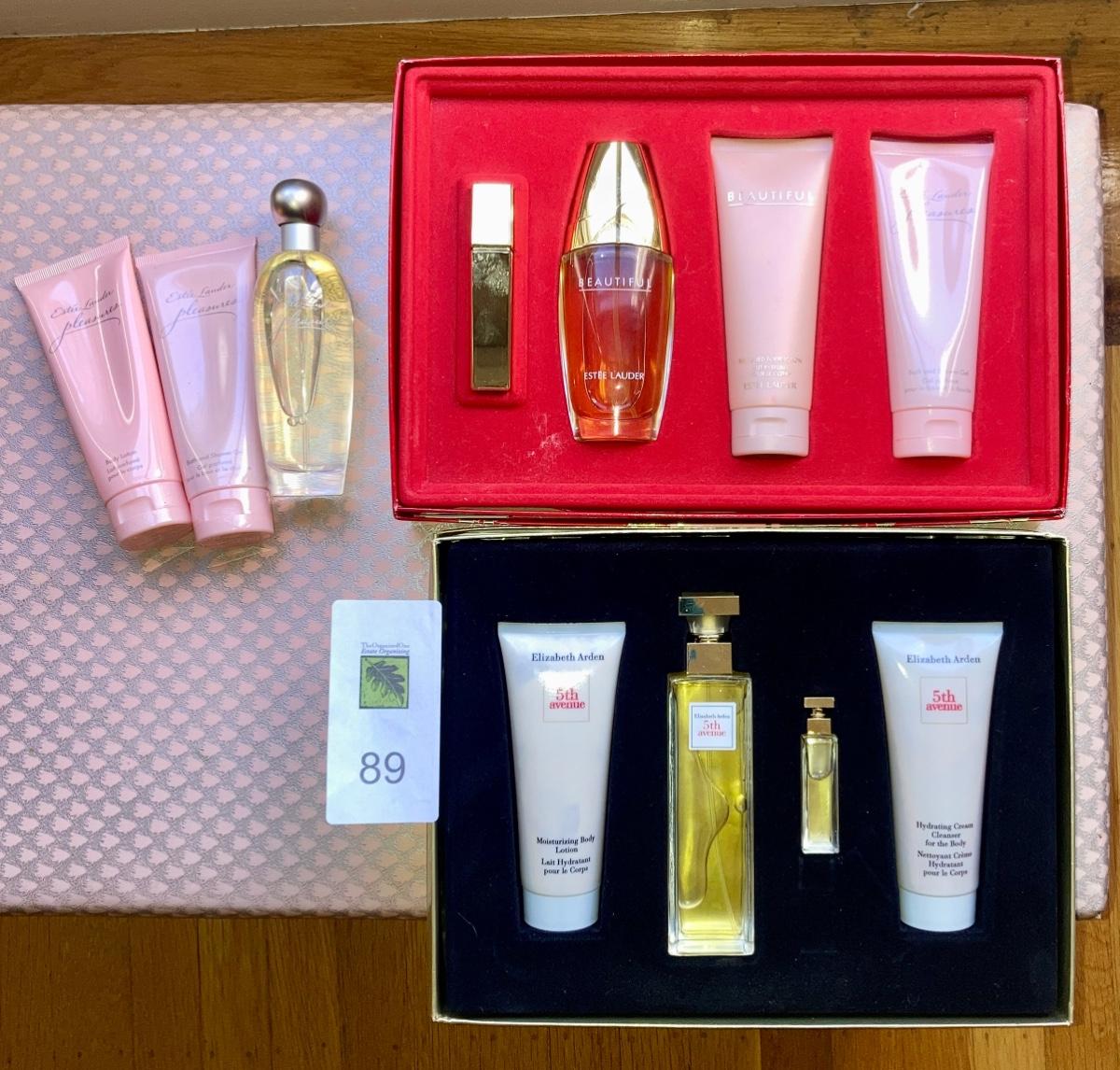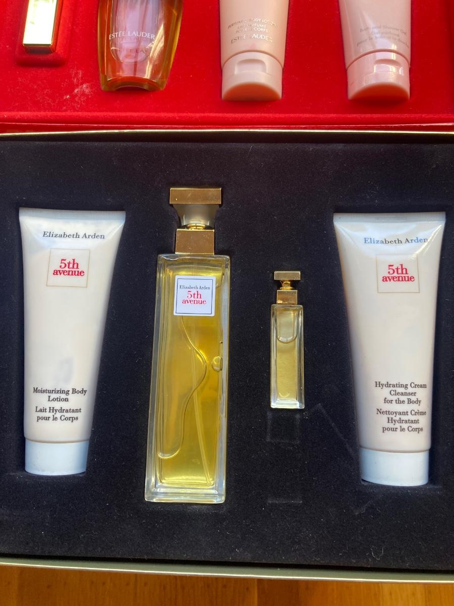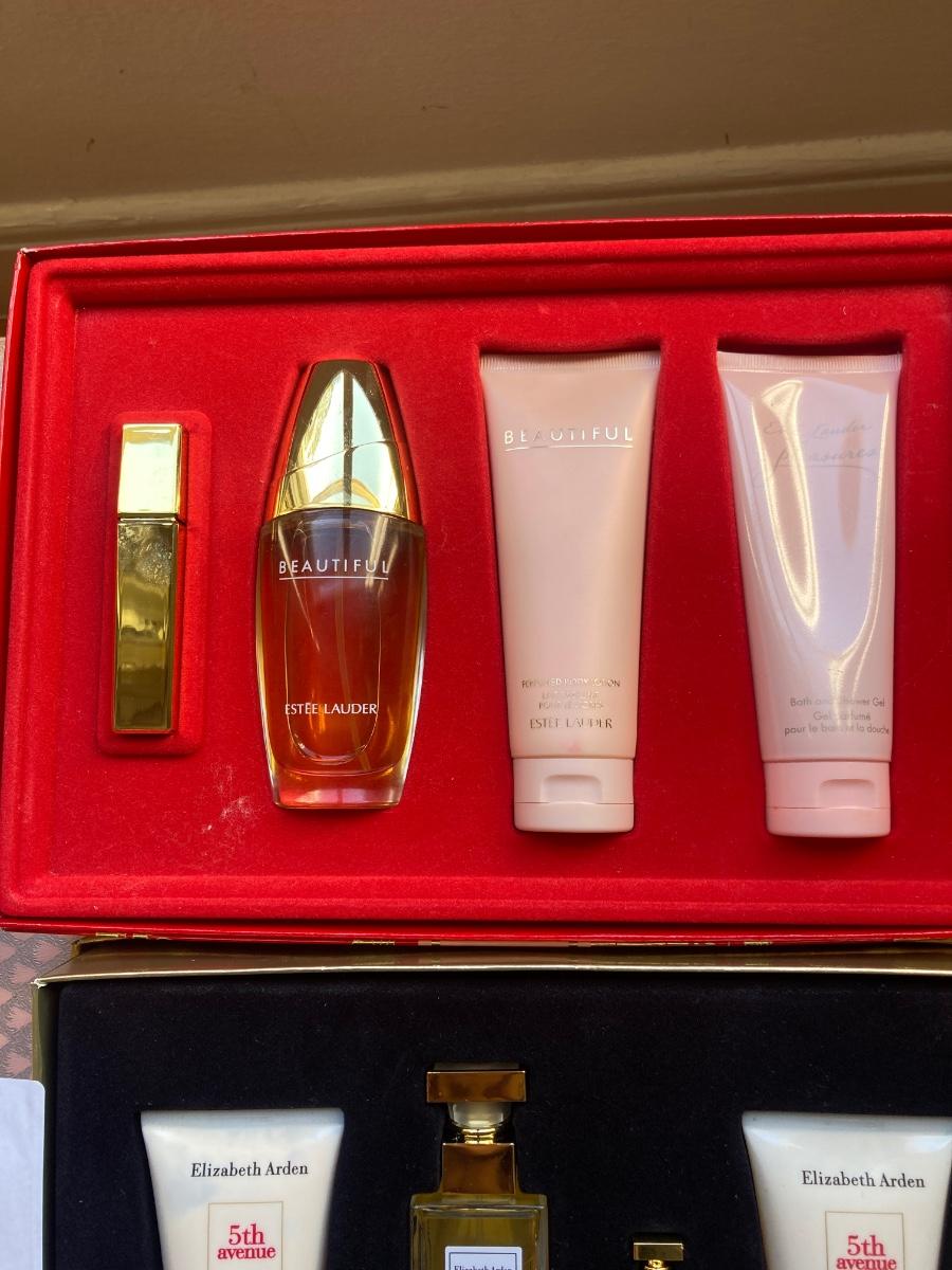 Vintage Estee Lauder Beautiful and Pleasure fragrance set including body lotion and shower gel. Along with Elizabeth Arden’s 5th Avenue fragrance set.
