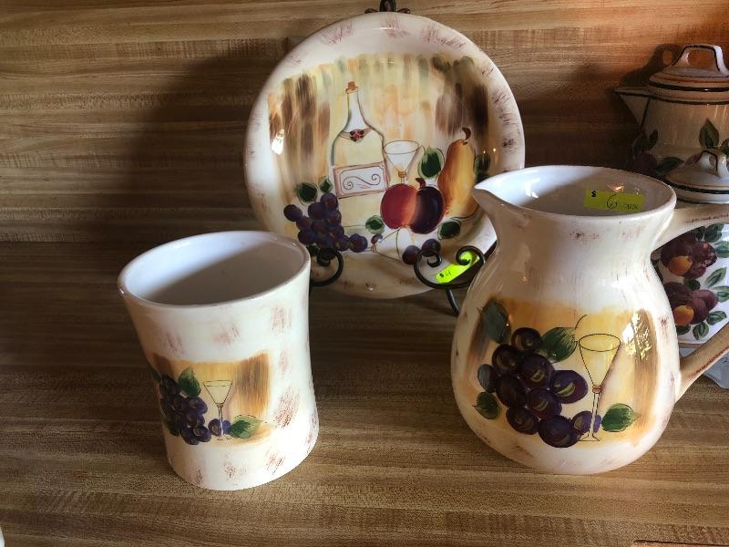 Lot of fruit decorated decor: Pitcher, Plate, Canister