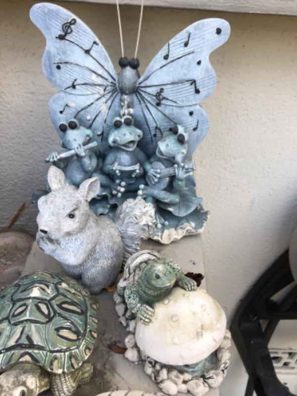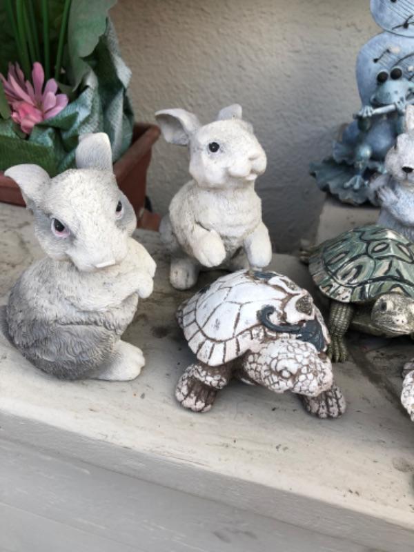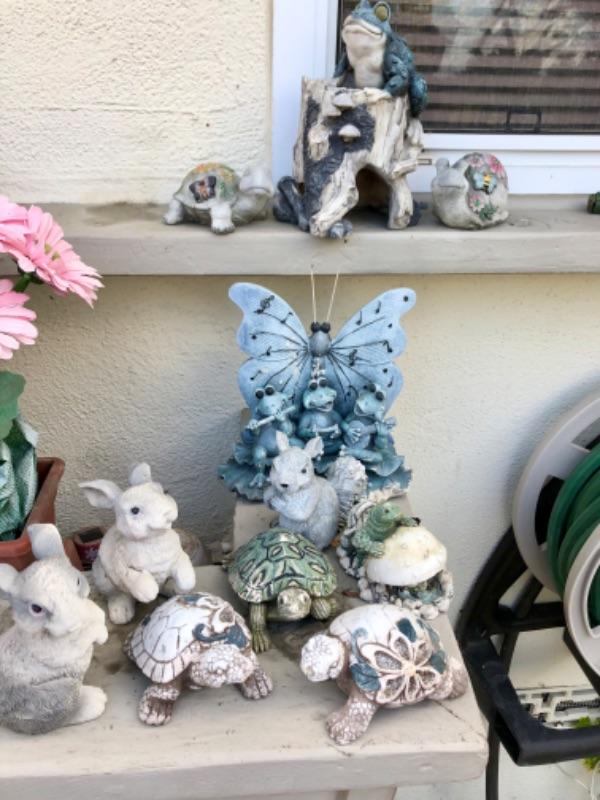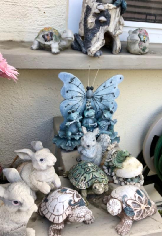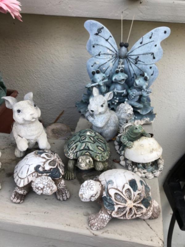 7 garden animals - rabbits, turtles, frogs and butterfly. In fair cod ion, need cleaning and they’re sun faded a bit.
