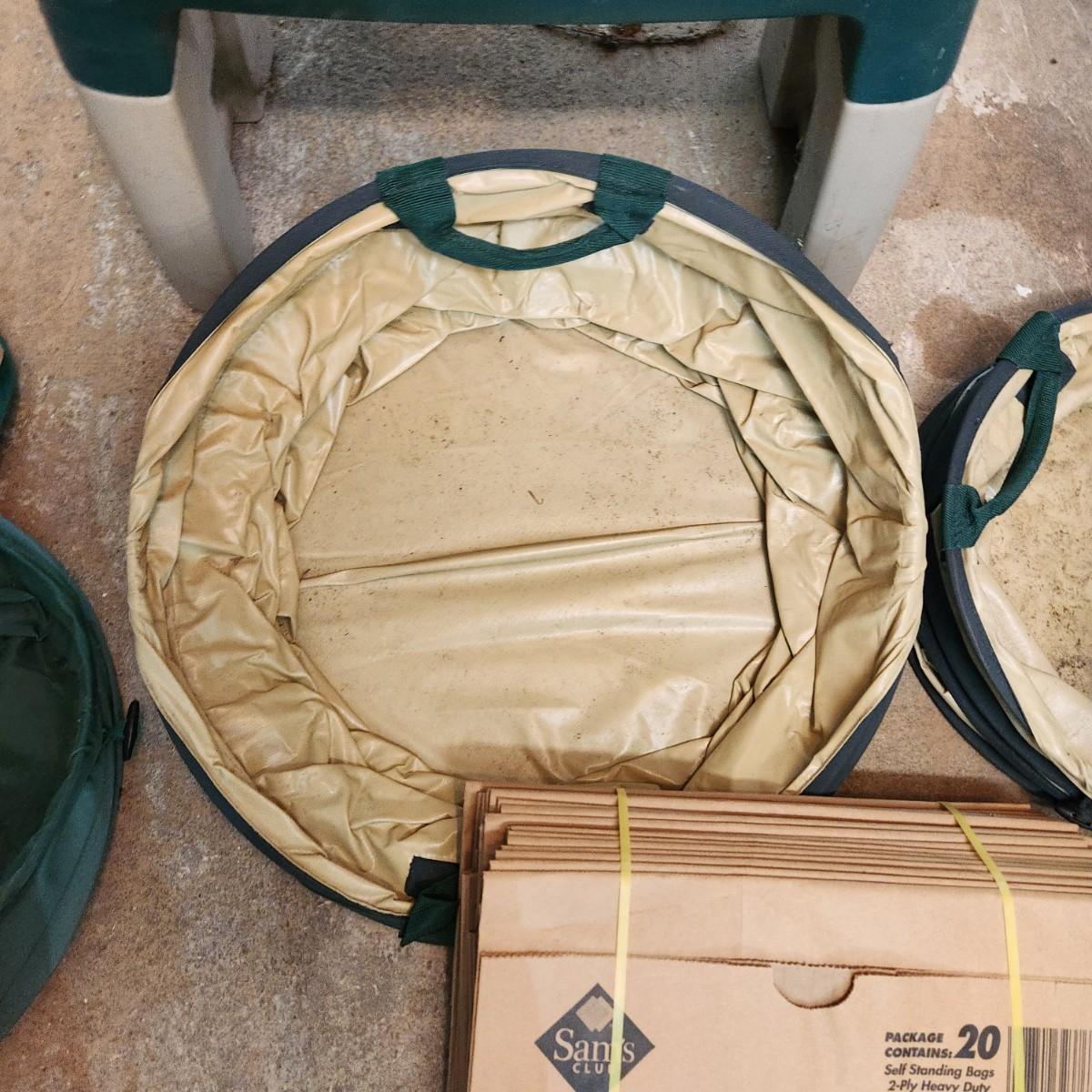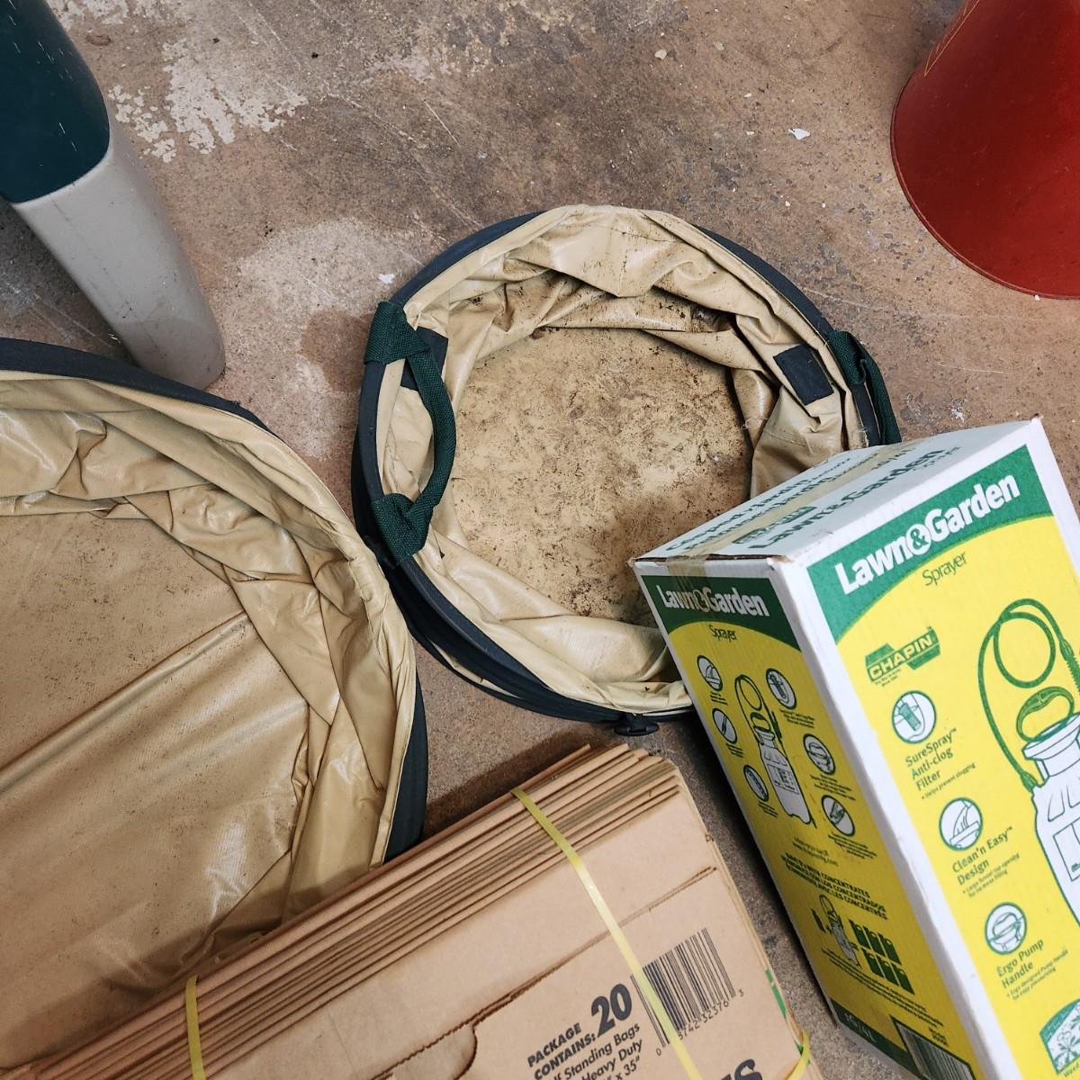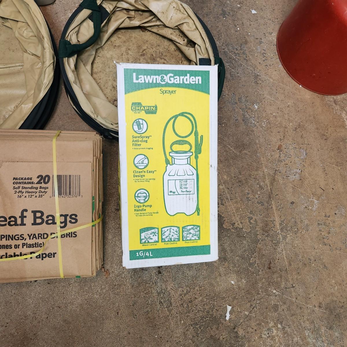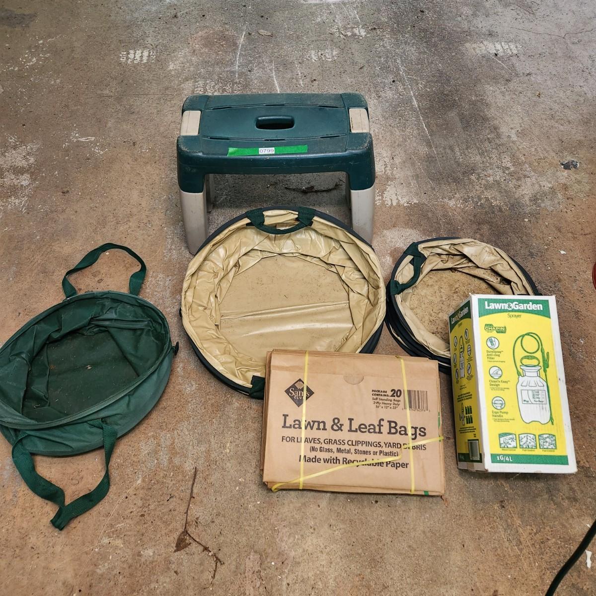 Lot of Garden Supplies , Work Stool, Lawn bags, Leaf Totes, Lawn Sprayer