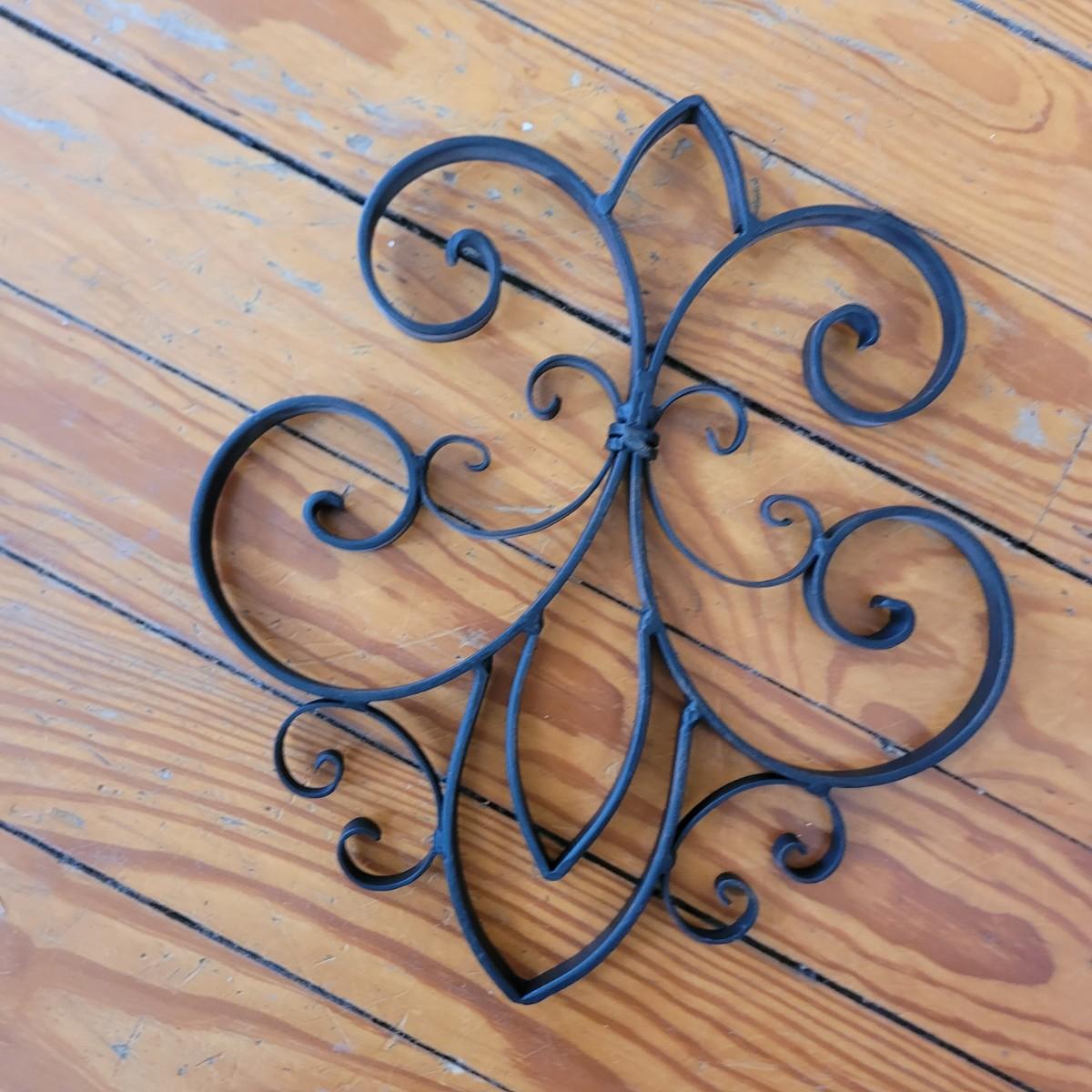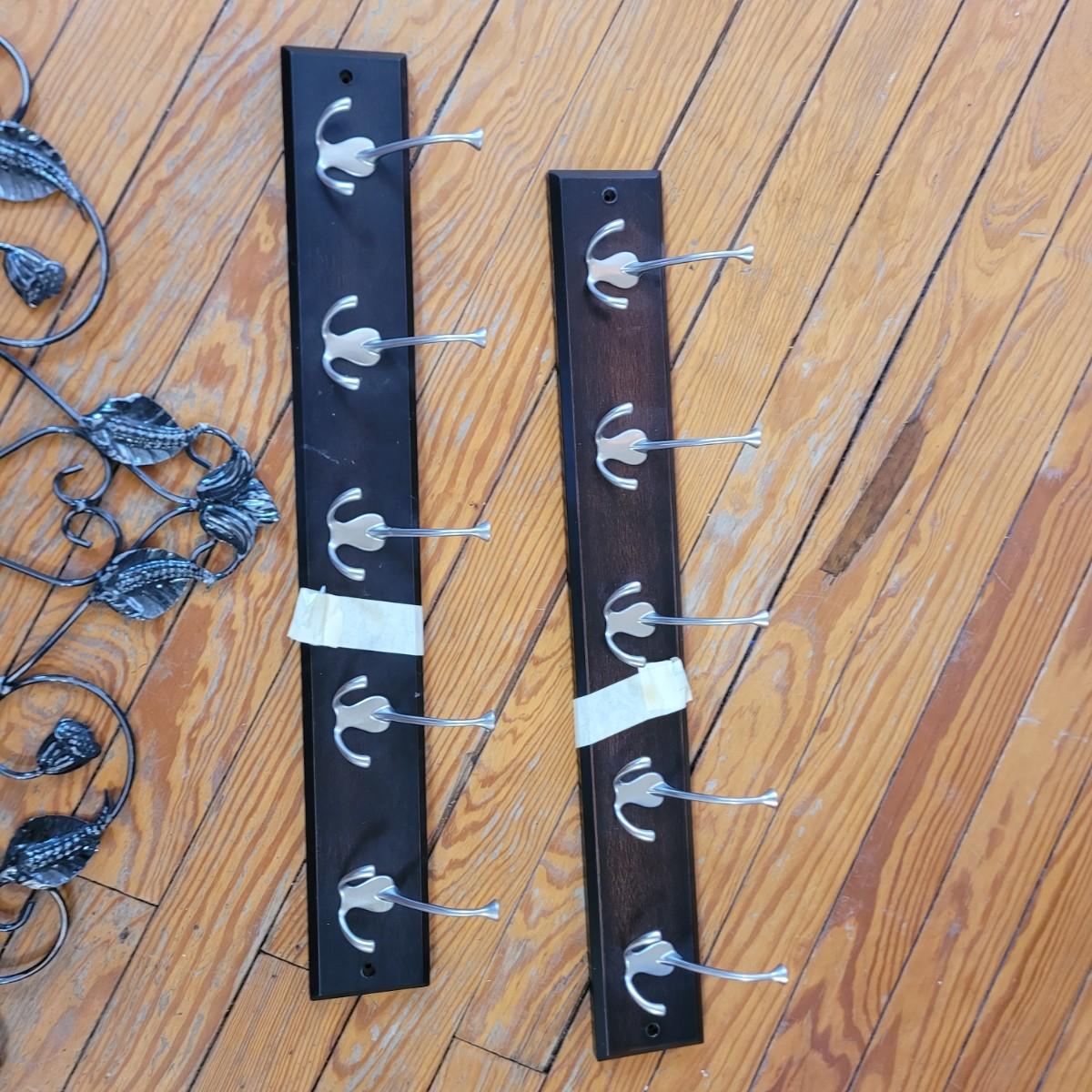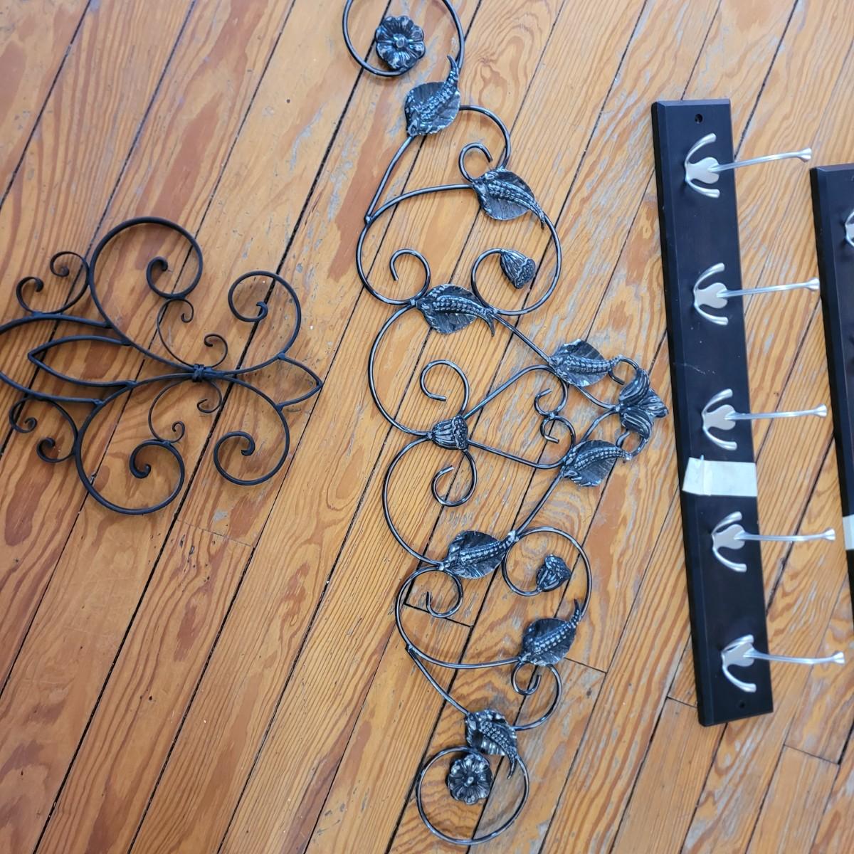 Coat hangers have hardware, wall deco is iron
