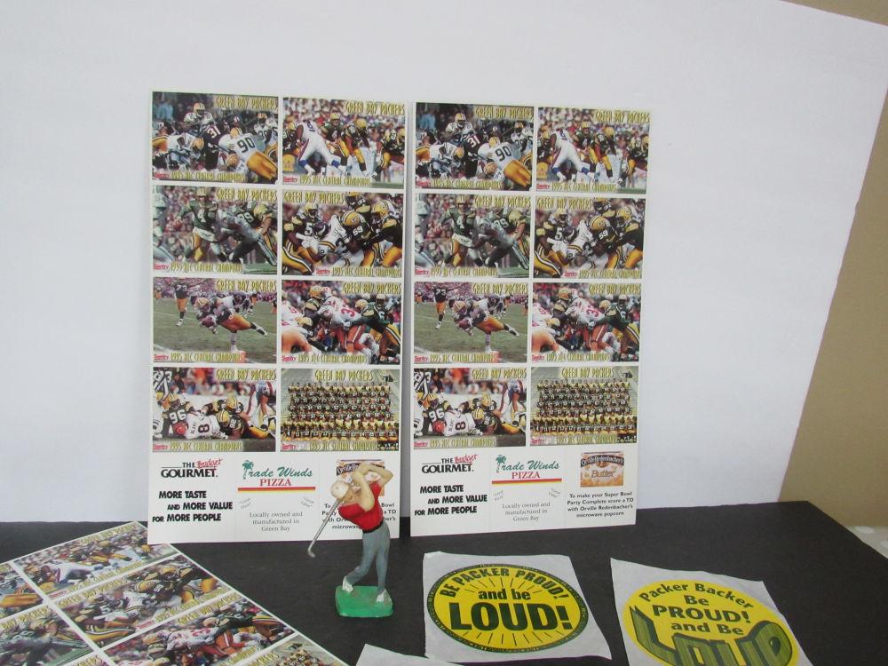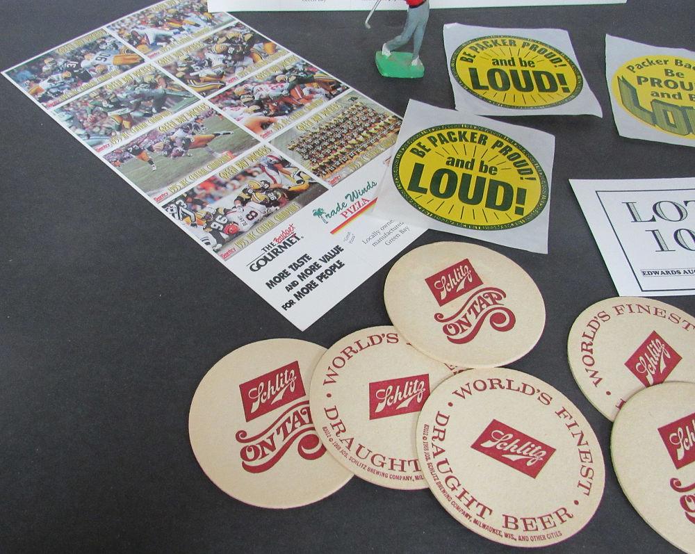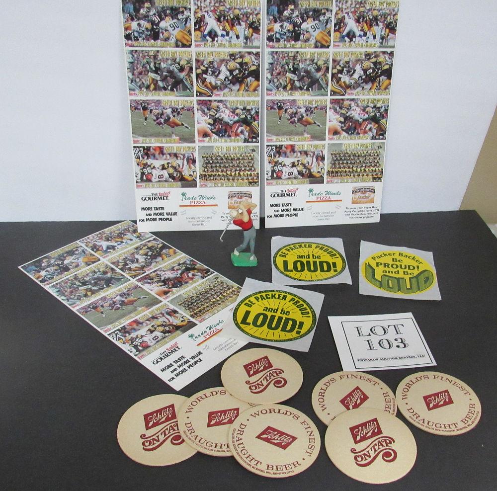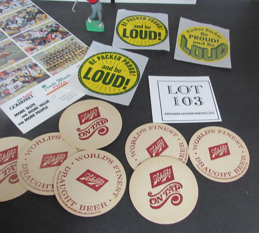 Lot of GB Packers Cards (all the same), Stickers, and Schlitz Coasters