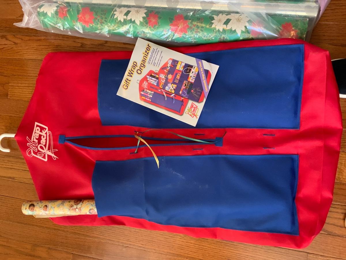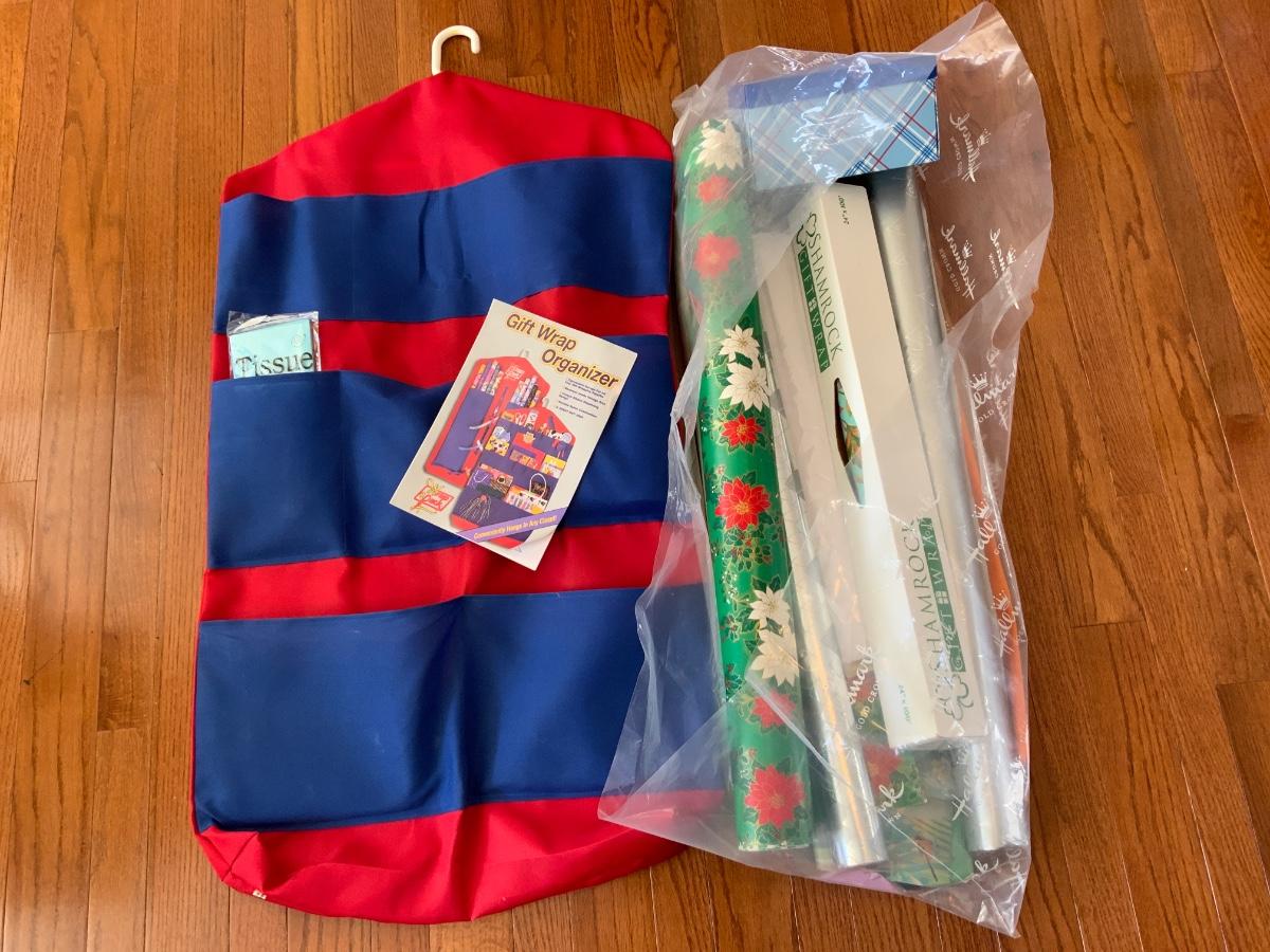 Lot of Gift wrap and a gift wrap organizer. Includes a set of 4 gift nesting gift boxes. Some rolls of paper are vintage.