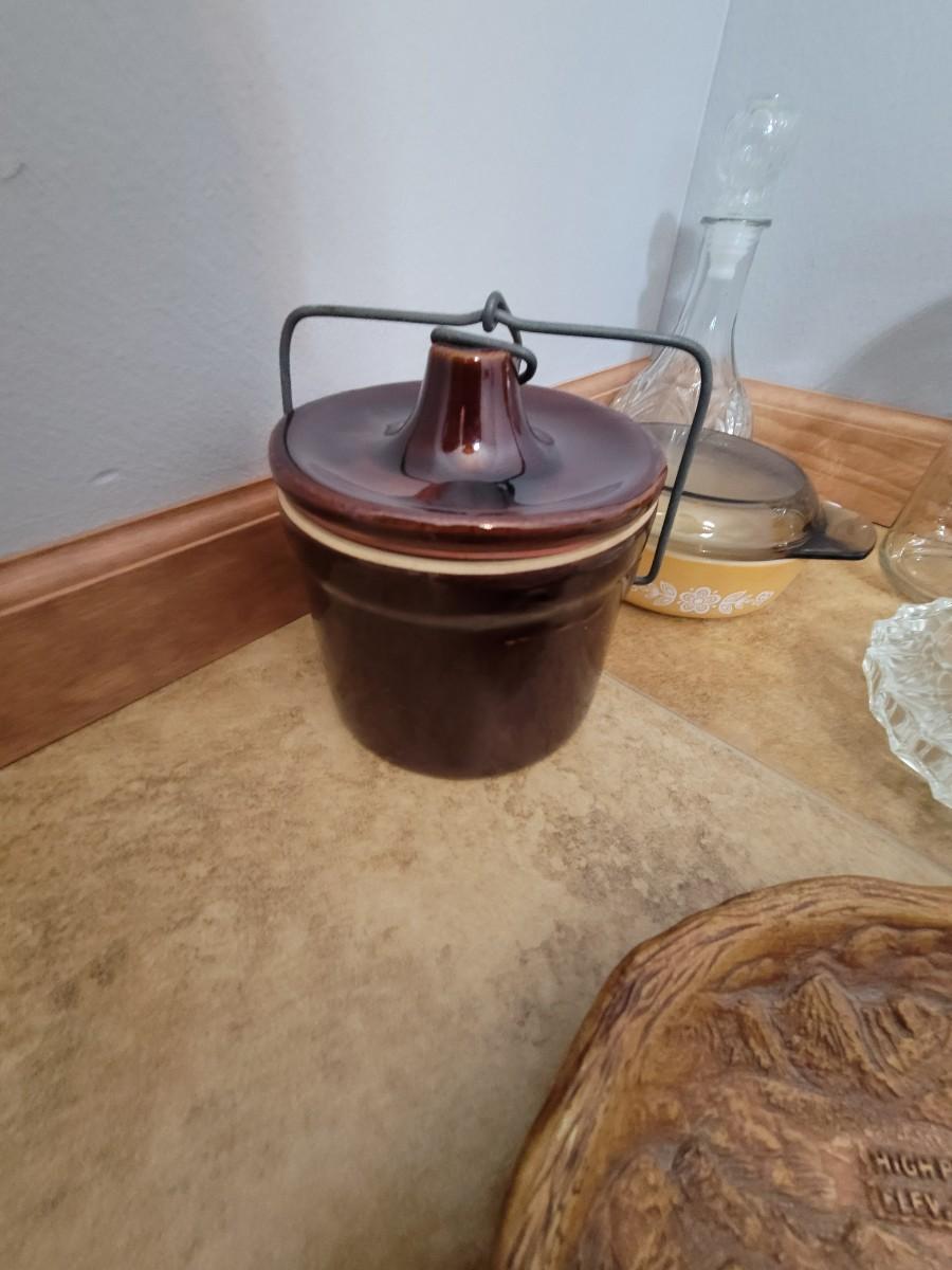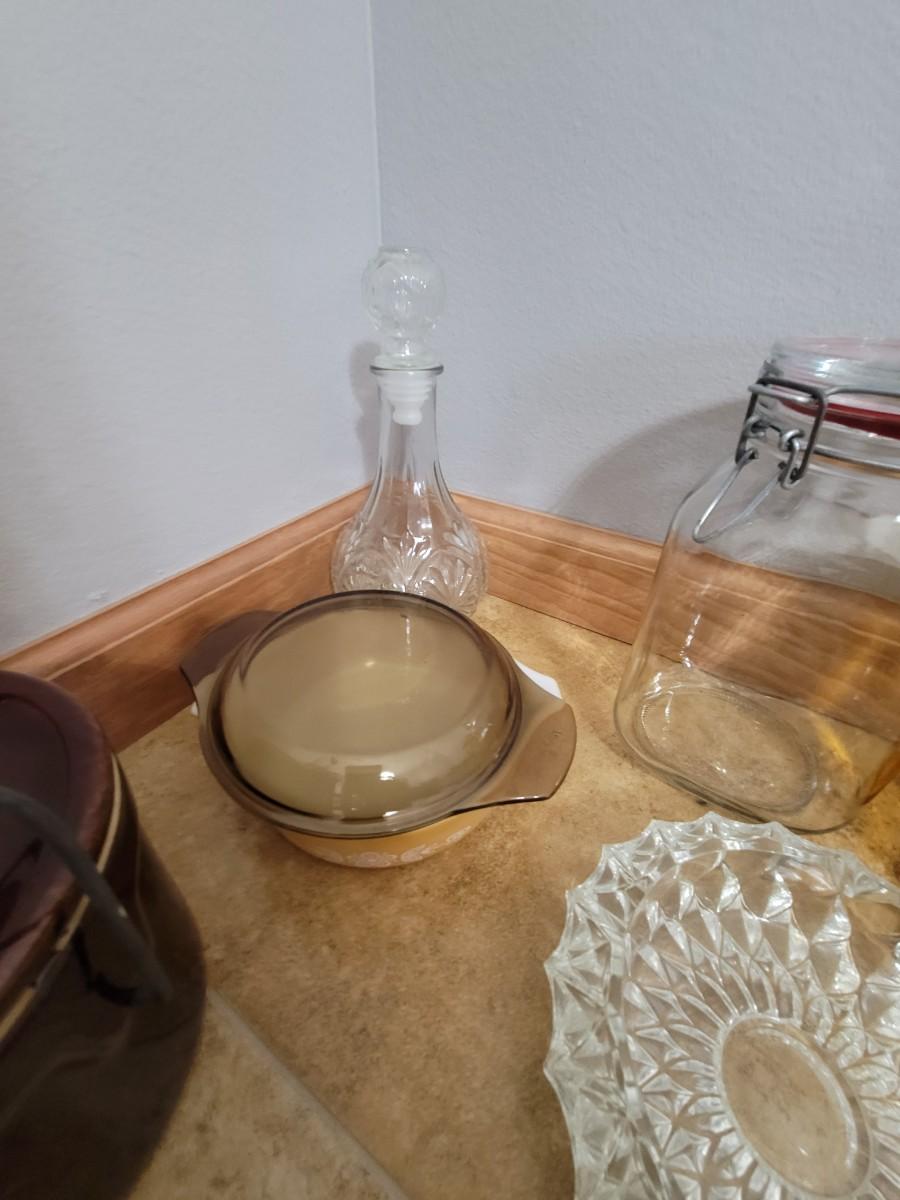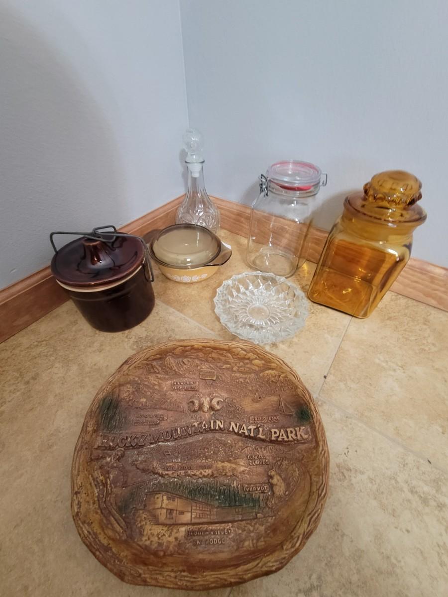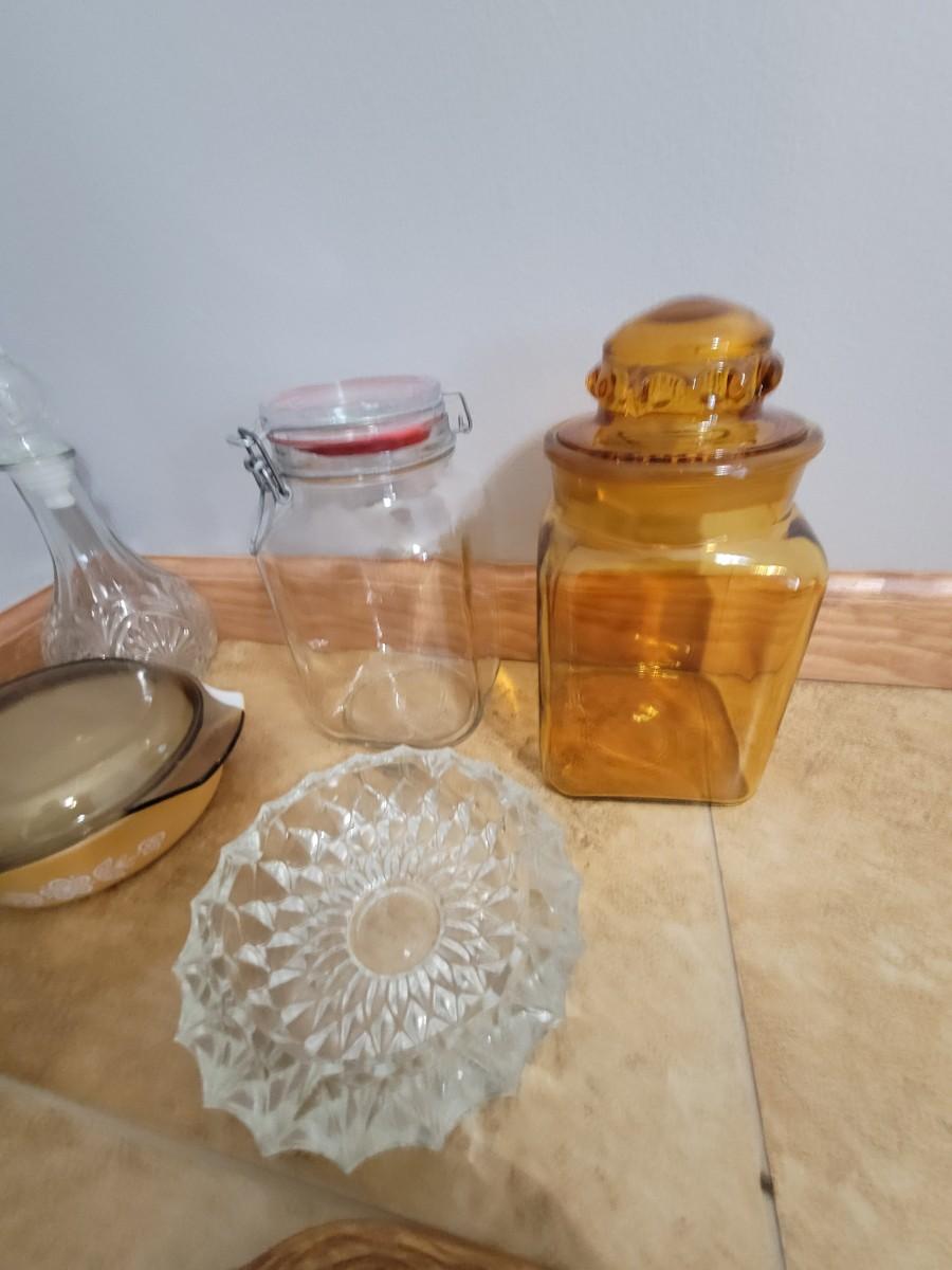 Pyrex dish, butter crock, vintage ashtray, 1 decanter, 2 glass storage jars with lids.