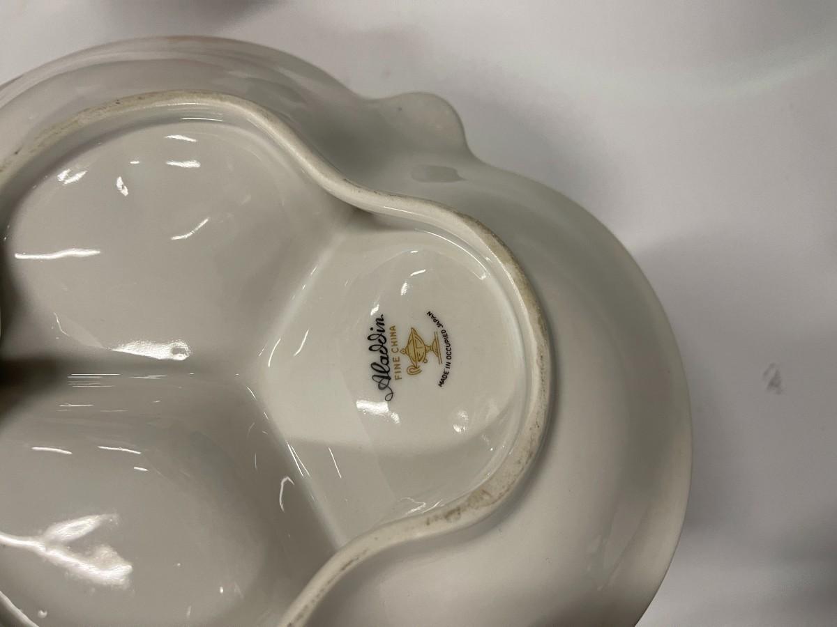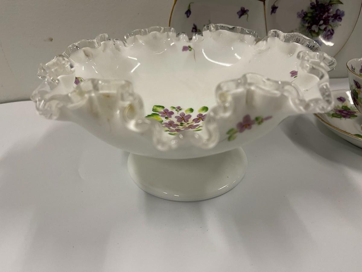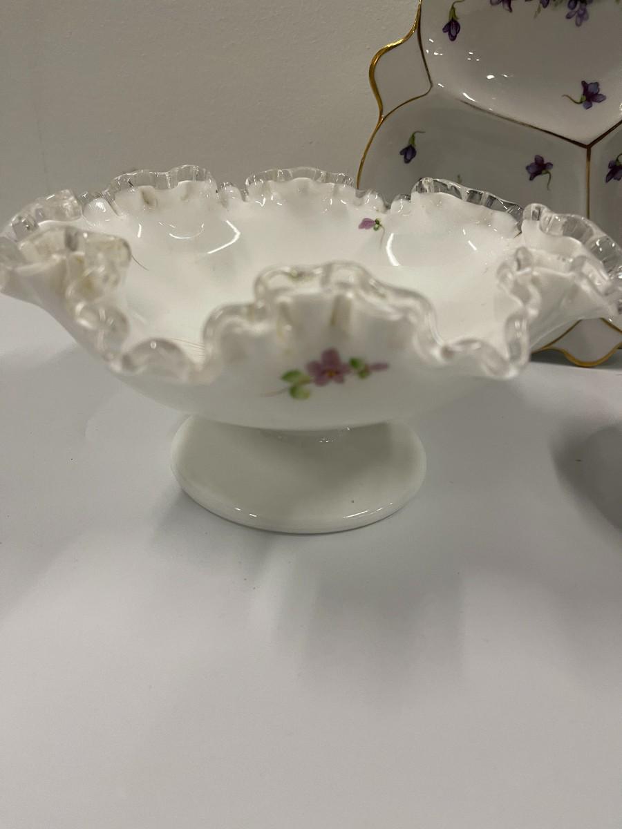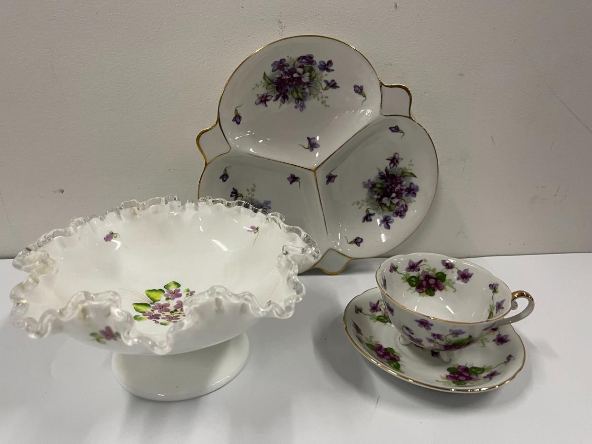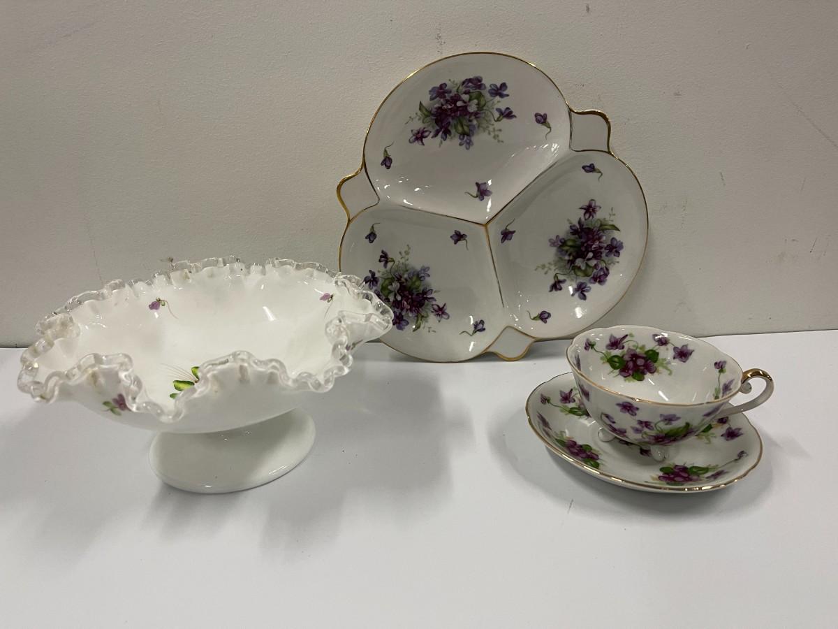 Includes Aladin porcelain divided dish, Lefton china cup & saucer & hand painted Fenton Silver Crest footed bowl. All in excellent condition.