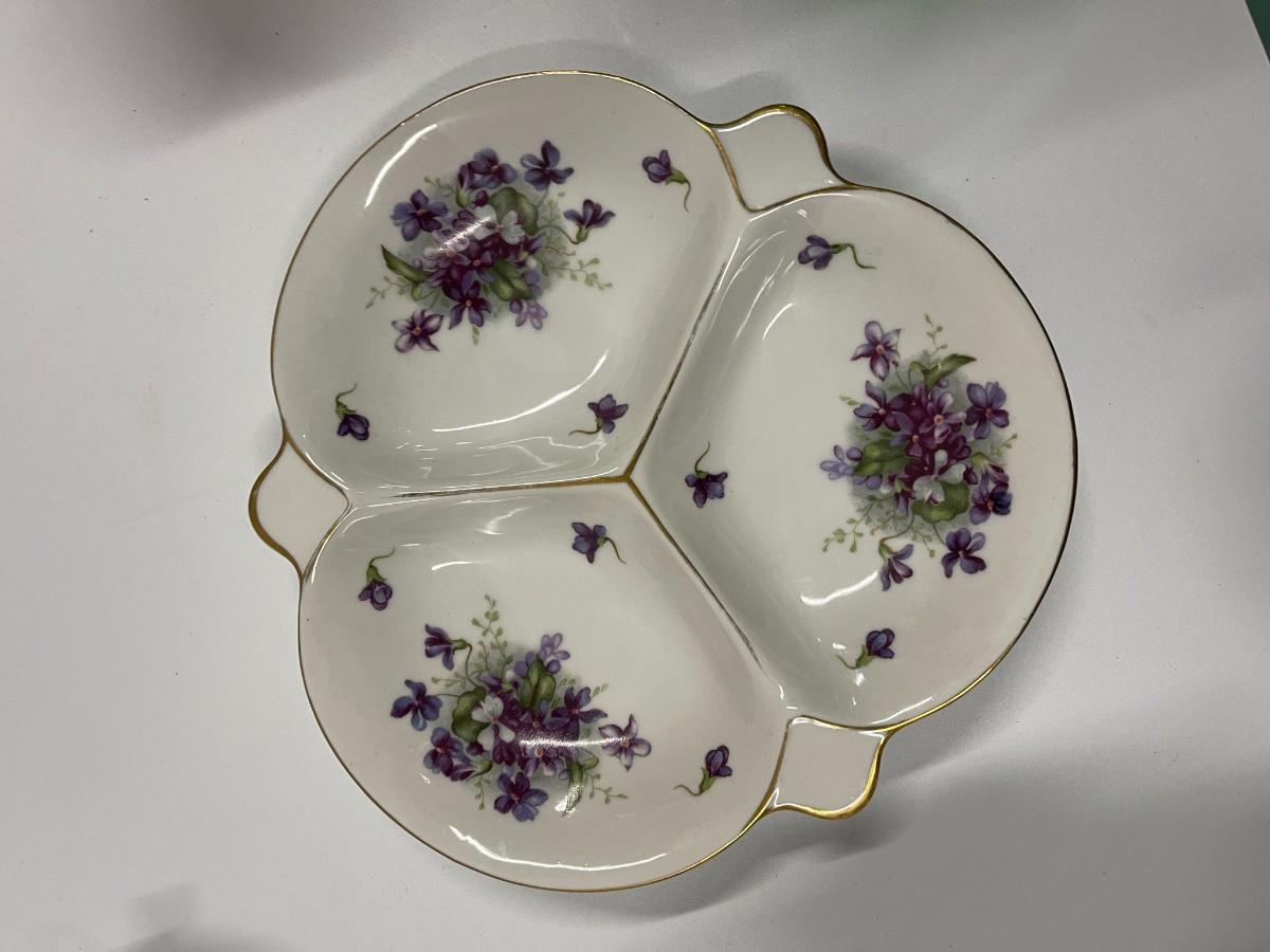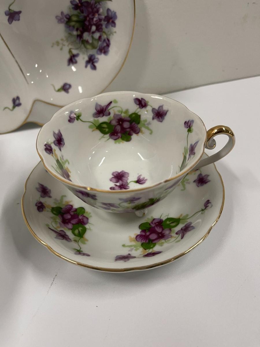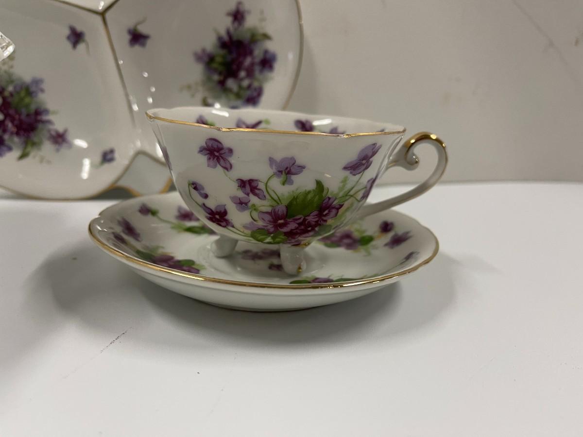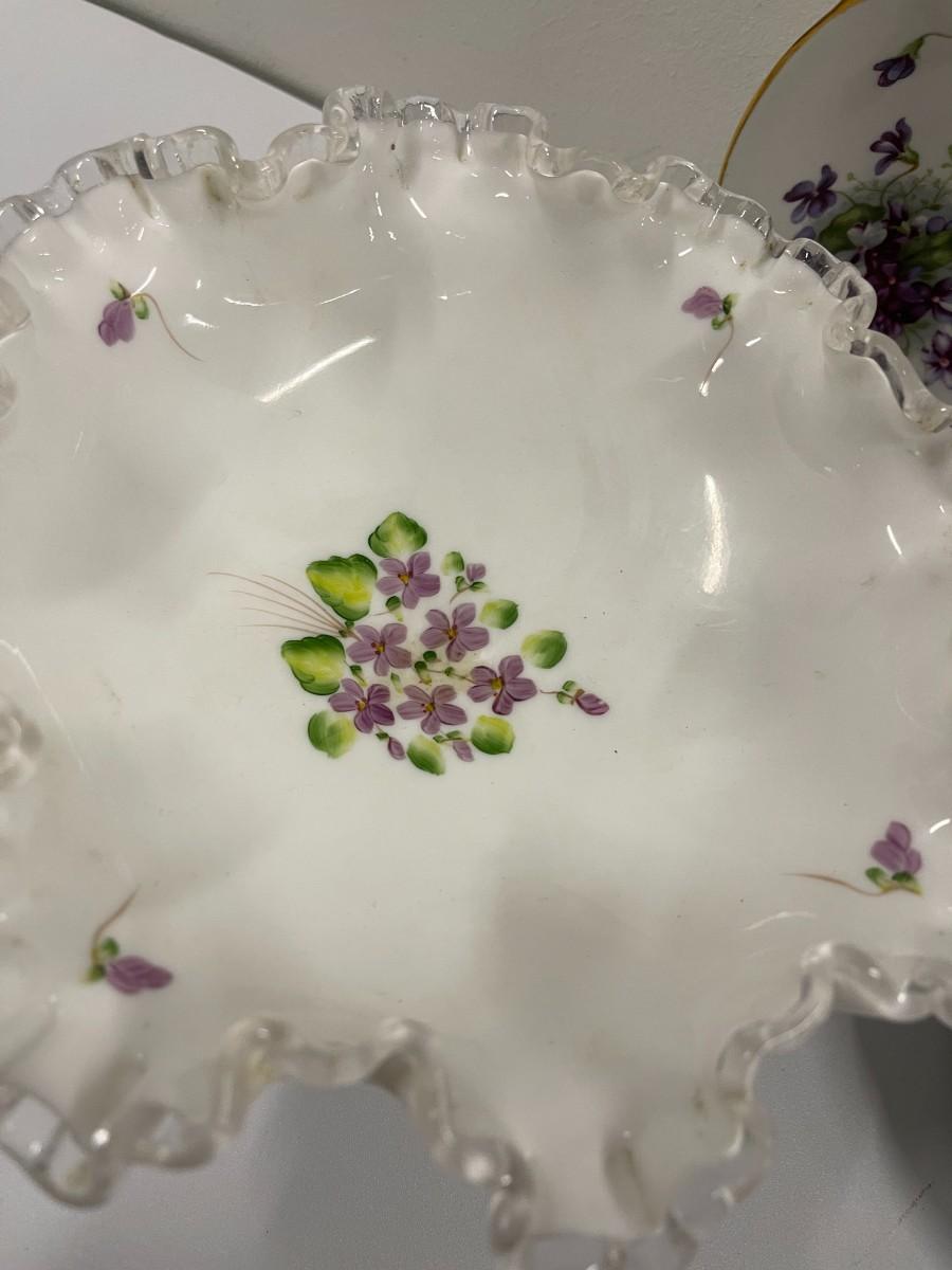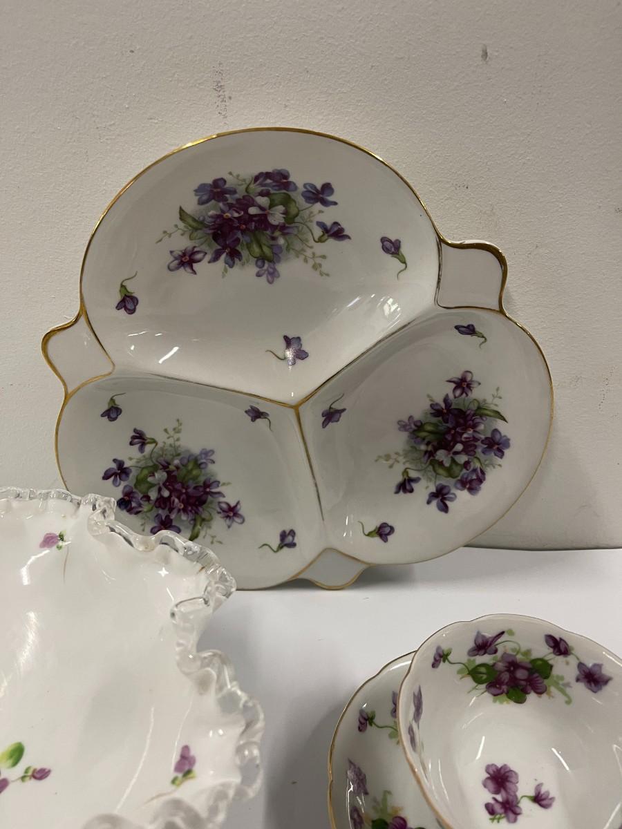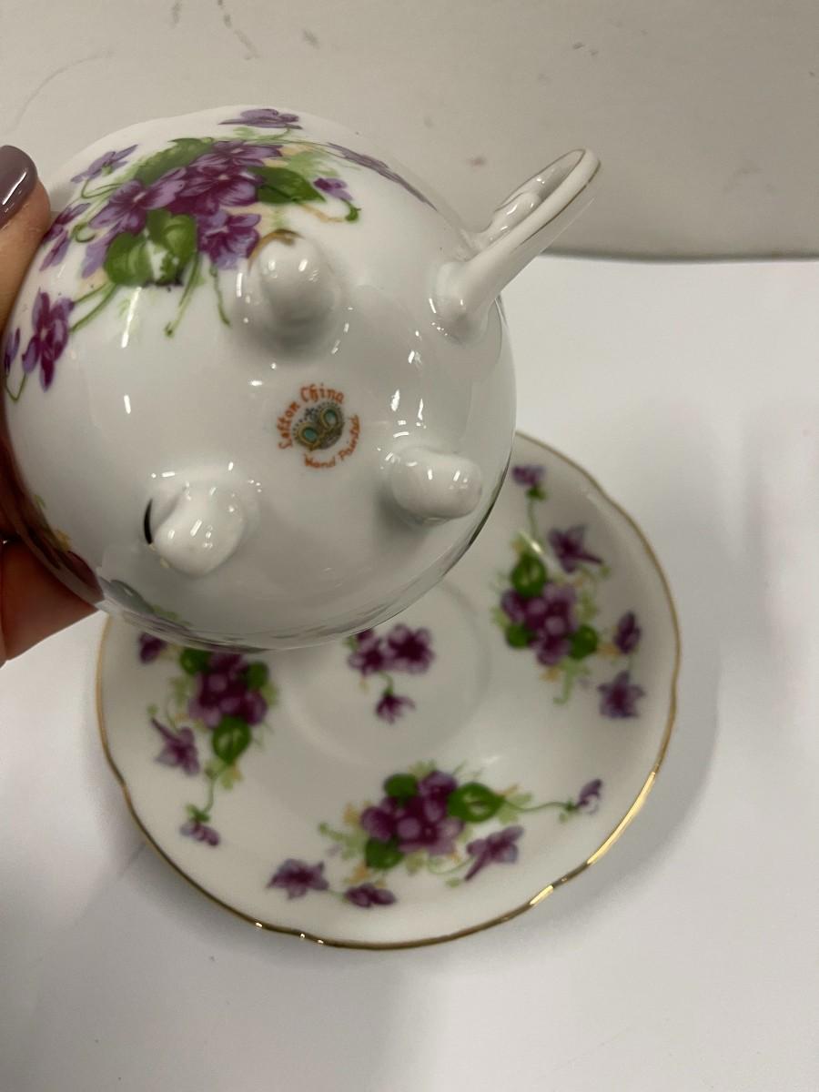 Includes Aladin porcelain divided dish, Lefton china cup & saucer & hand painted Fenton Silver Crest footed bowl. All in excellent condition.