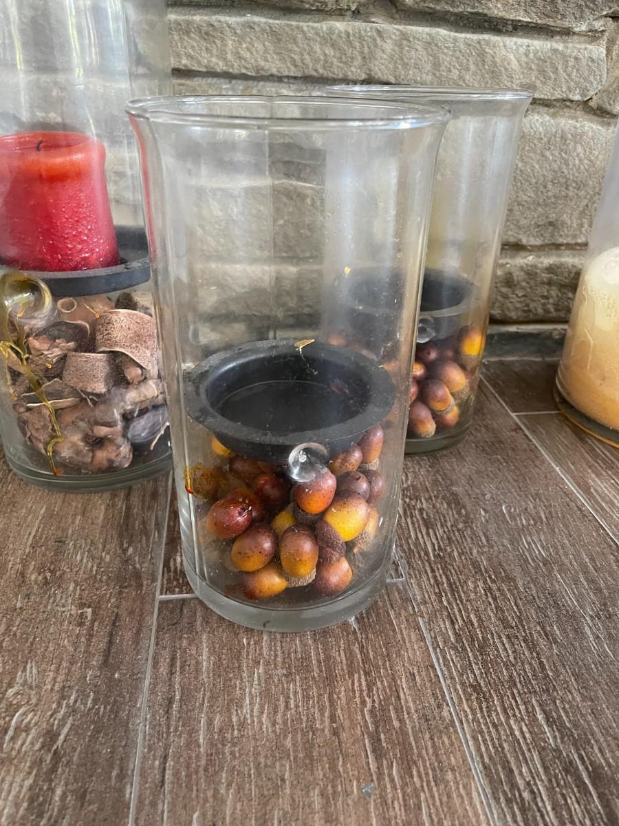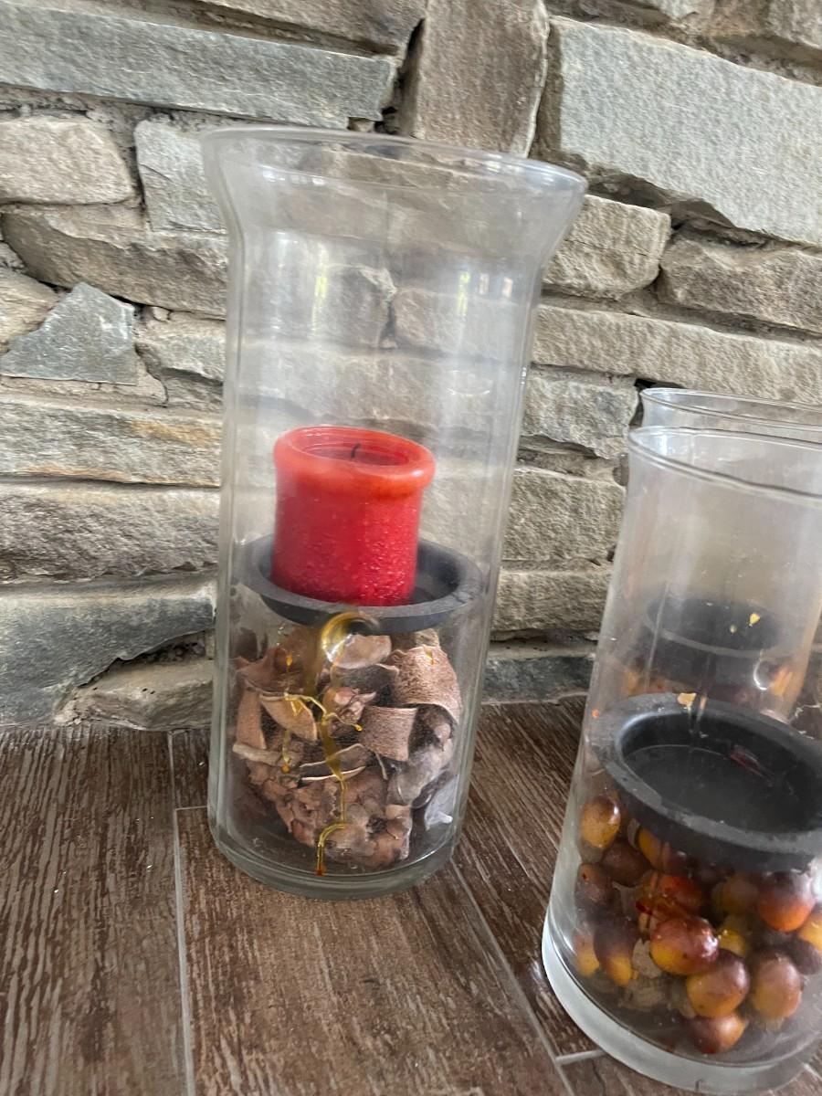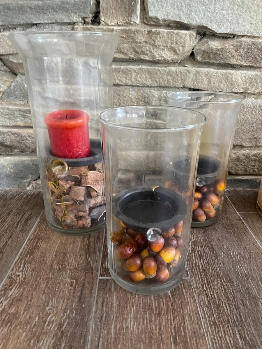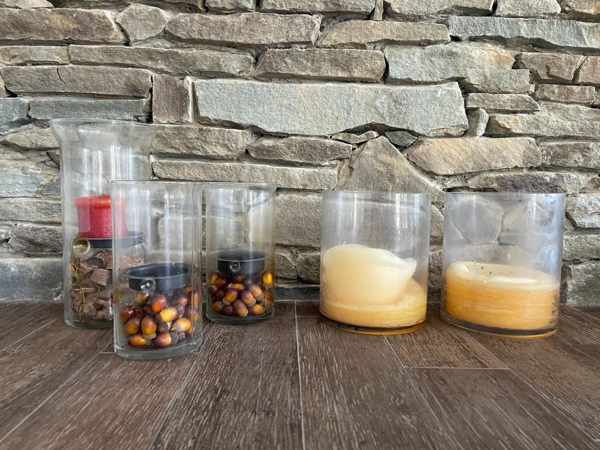 Lot of glass pillar candle holders includes 5 pieces. All in good condition, no chips, cracks or broken pieces.