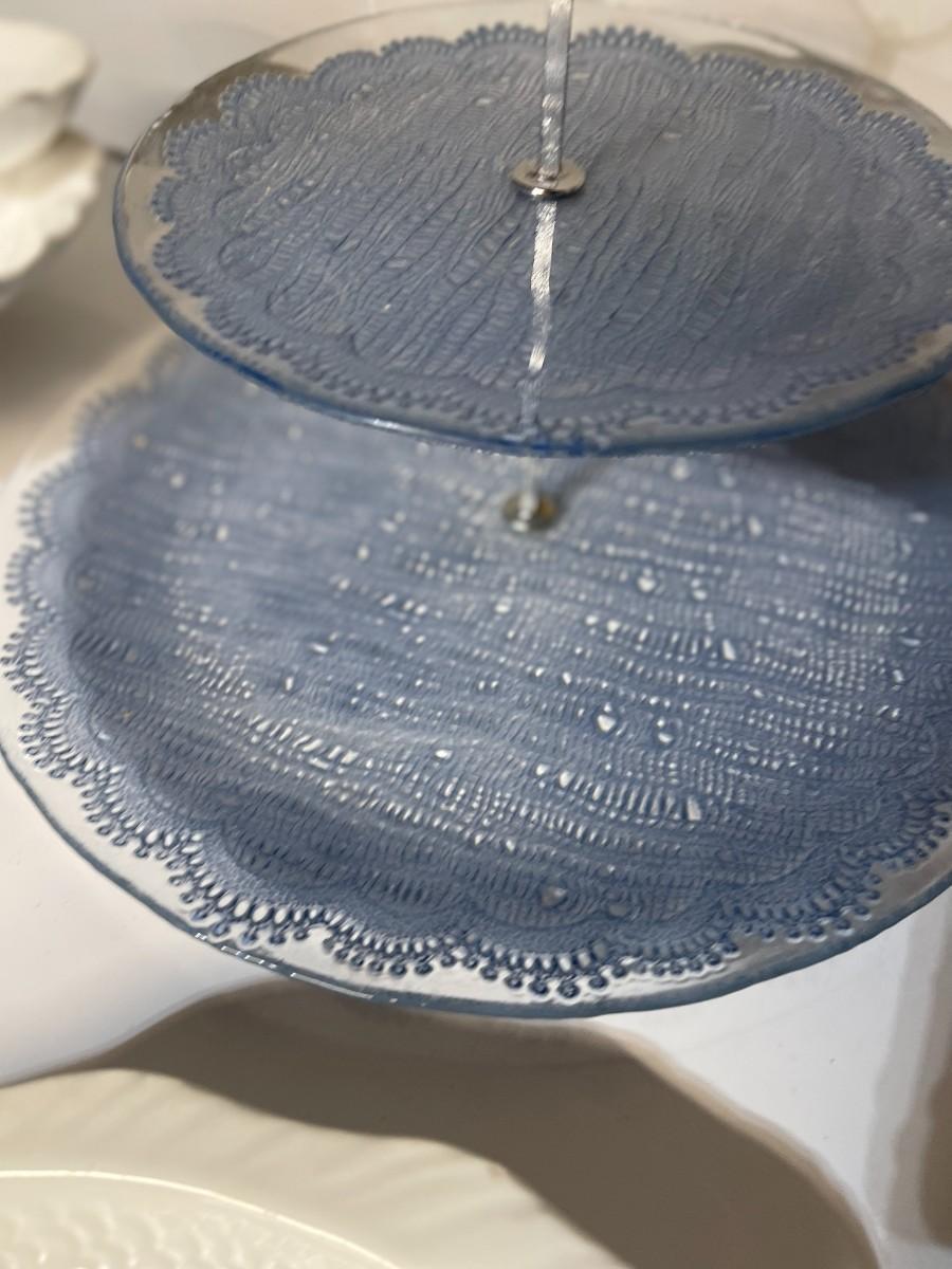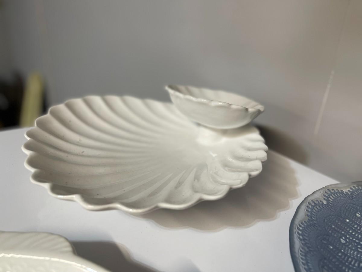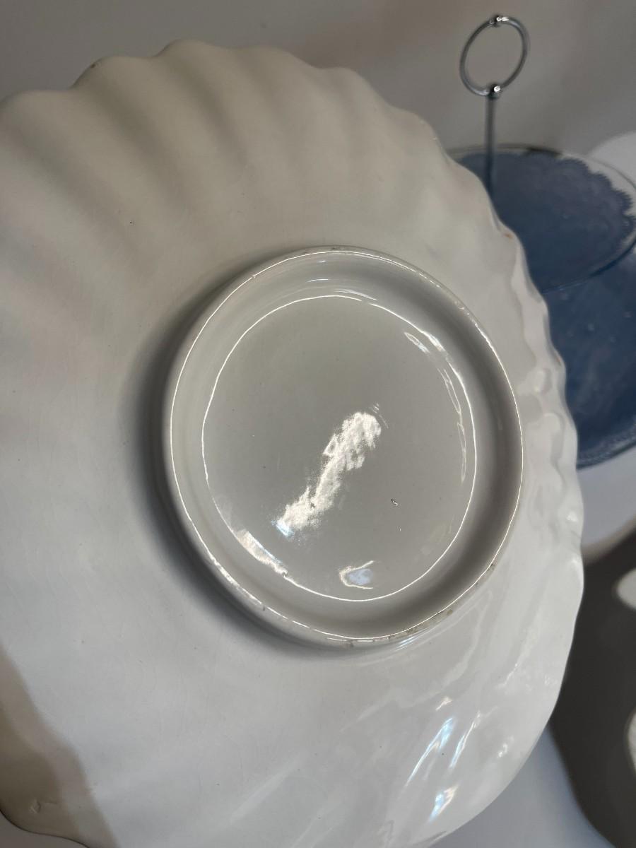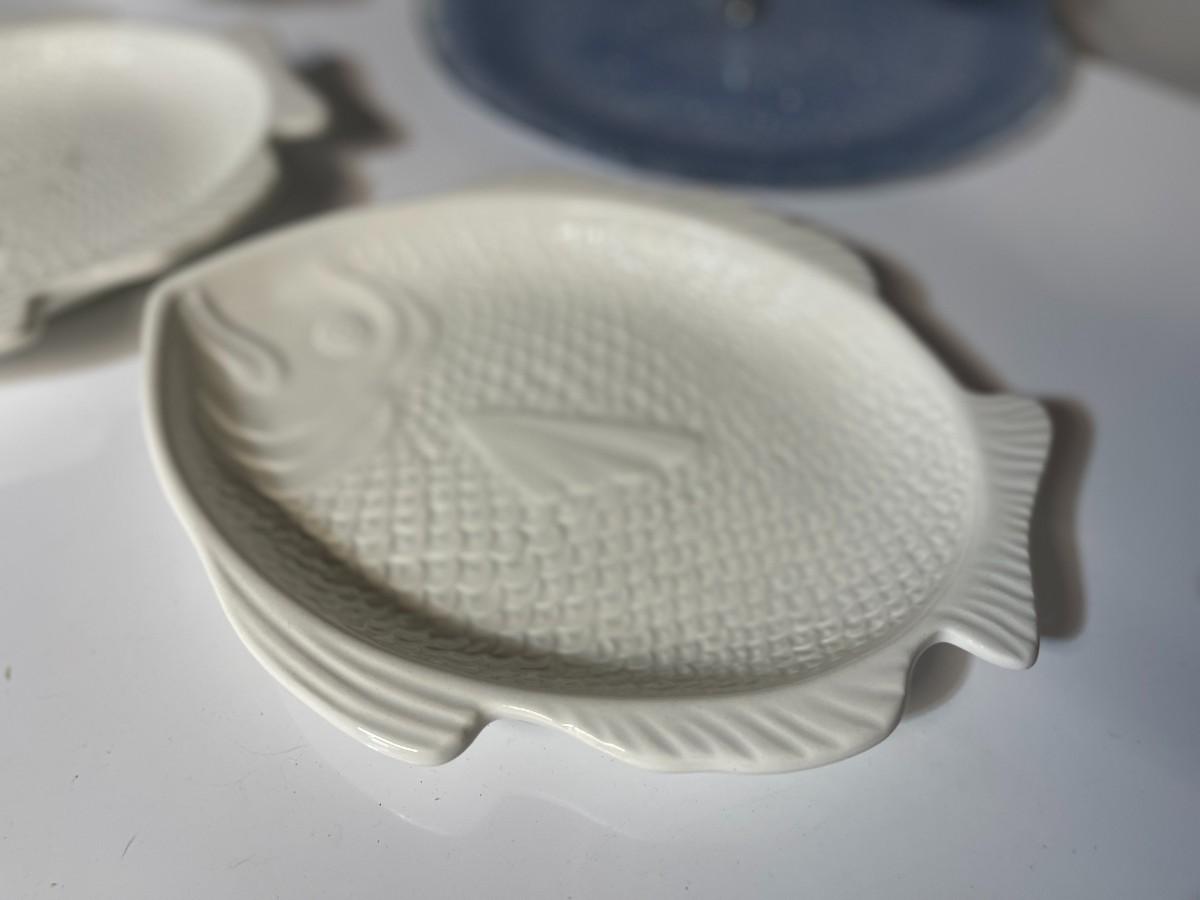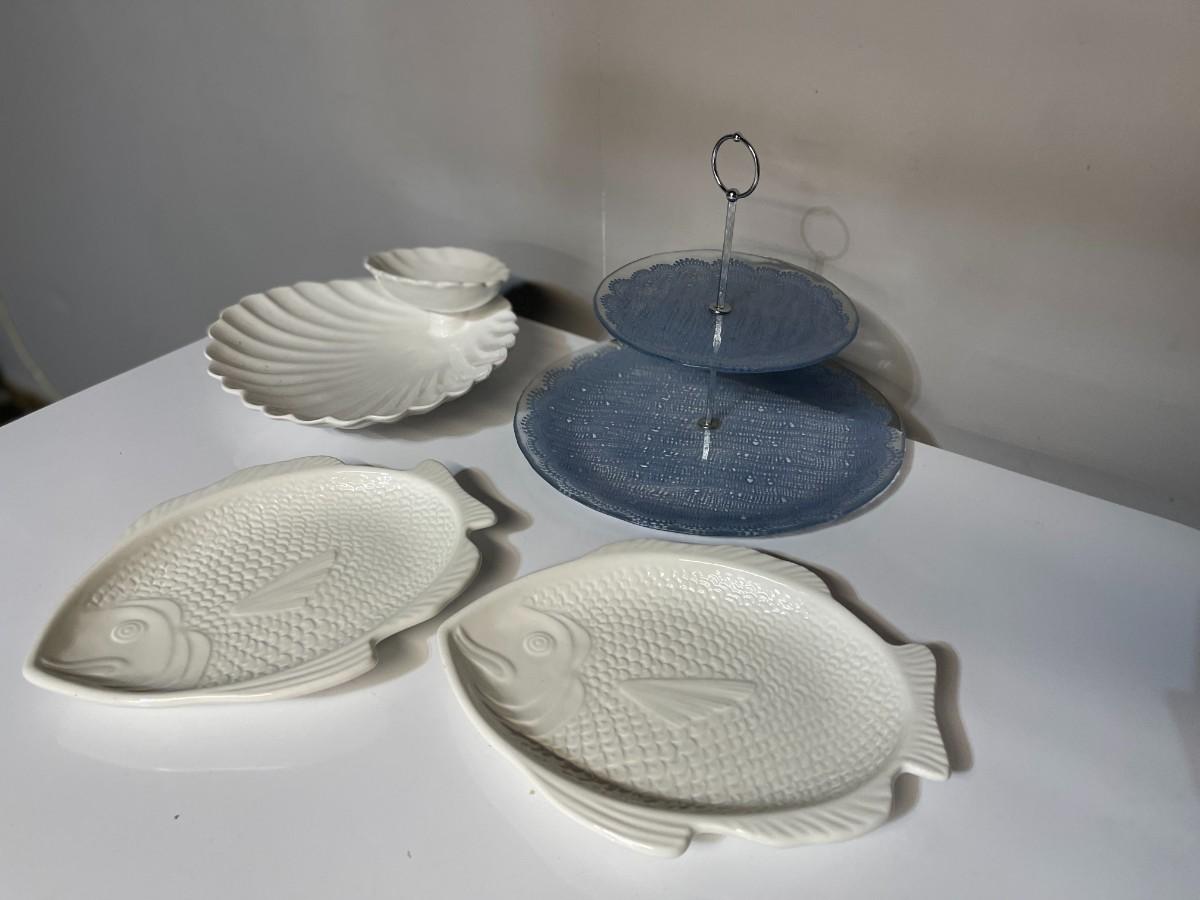Lot of Glass & Ceramic Serving Pieces: two tier, lace imprinted glass tid bit tray, 2 identical white ceramic fish platters & shell shaped chip and dip.