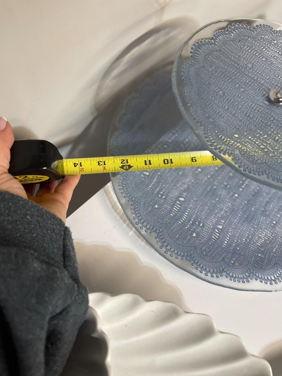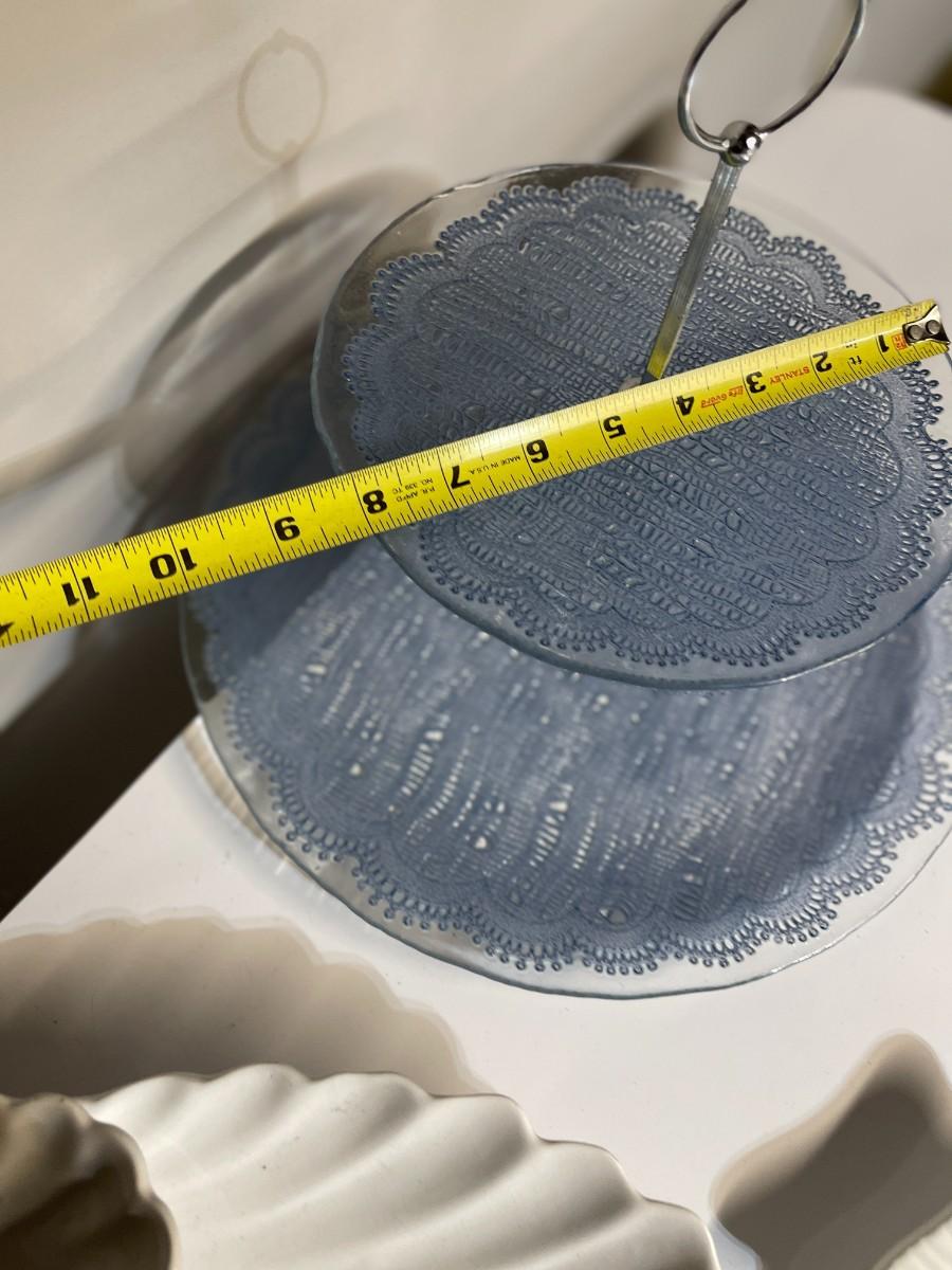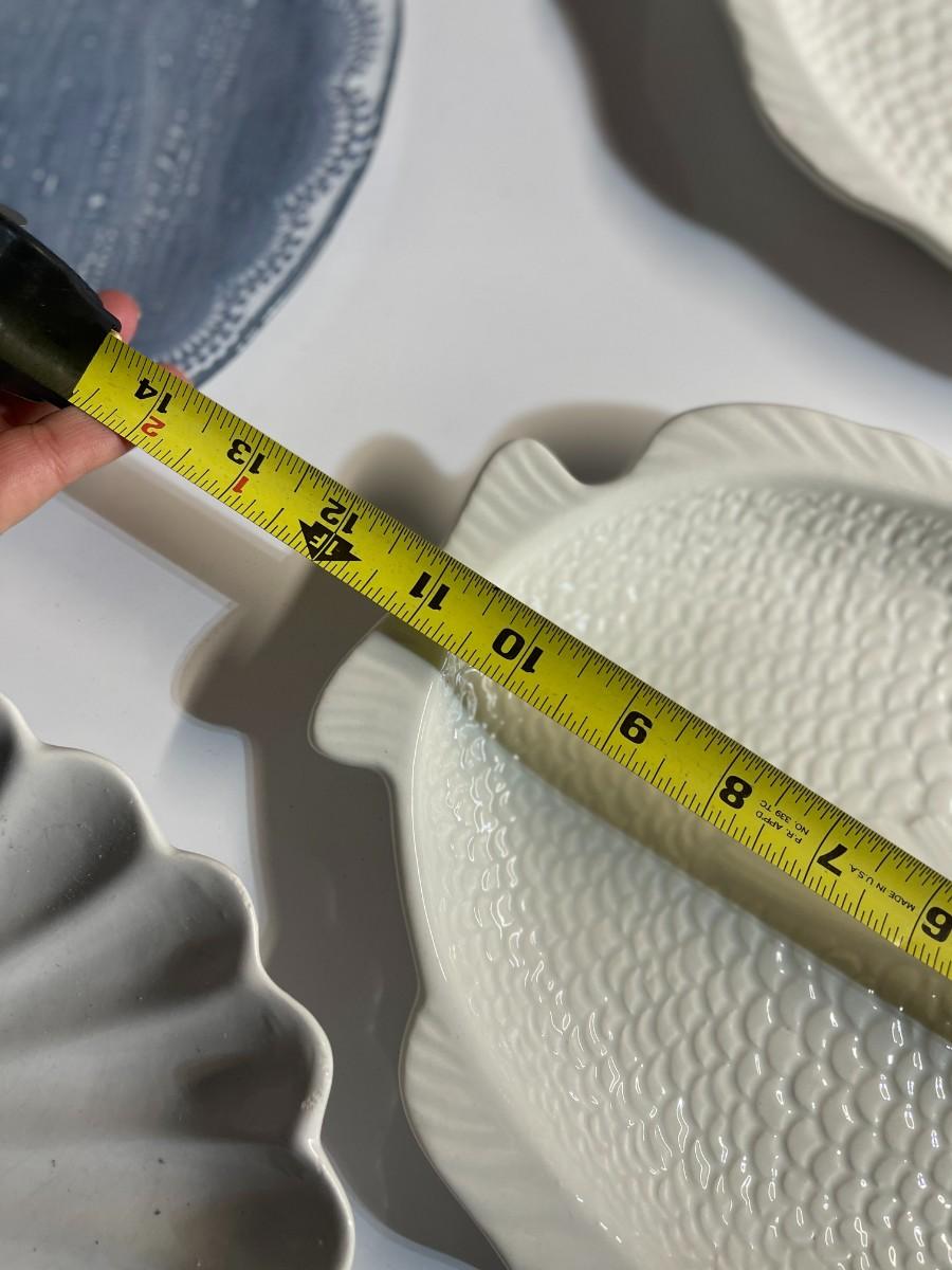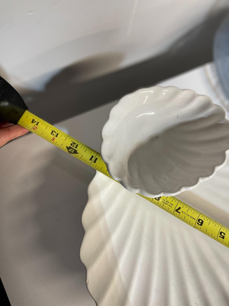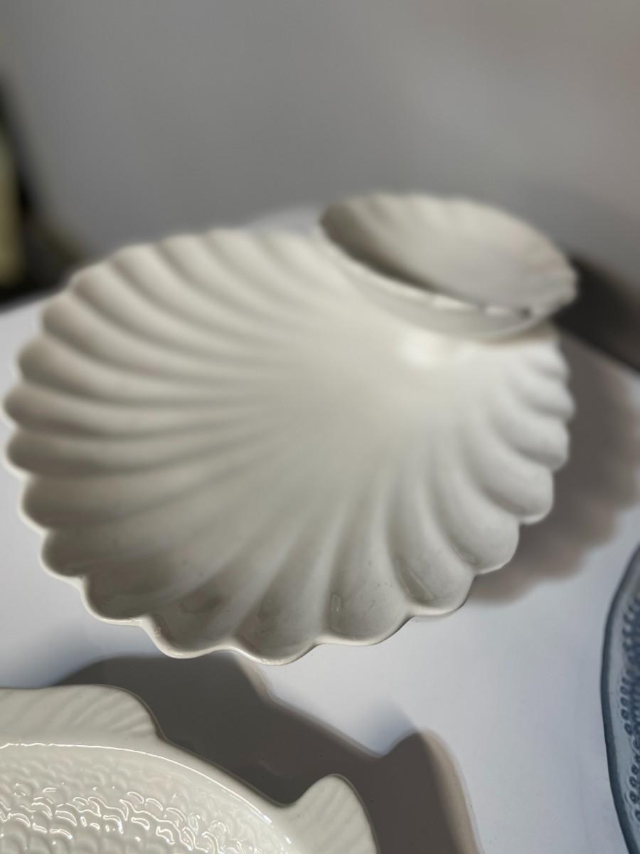 Lot of Glass & Ceramic Serving Pieces: two tier, lace imprinted glass tid bit tray, 2 identical white ceramic fish platters & shell shaped chip and dip.