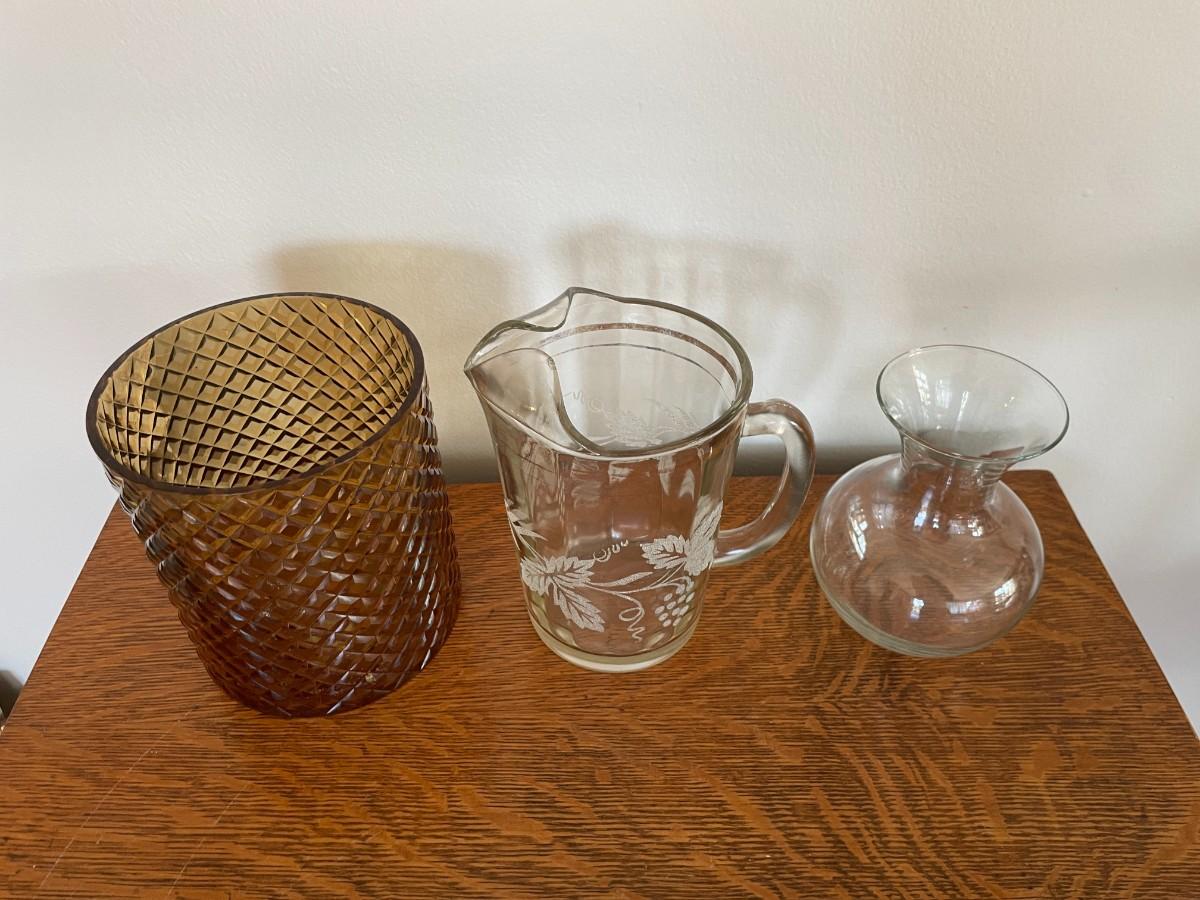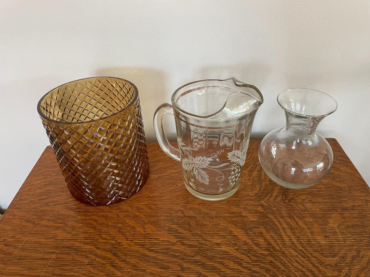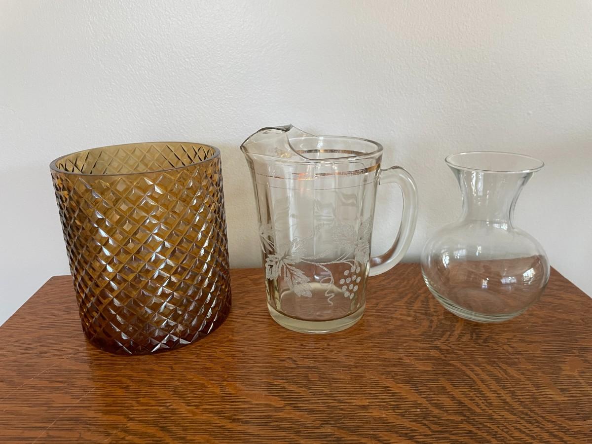 Golden Color Candle Holder, Pitcher with Gold Trim and Clear Glass Flower Vase.