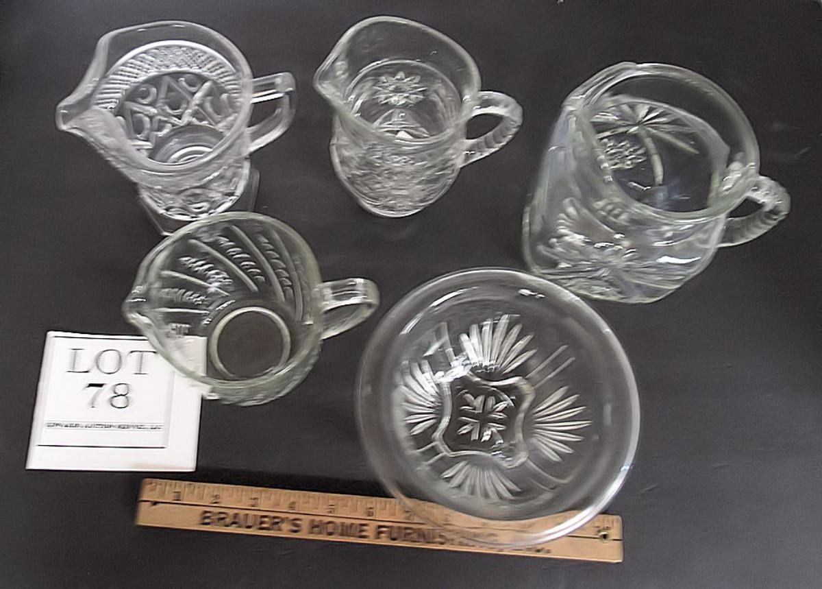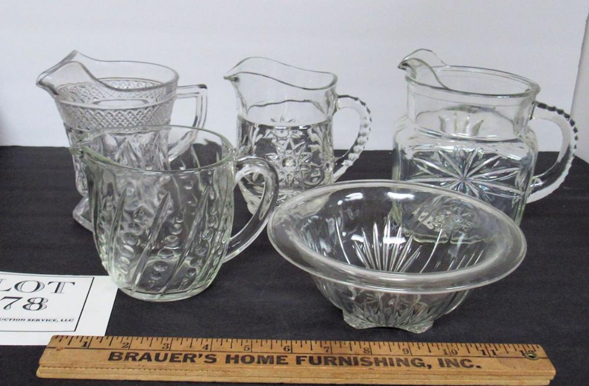 Lot of Glass Milk Pitchers and Small Mixing Bowl