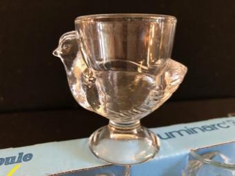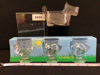 Lot of Glass Scotty Dog Candy Dish & Three Egg Cups of Chicks In Box