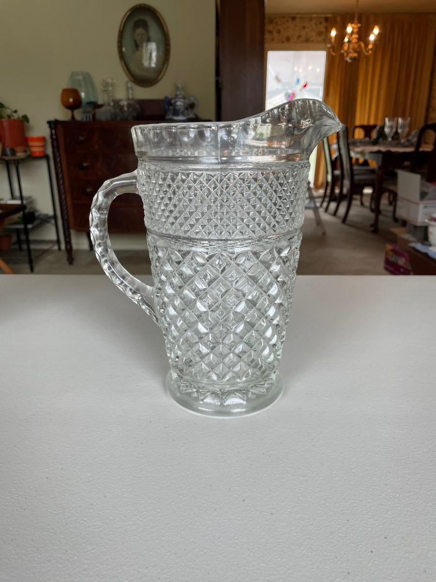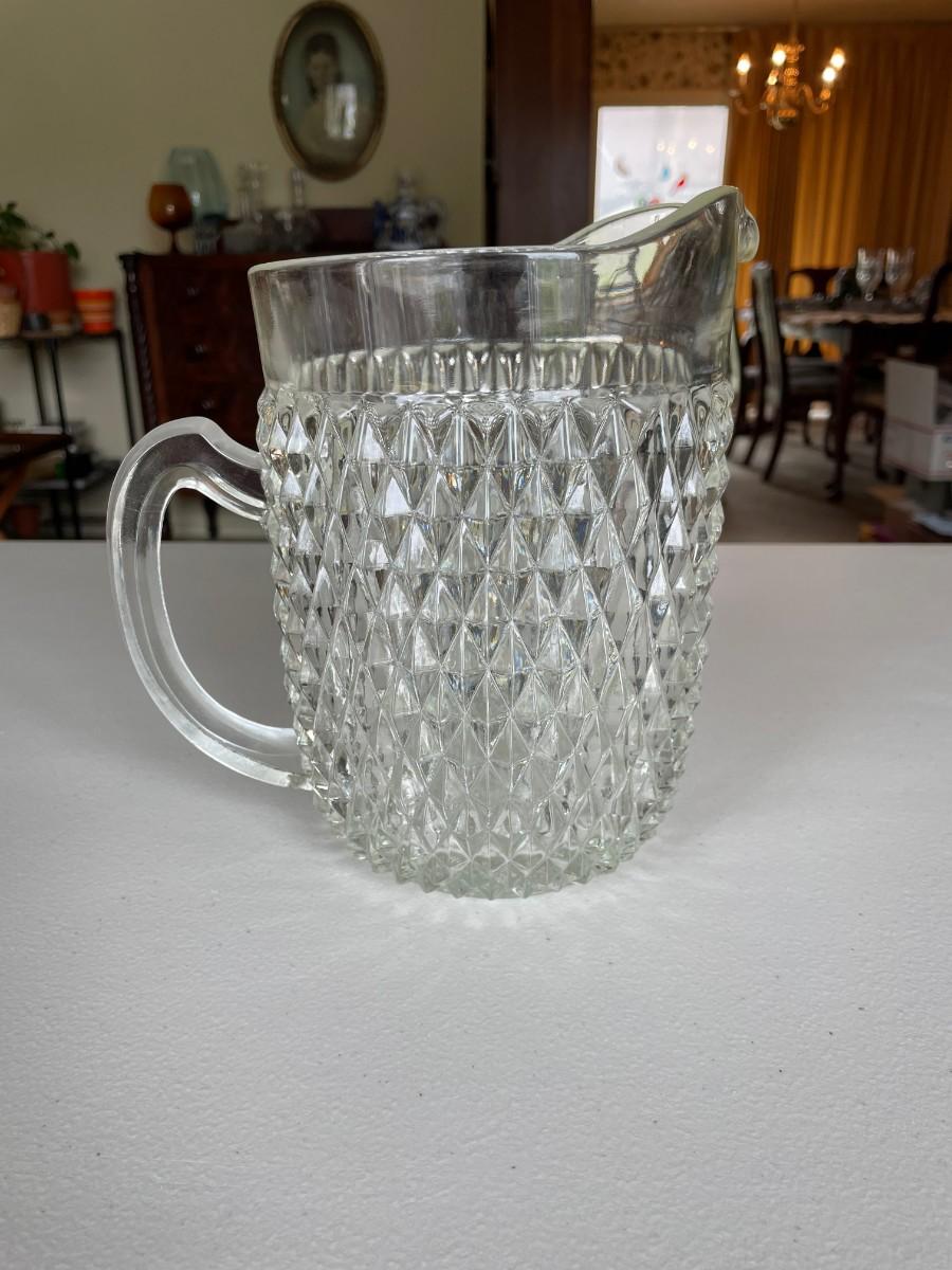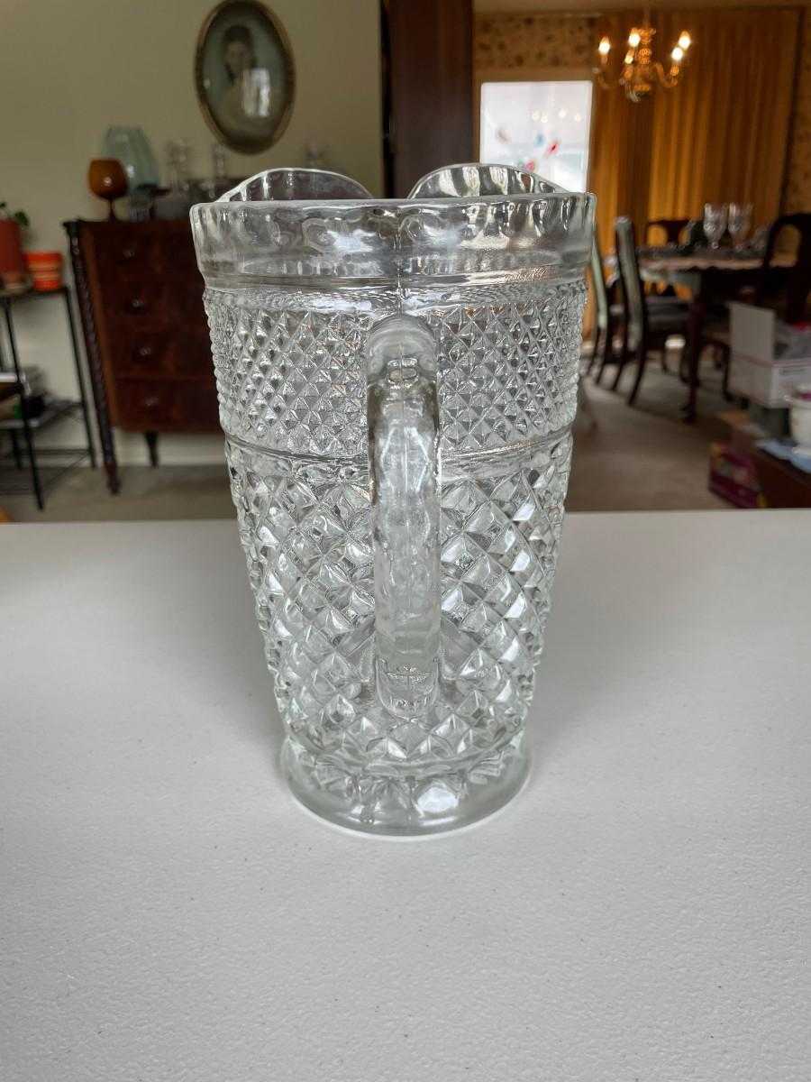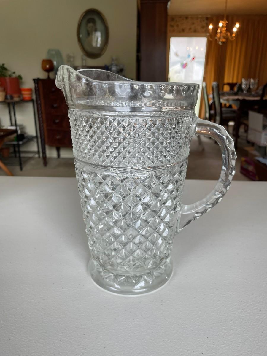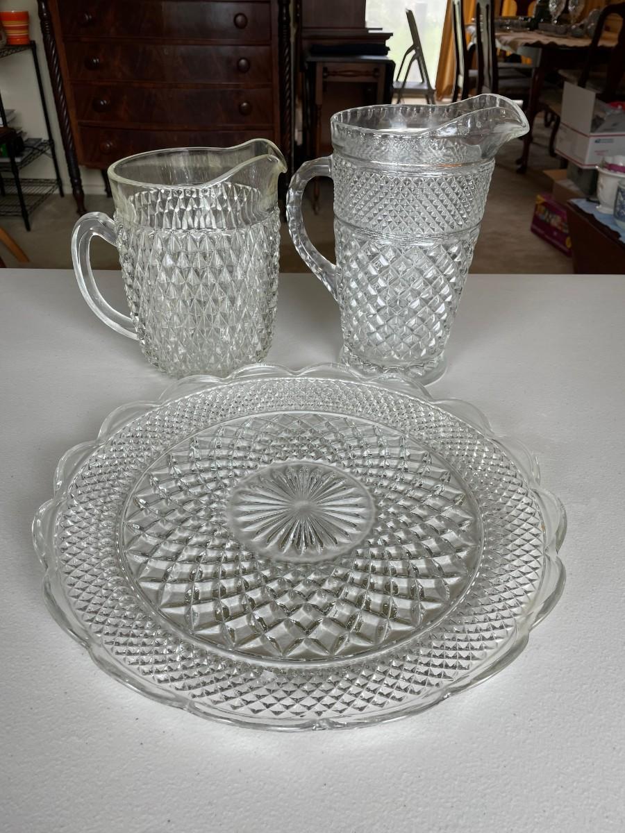1 - 10” pitcher - Anchor Hocking Wexford Pattern. 1 - 8” pitcher - Diamond point patter water pitcher. 1 - 14” Anchor Hocking Wexford Cupped Edge Torte Plate.