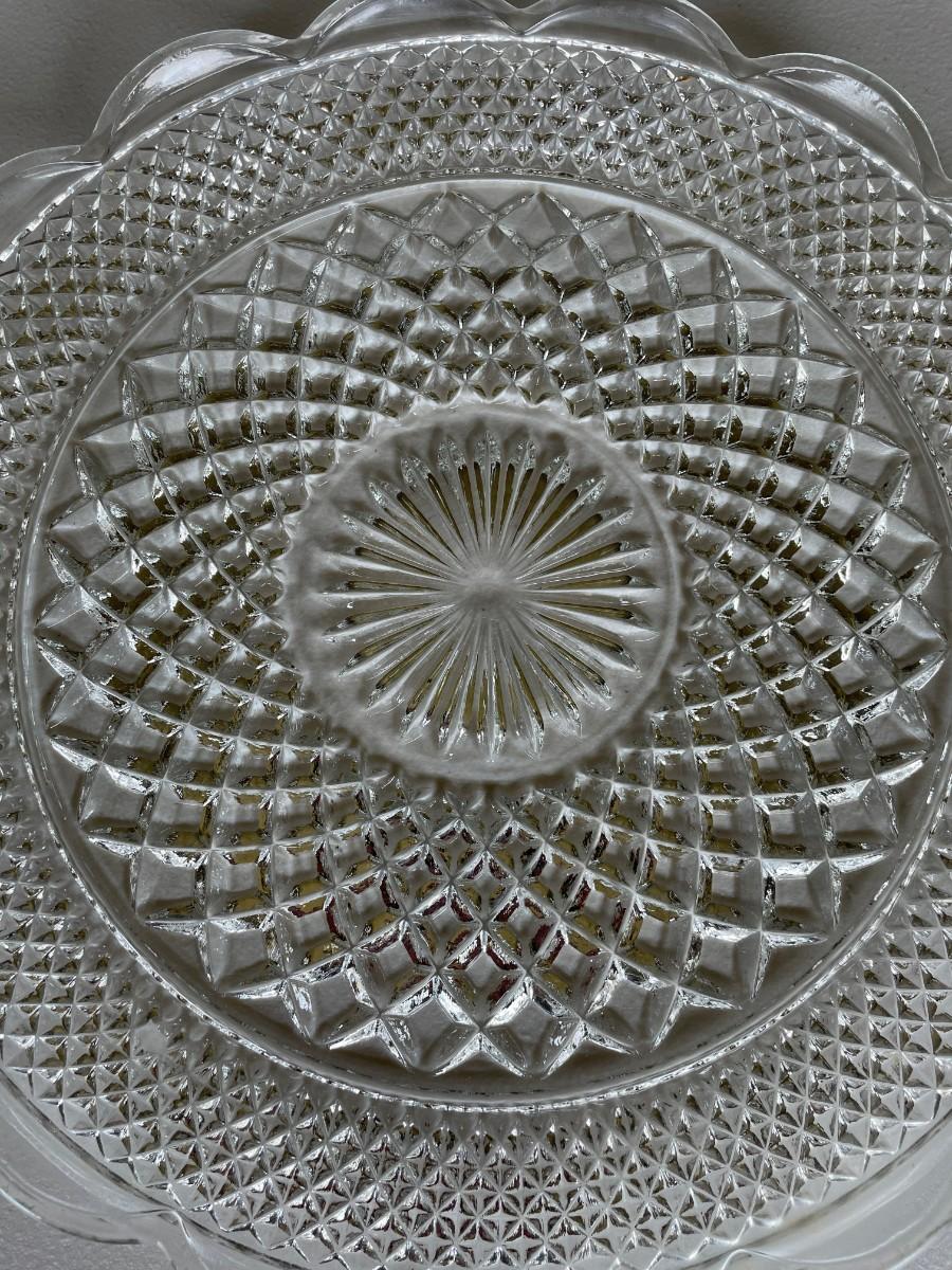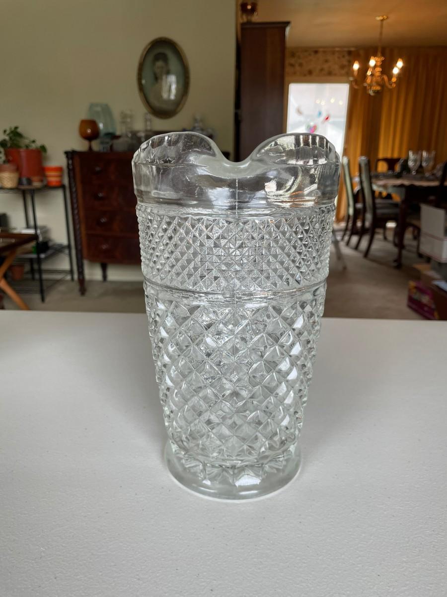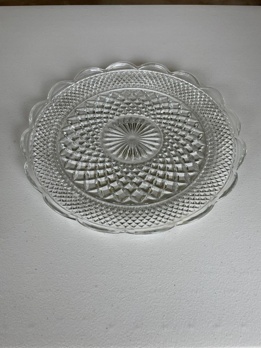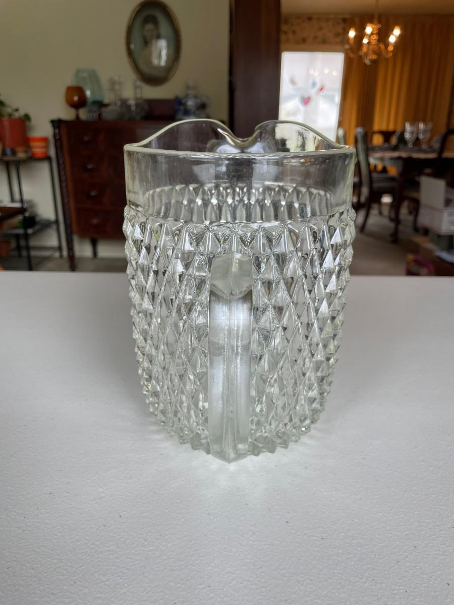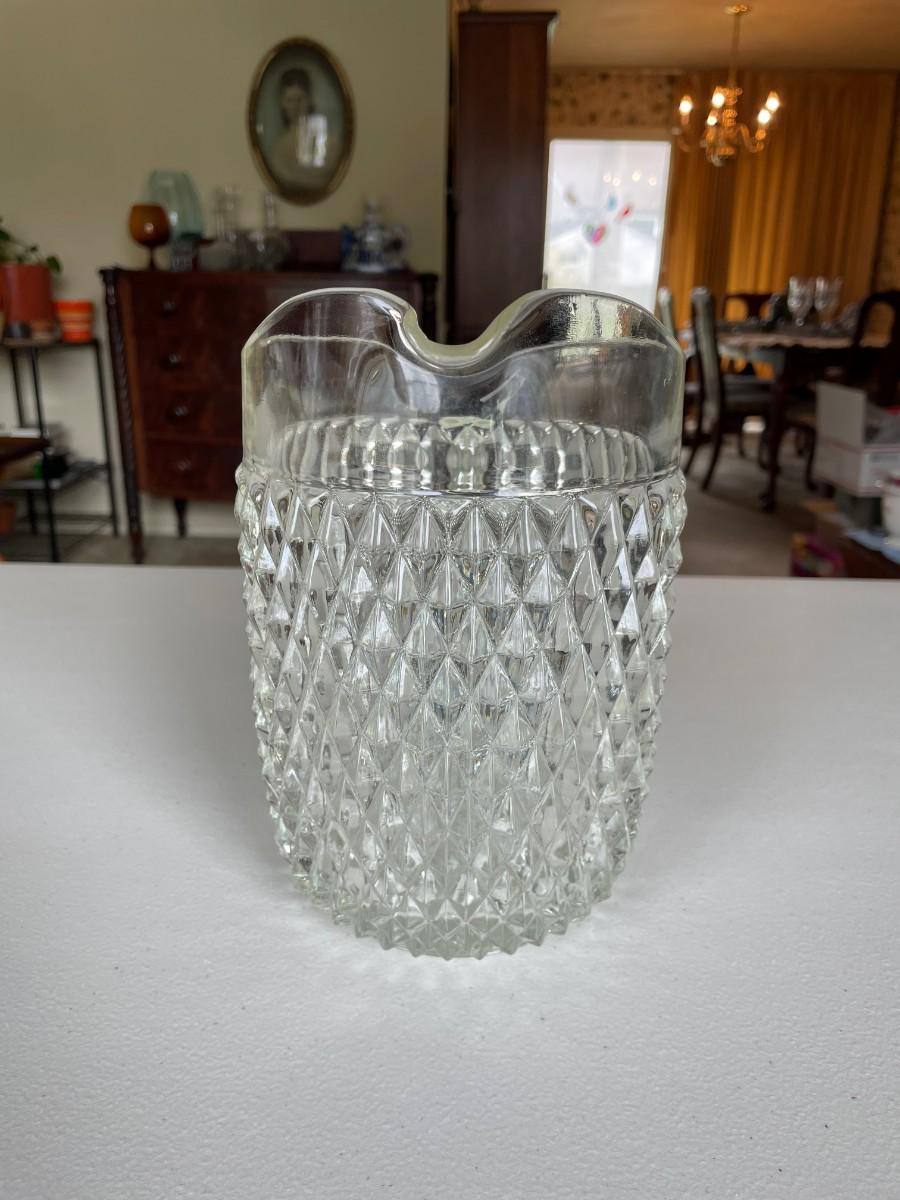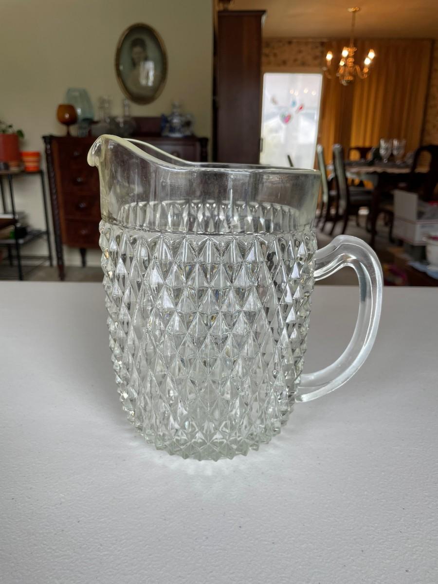 1 - 10” pitcher - Anchor Hocking Wexford Pattern. 1 - 8” pitcher - Diamond point patter water pitcher. 1 - 14” Anchor Hocking Wexford Cupped Edge Torte Plate.