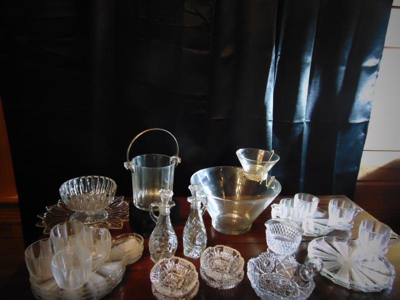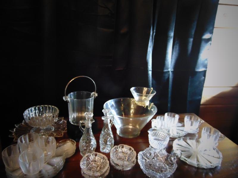 Lot contains nice retro ice bucket, retro chip and dip bowl set, oil and vinegar press glass set, retro party sets with plates & cups and more....