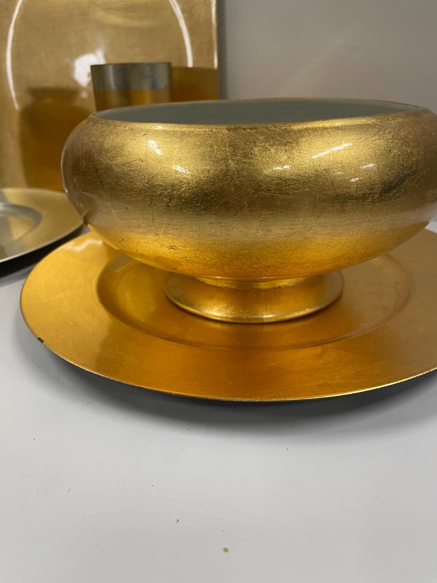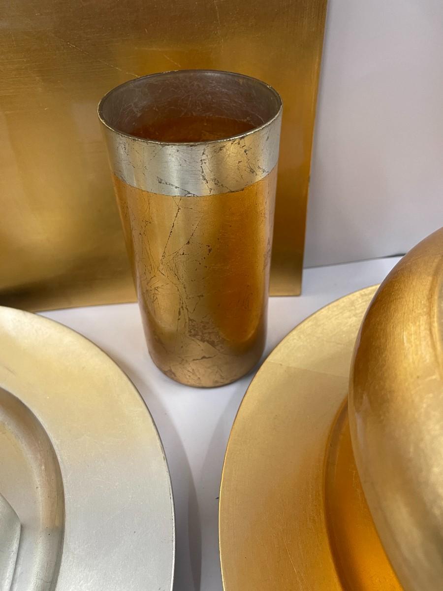 Lot includes gold decorative bowl, vases and chargers and silver leaf charger and candlestick.