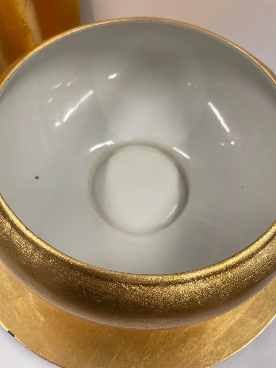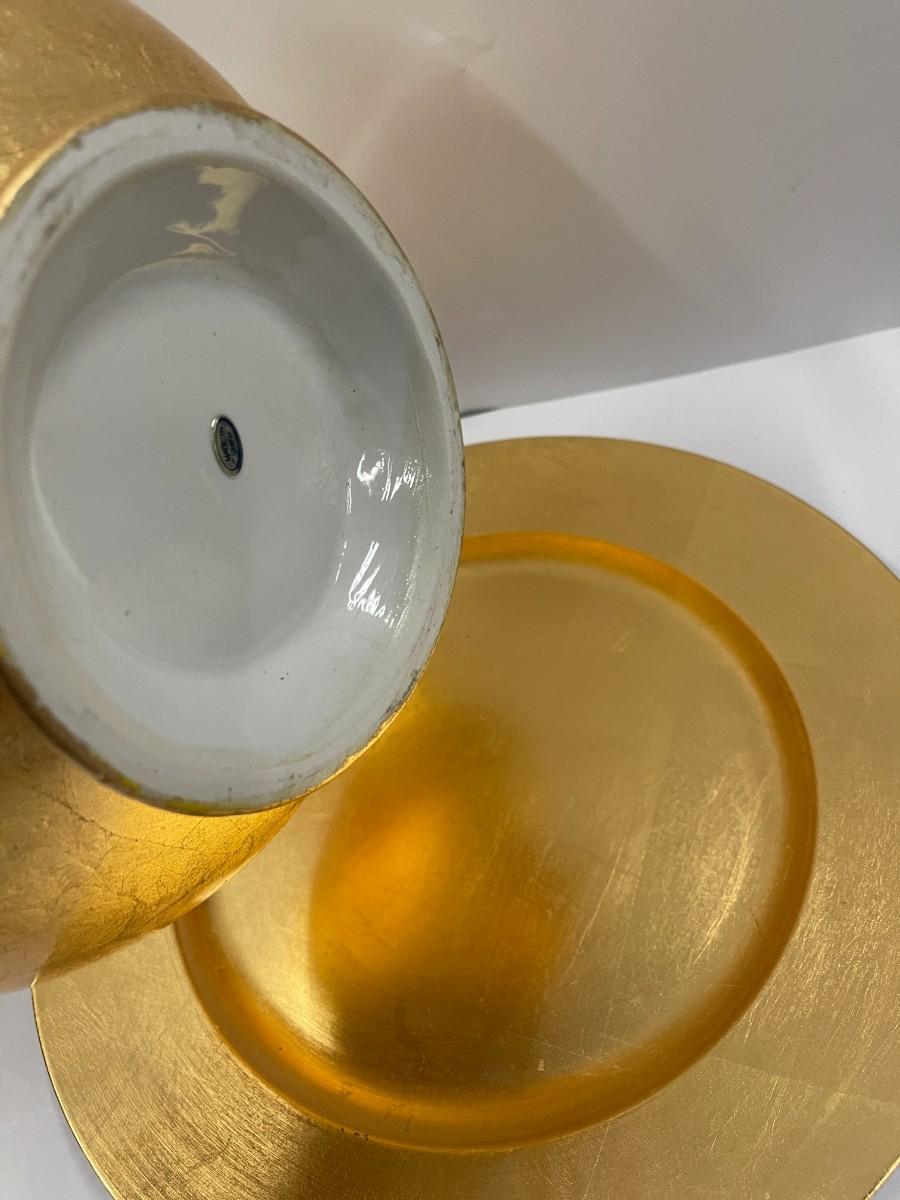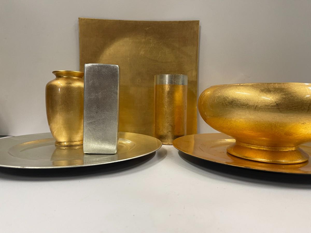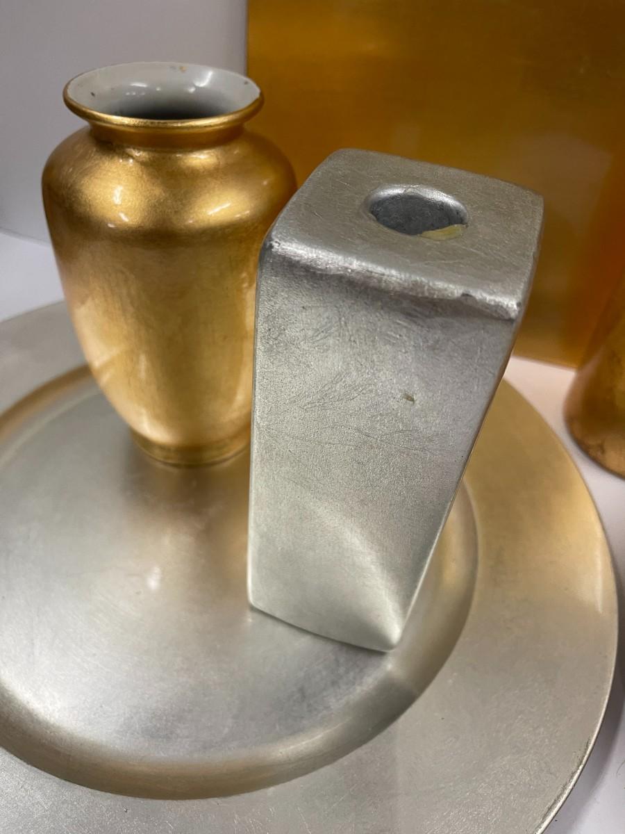Lot includes gold decorative bowl, vases and chargers and silver leaf charger and candlestick.