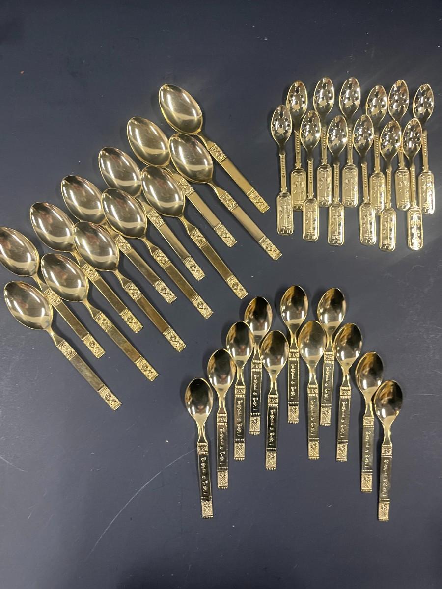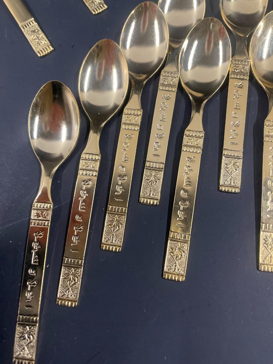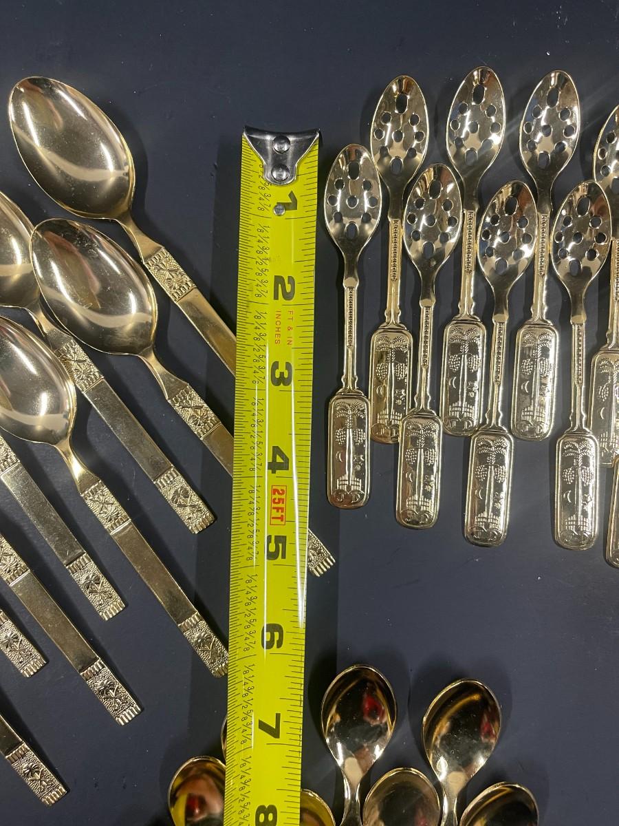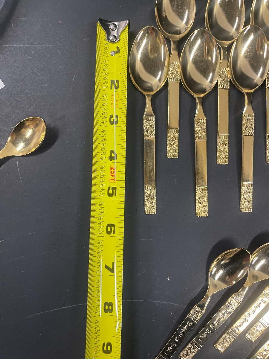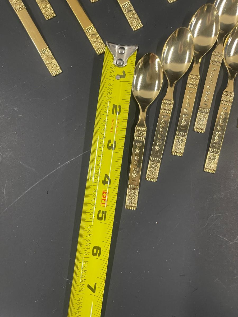 Lot of assorted gold tone teaspoons. They're super small and 3 different patterns.