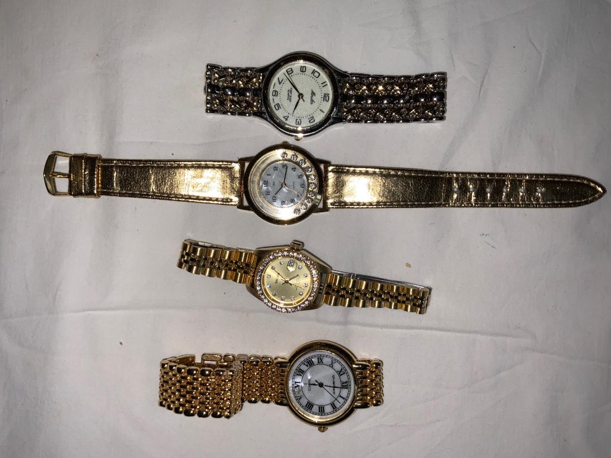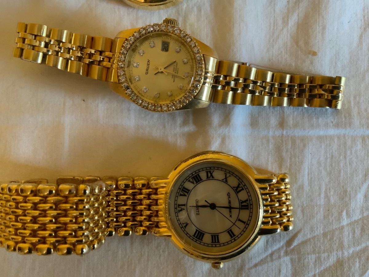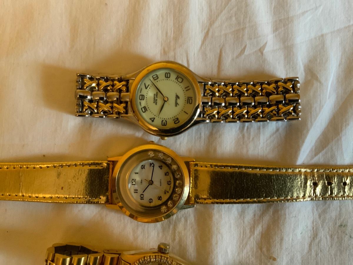 Nice lot of Gold toned watches. One does have a crack on the face. Not guaranteed to be working. Please see pics for condition
