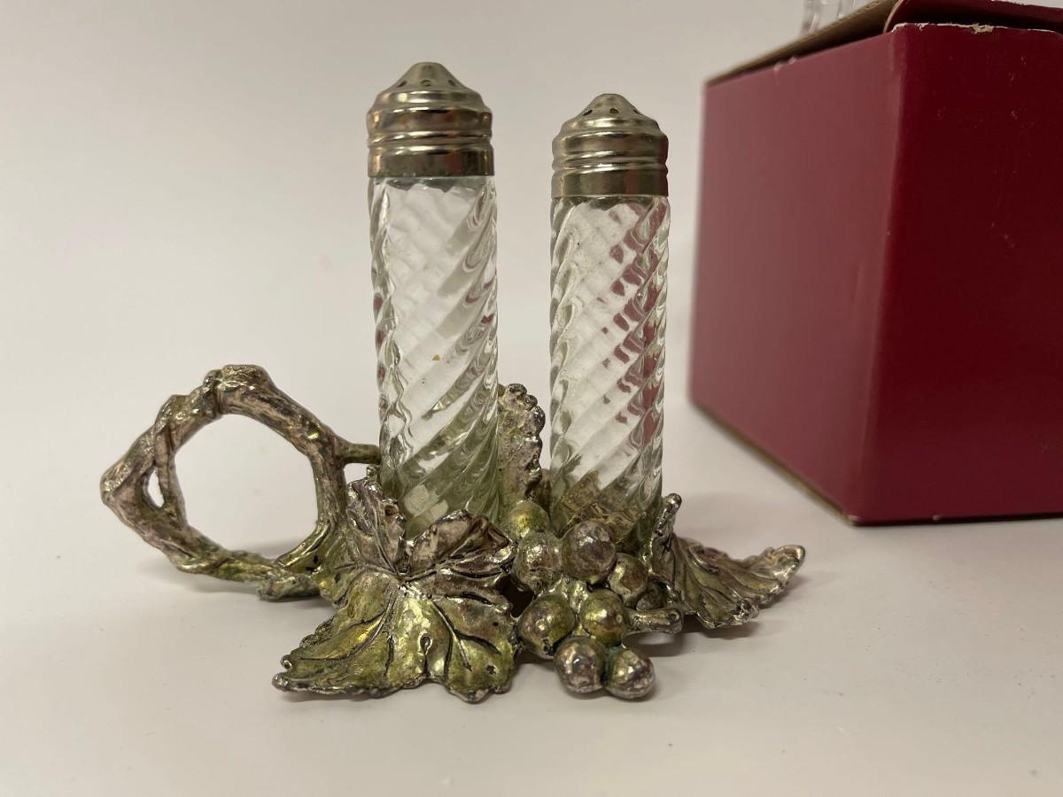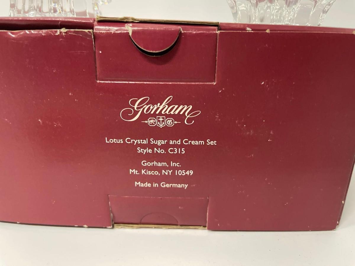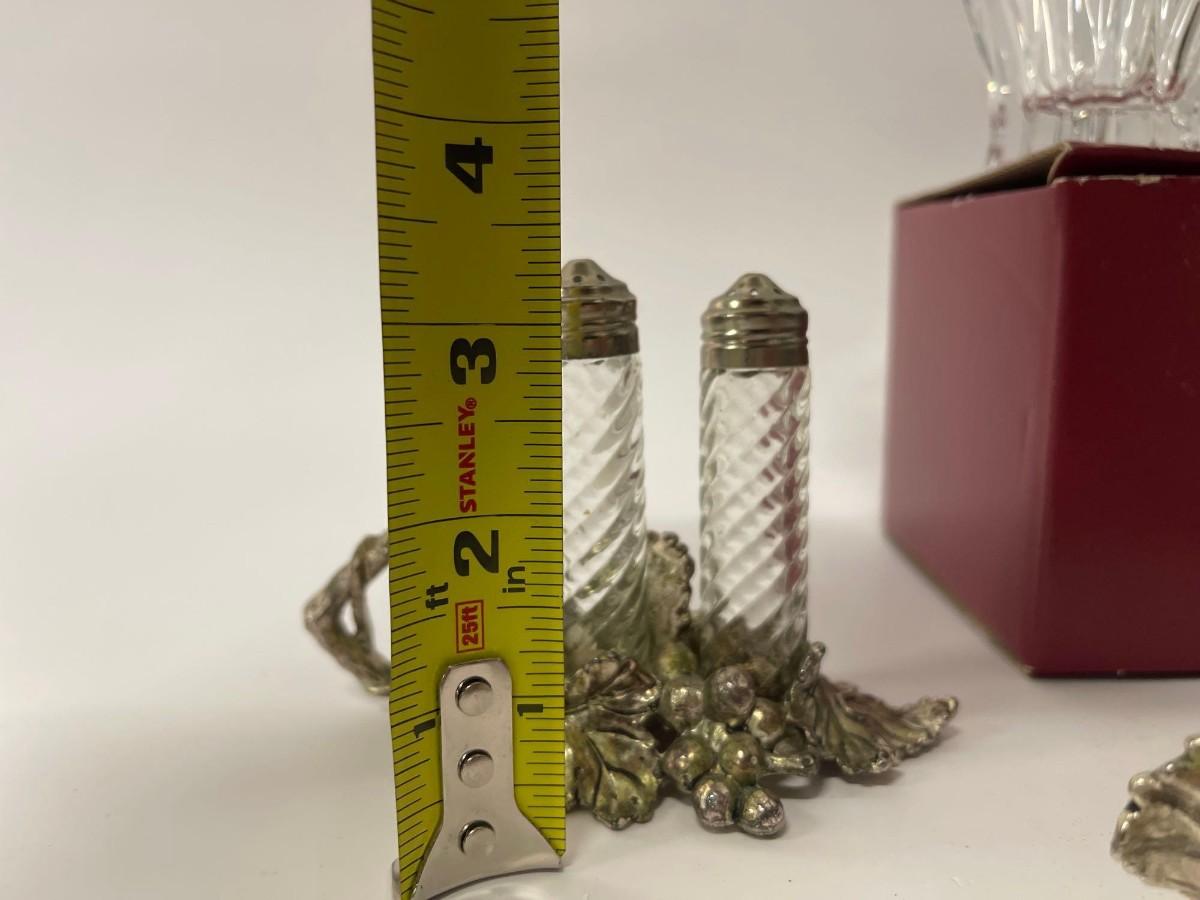 Lot of Gorham Crystal Lotus Sugar & Creamer Plus Metal Candle Snuffer & Salt & Pepper, Grape Pattern