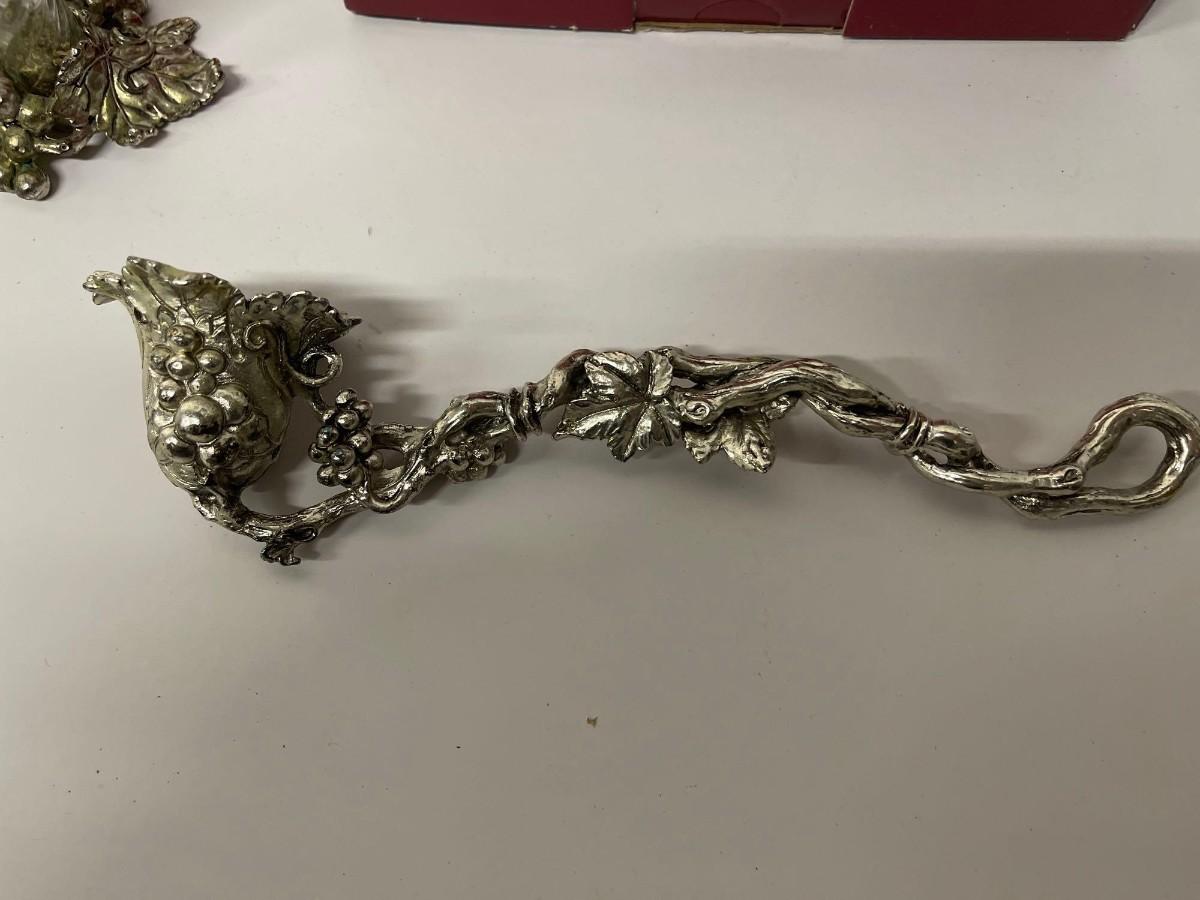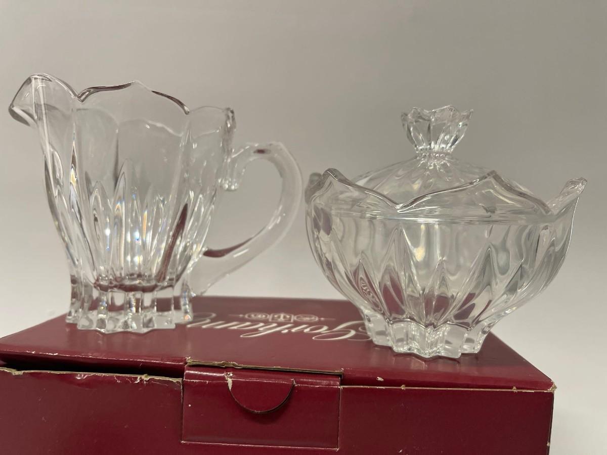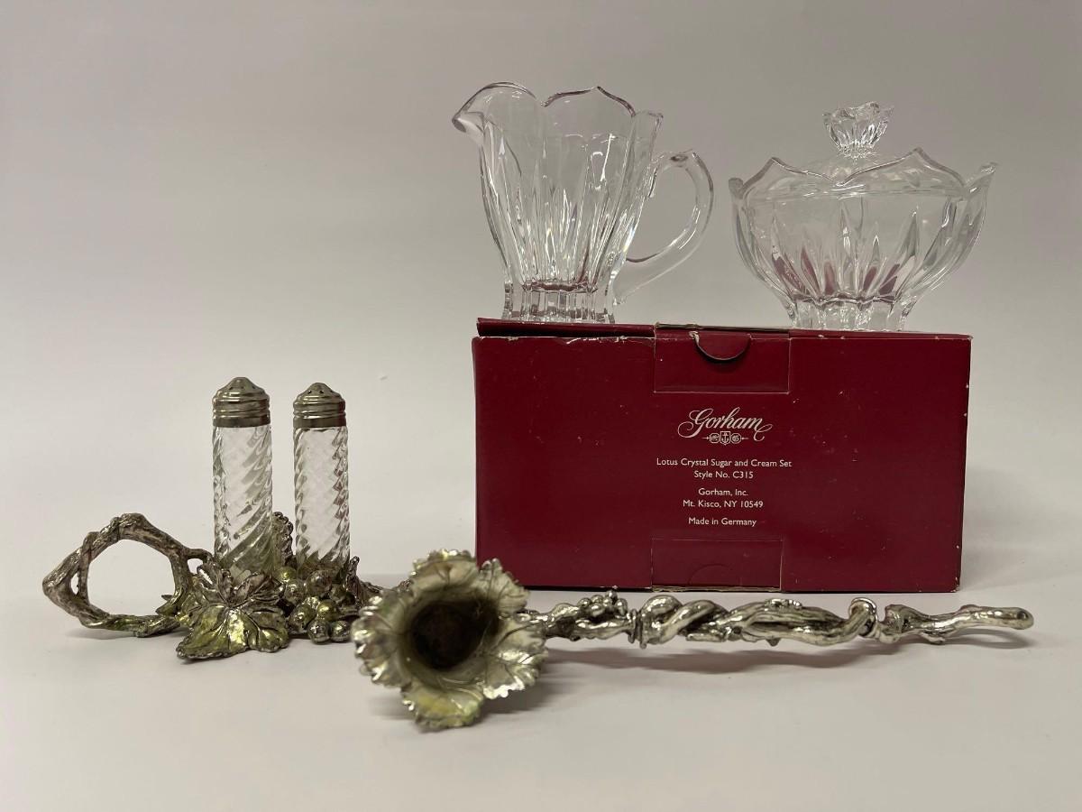 Lot of Gorham Crystal Lotus Sugar & Creamer Plus Metal Candle Snuffer & Salt & Pepper, Grape Pattern.