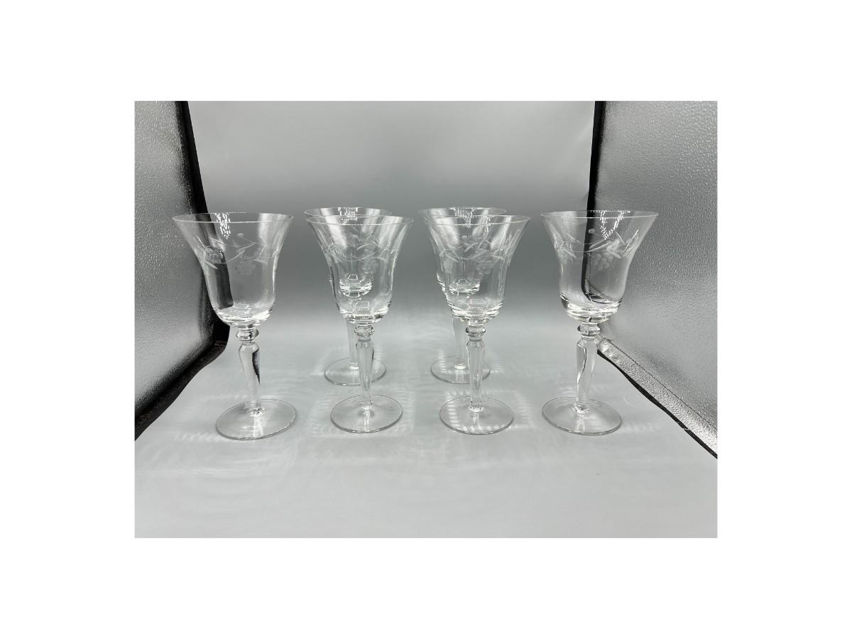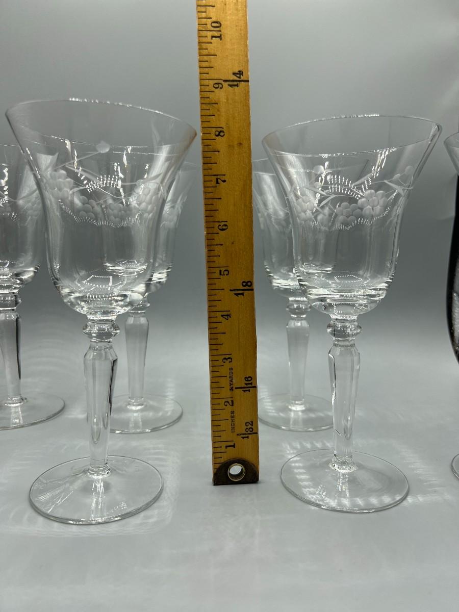 Lot of Grape Vine Etched Wine Vino Stemmed Drinking Glasses, there is no significant cracks or chips to any of the glasses and is in good useable condition. Check pictures for more details and for sizing.
