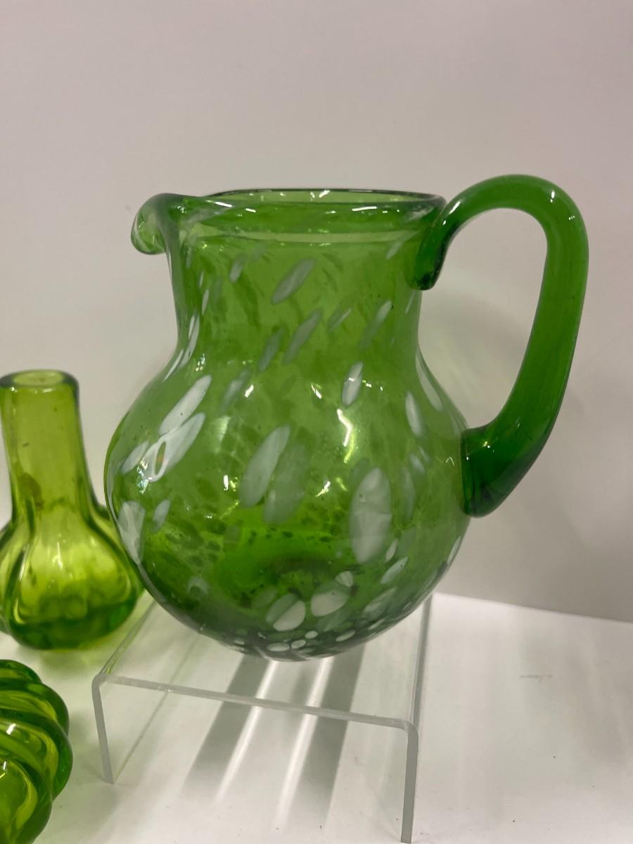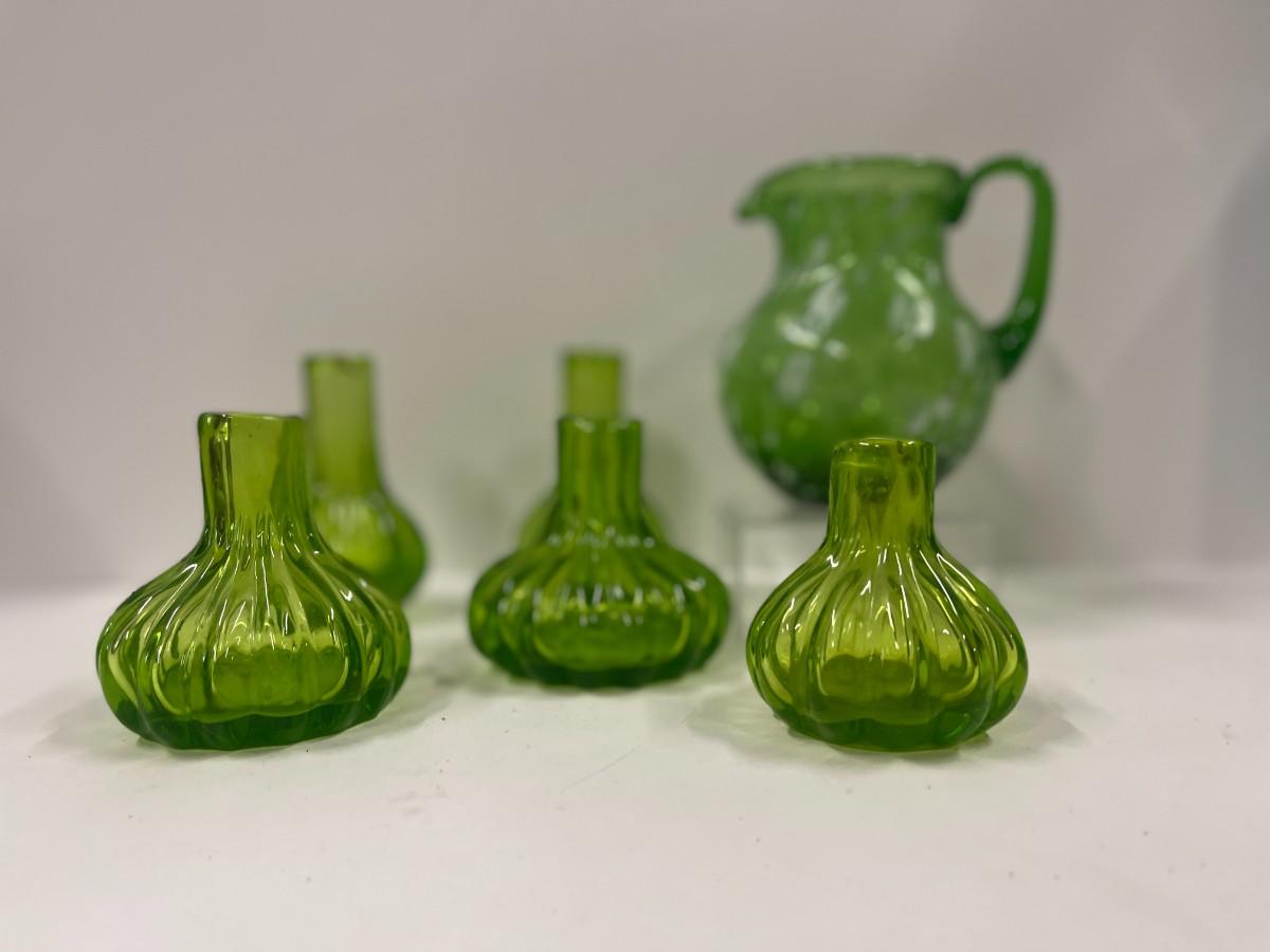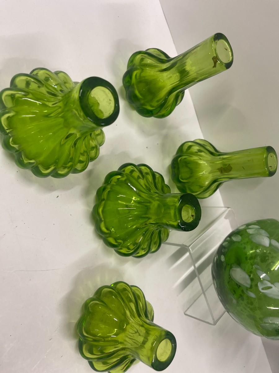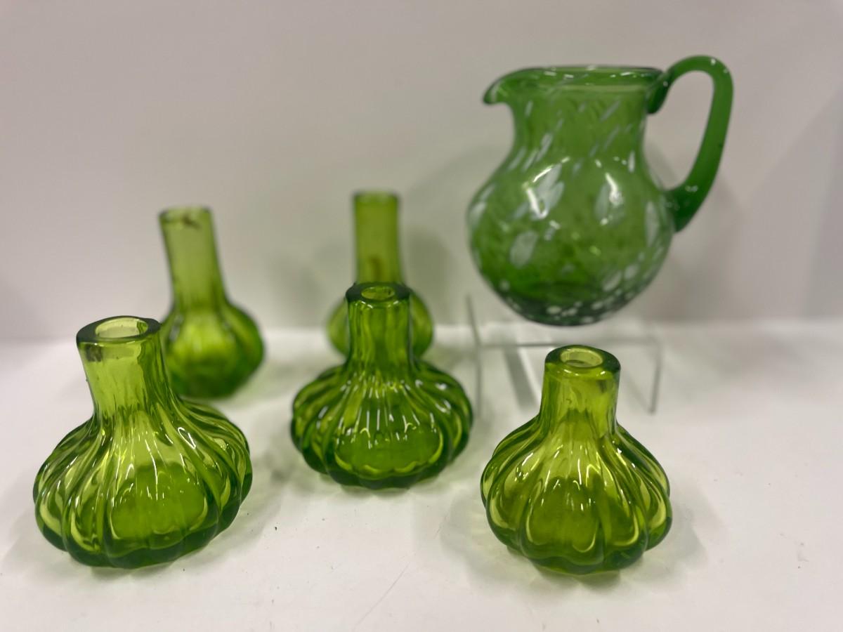 Lot of mostly hand made green glass bud vases plus one small green and white glass creamer/pitcher. All in very good condition.