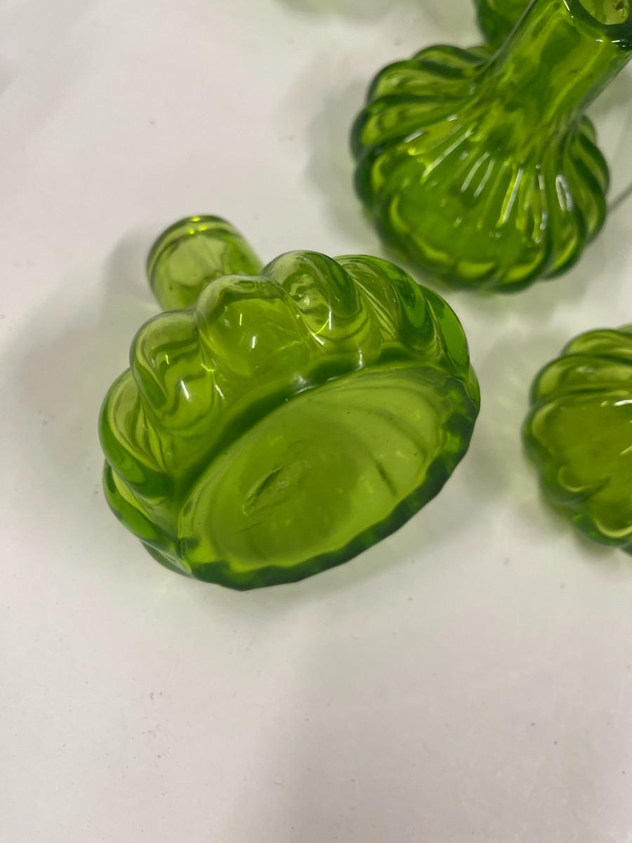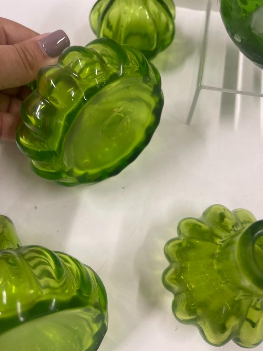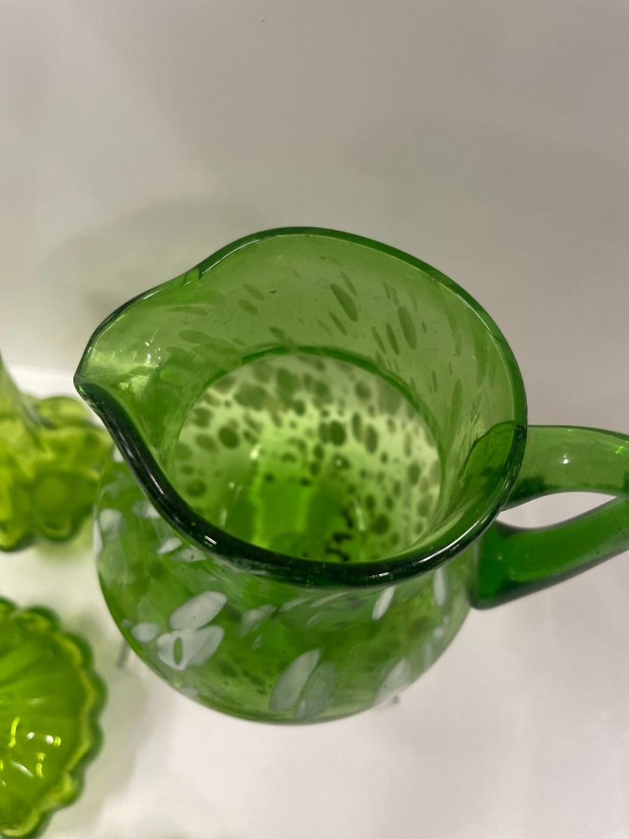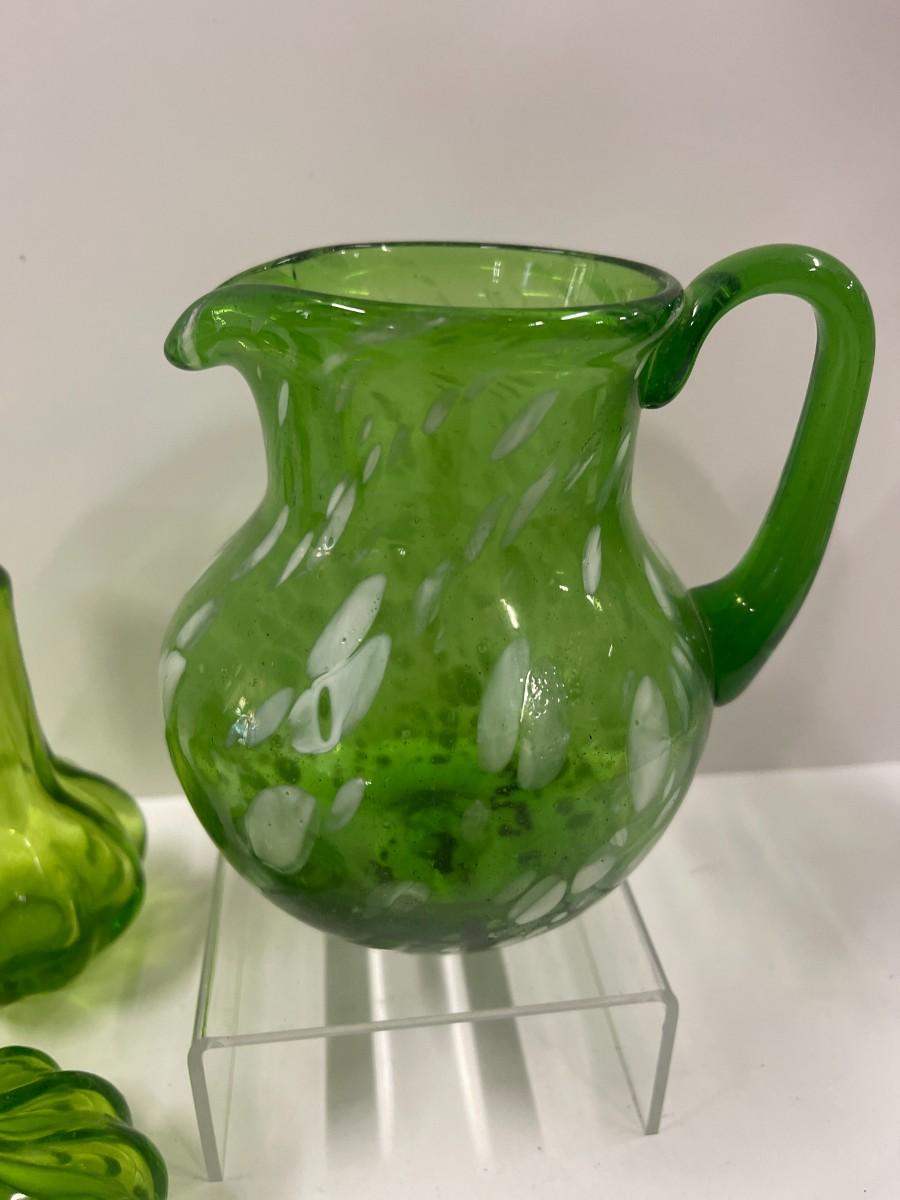 Lot of mostly hand made green glass bud vases plus one small green and white glass creamer/pitcher. All in very good condition.