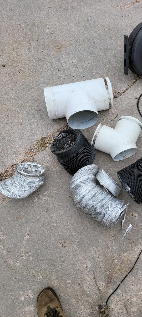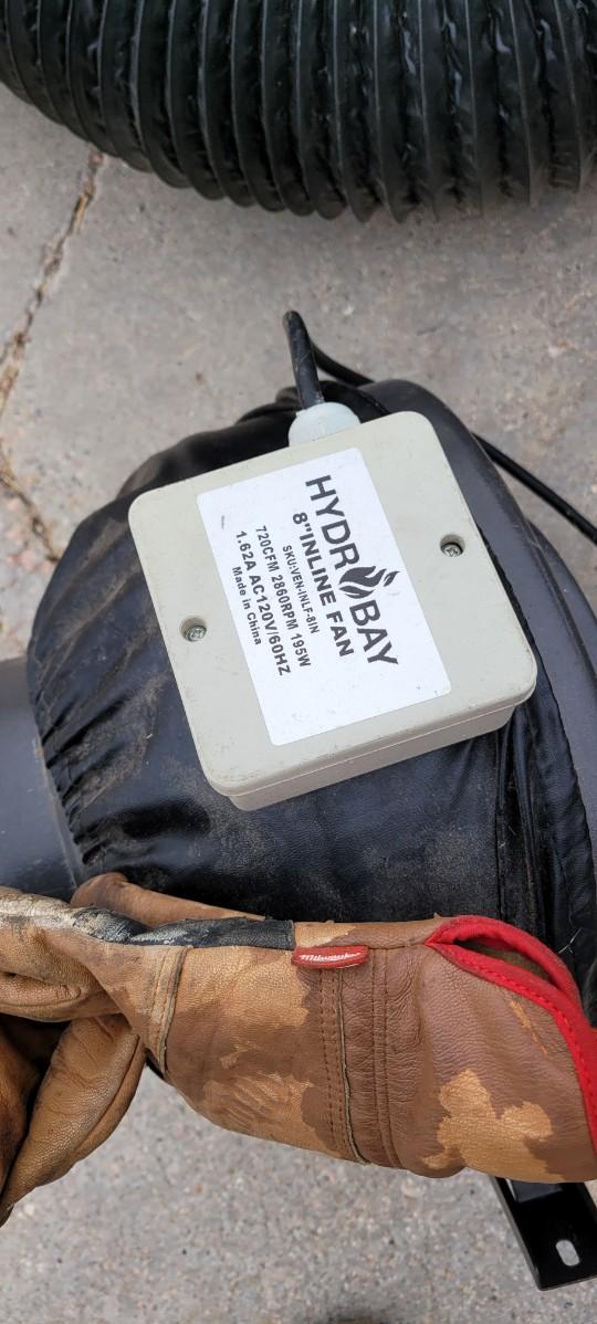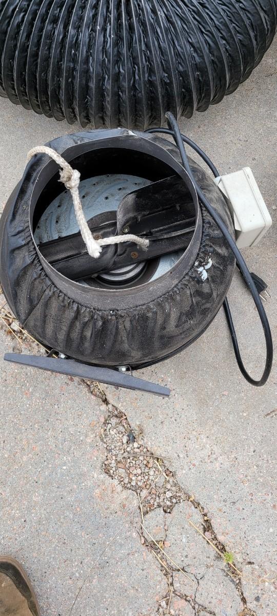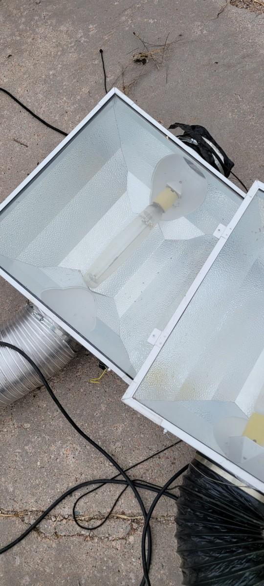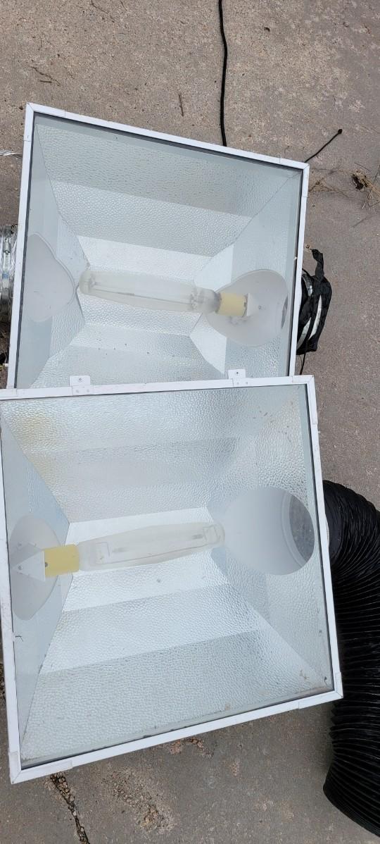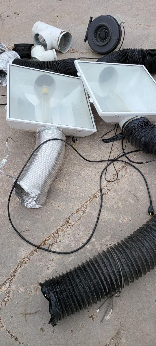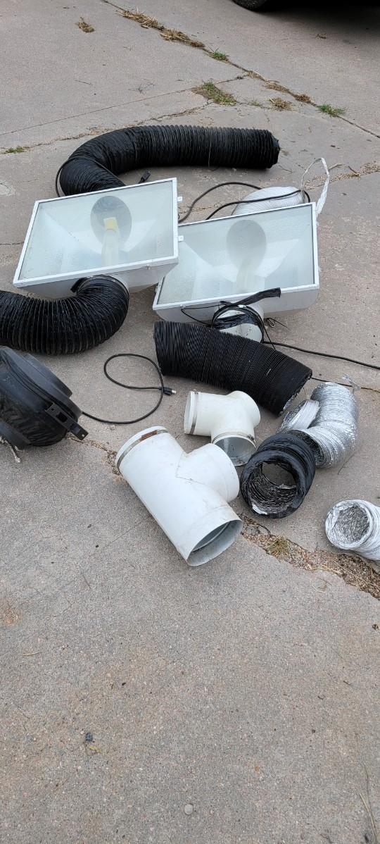There is a 8" in line exhaust fan, works, an 8" metal T a 6" metal wye some vent tube. There are also 2 8" Gen 3 Sun system grow lights, unable to test, I believe the plug is made to go into a ballast.