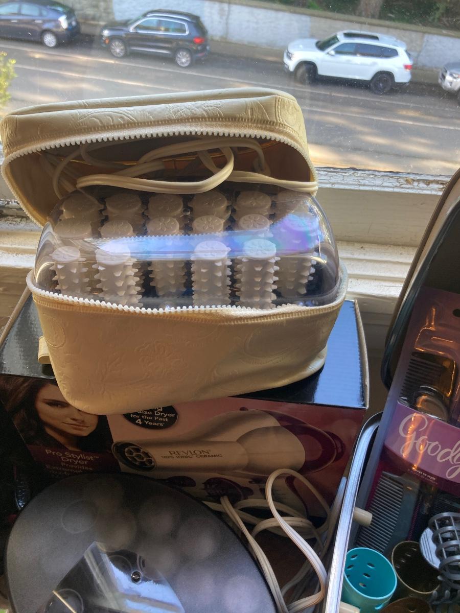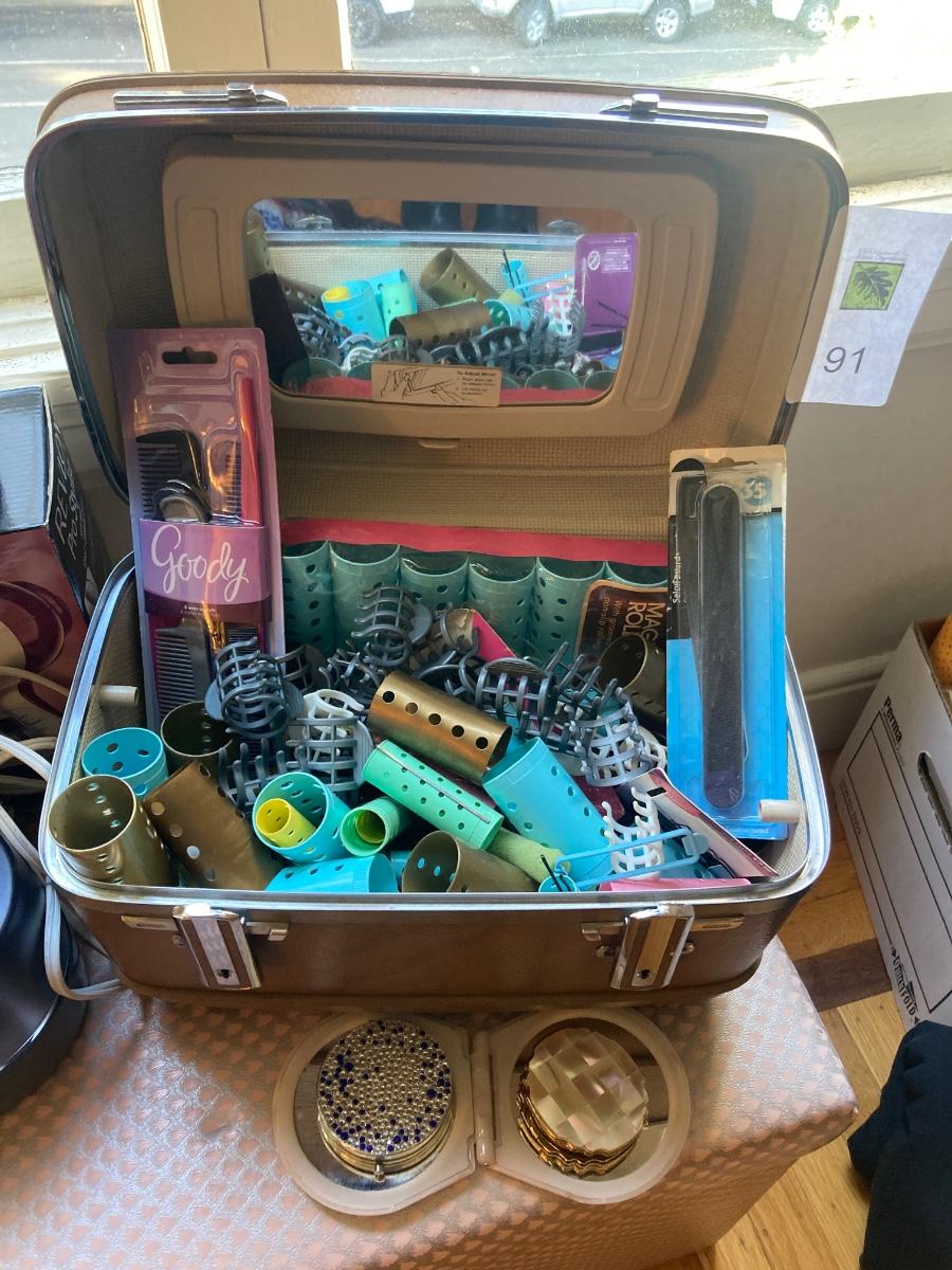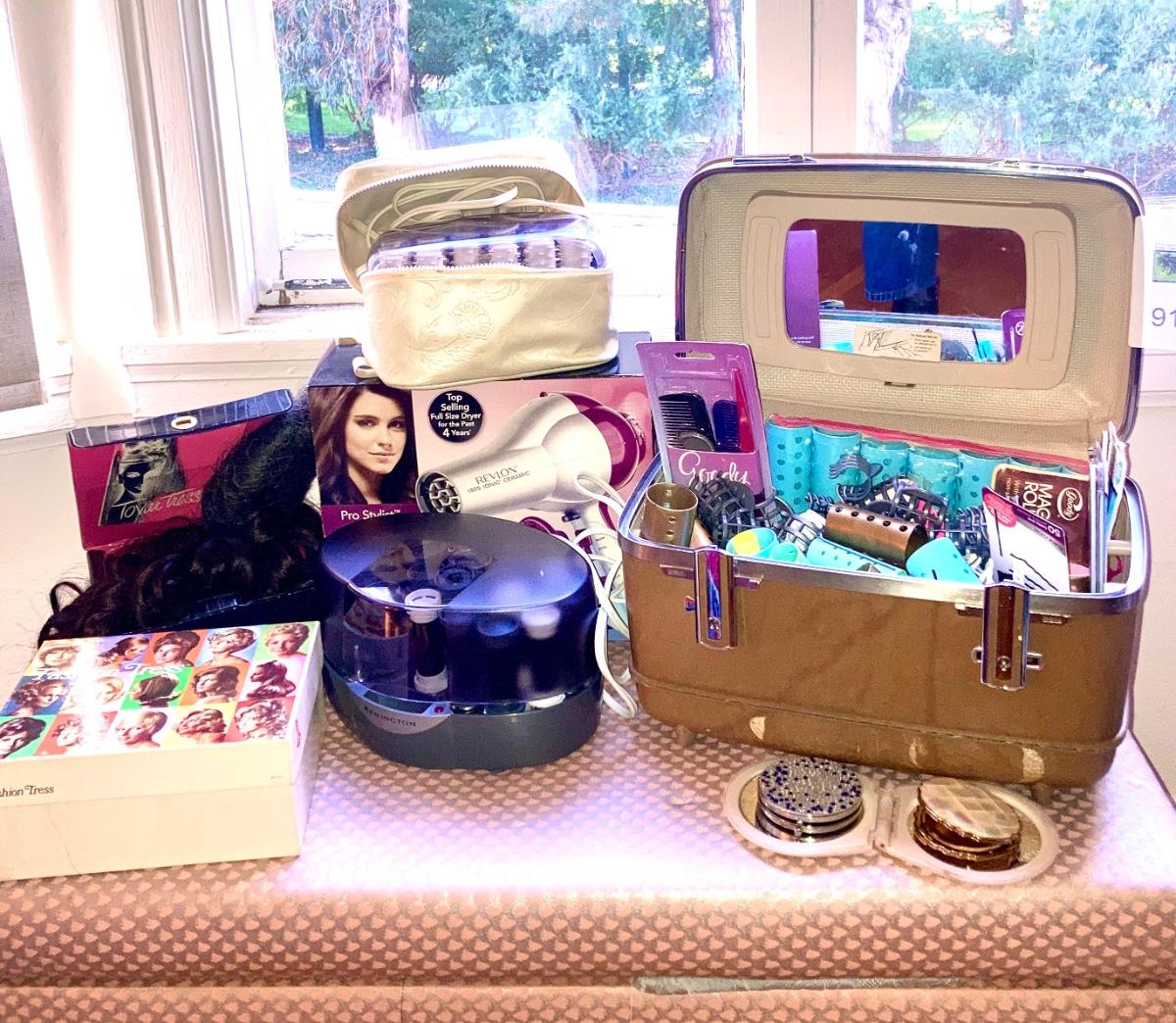 Lot includes 2 hot roller sets, hard toiletry case full of curlers and hair combs , emery boards 3 flip to open compact mirrors and 2 boxes with vintage hair piece poneytails / updo.