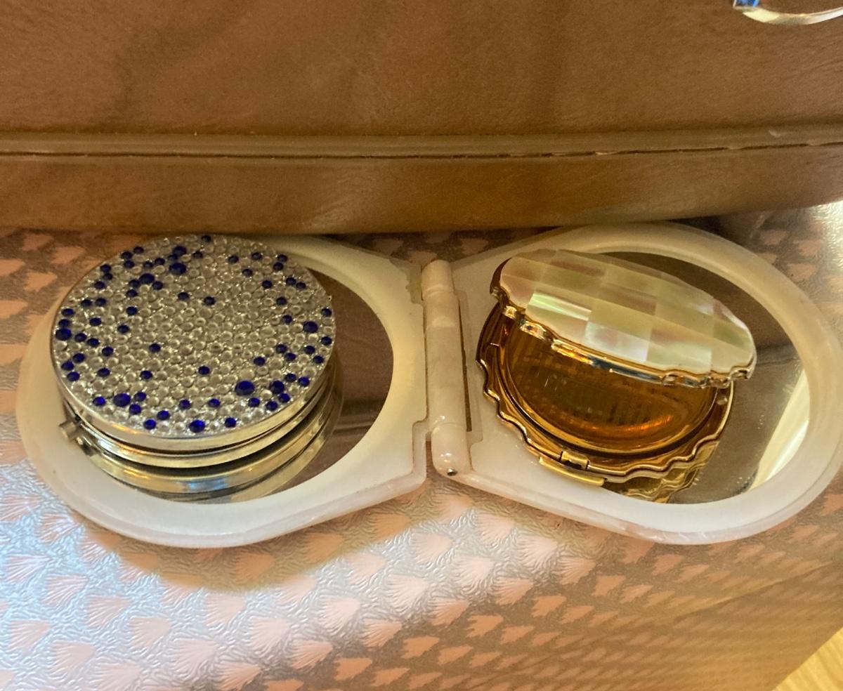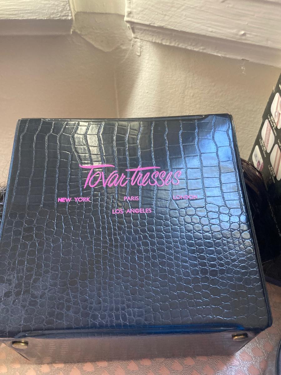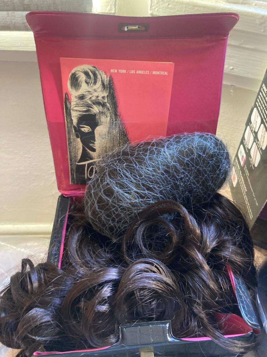 Lot includes 2 hot roller sets, hard toiletry case full of curlers and hair combs , emery boards 3 flip to open compact mirrors and 2 boxes with vintage hair piece poneytails / updo.
