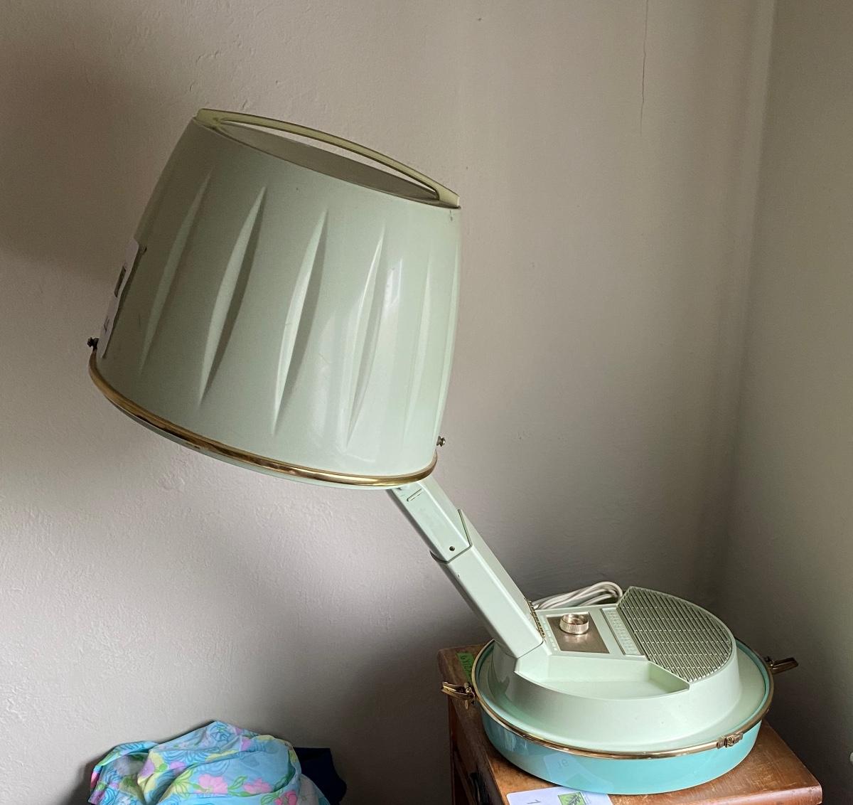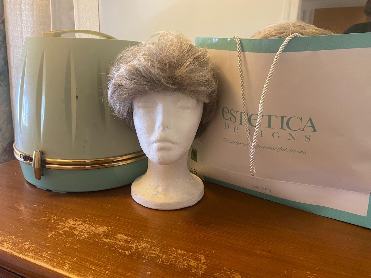Vintage hairdryer with collection of wigs