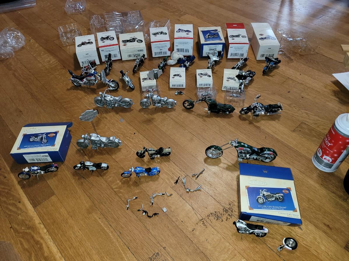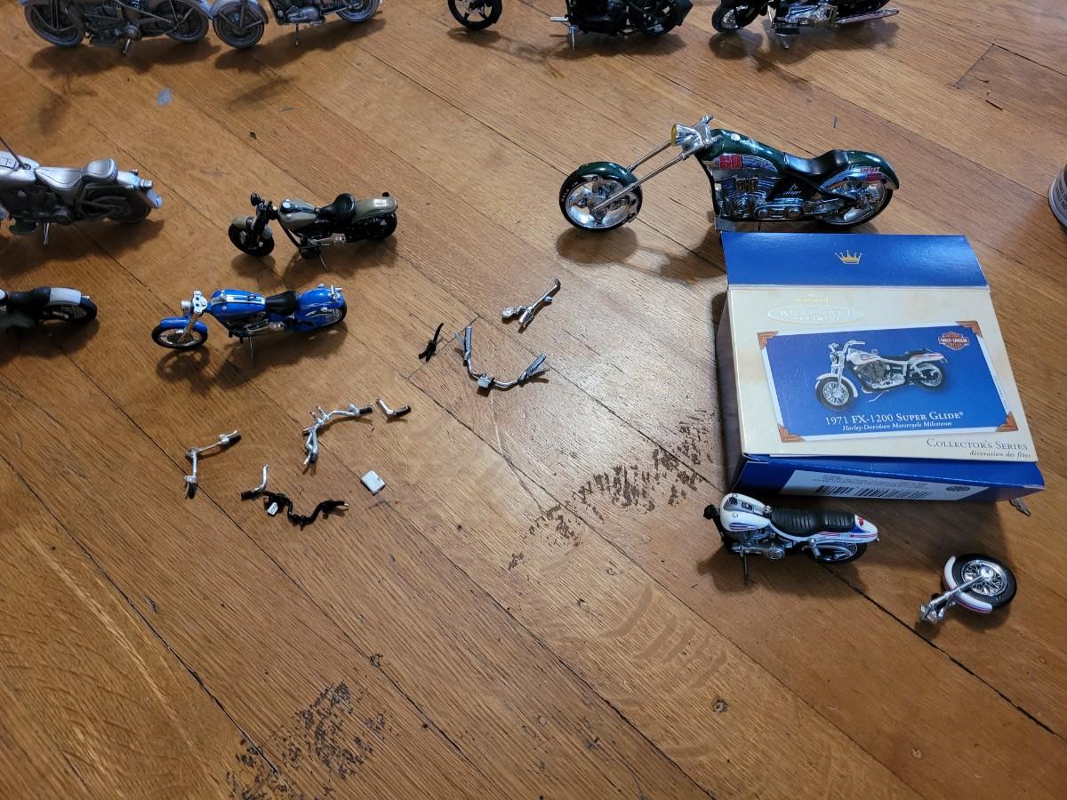 Update, I've added 1 motorcycle and a box that are not photographed. I found them after a packaged everything up and didn't want to unbox and unwrap everything.
