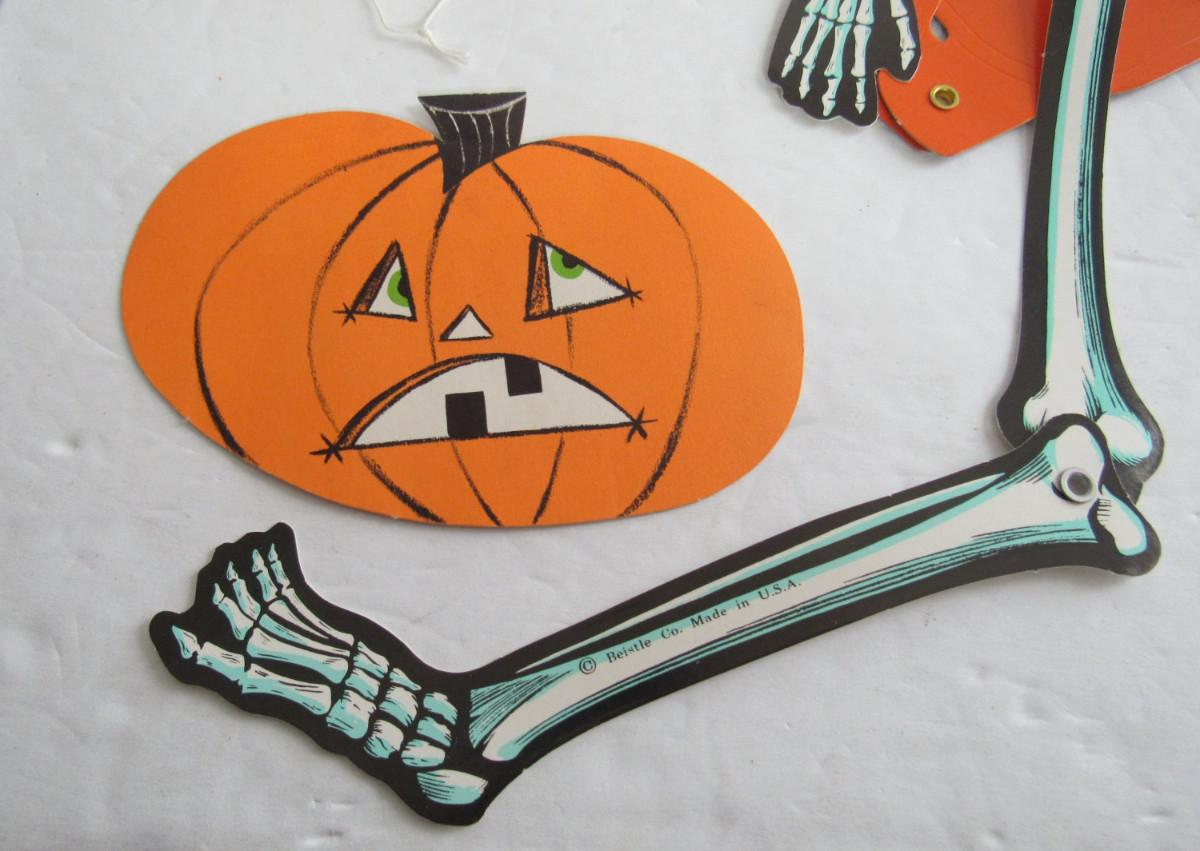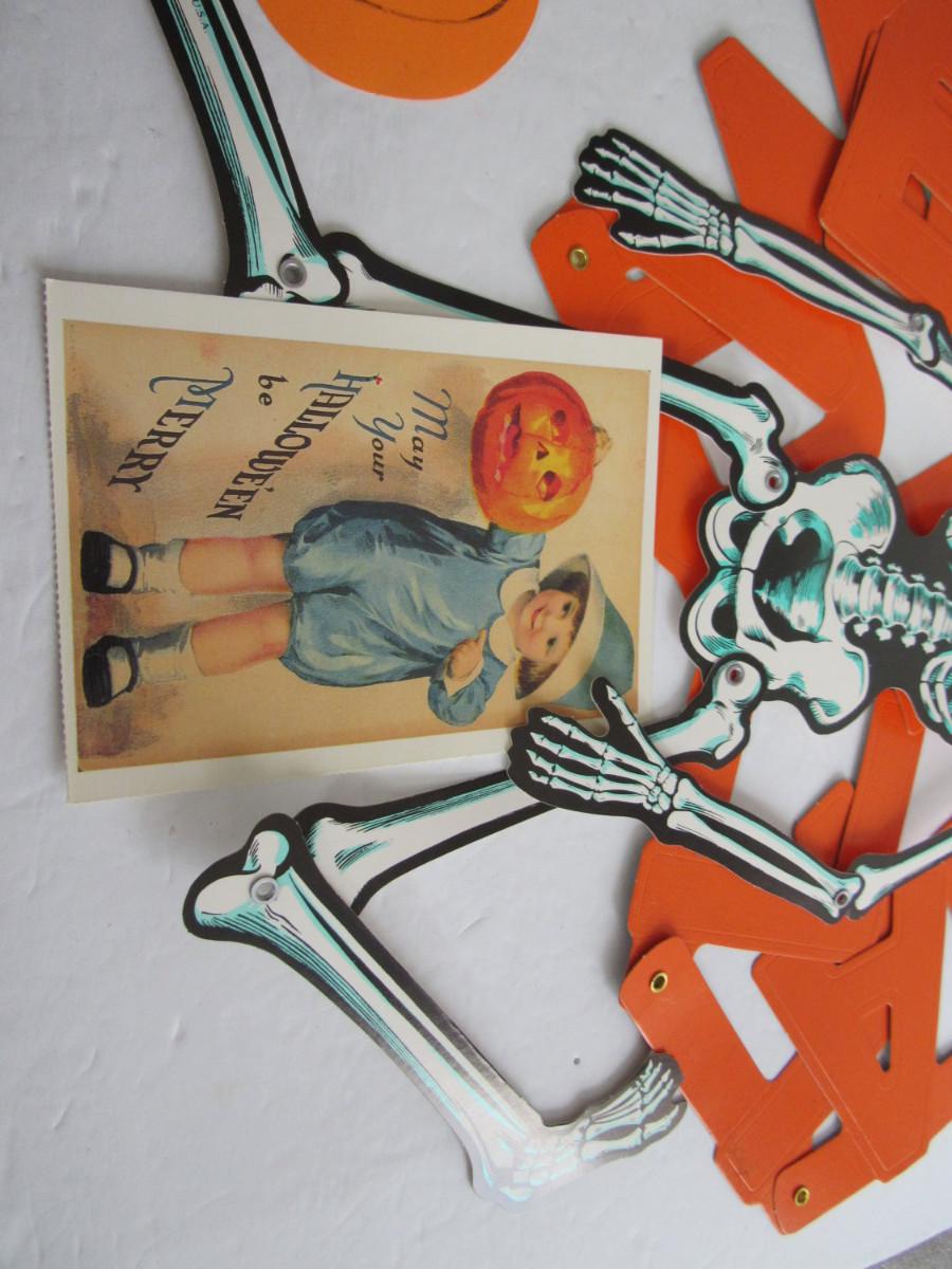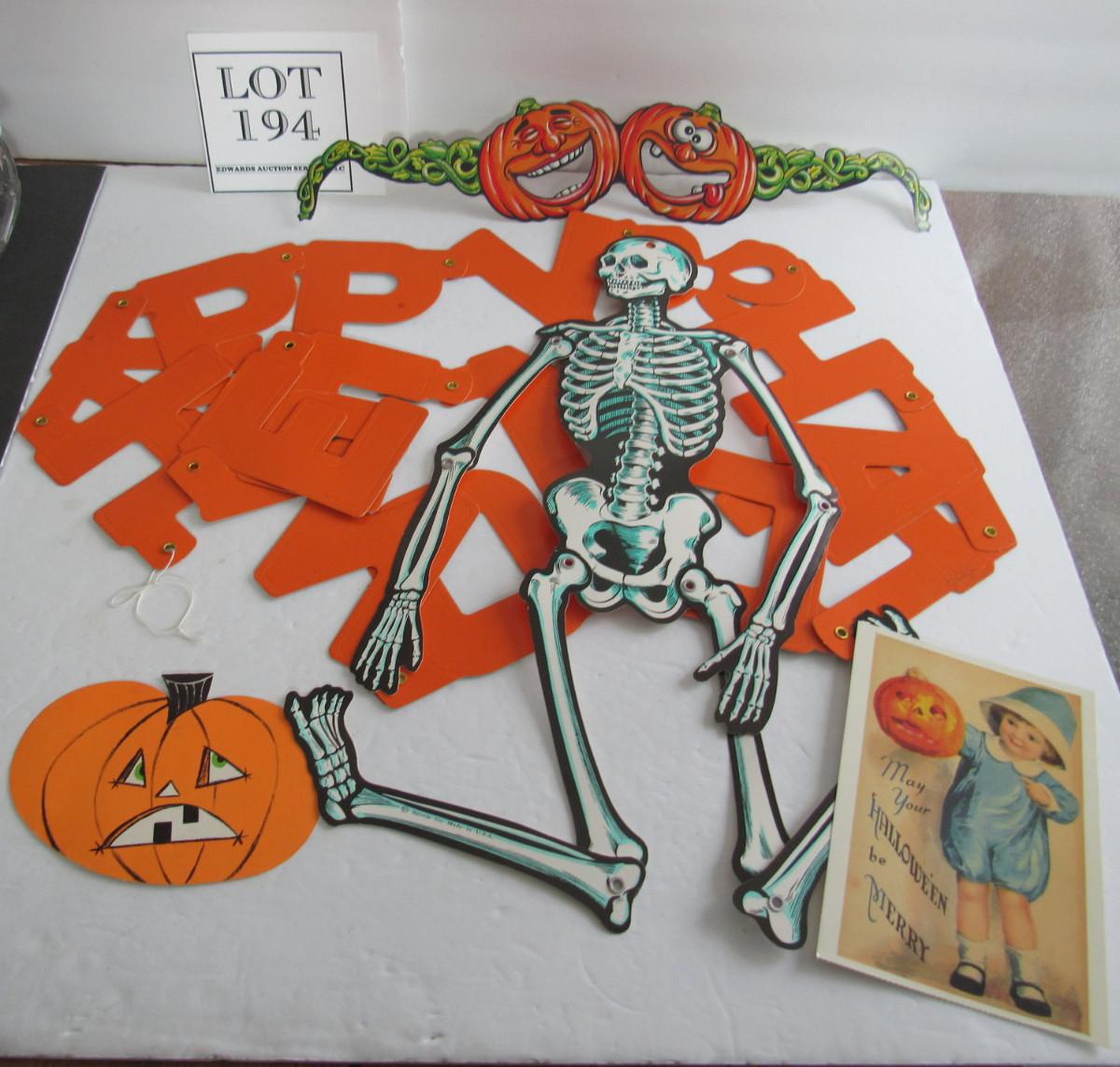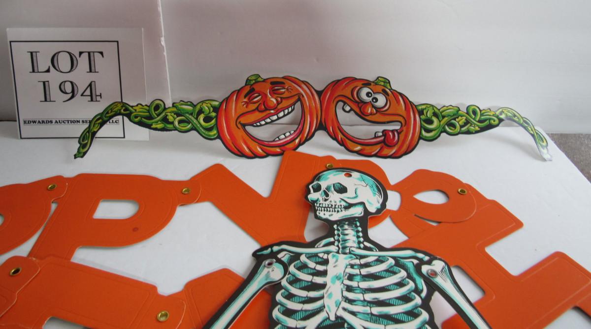 Nice items but newer. The skeleton and glasses are pretty thin modern paper but still really cute. The Happy Halloween sign is thinner embossed and riveted cardboard. Shipping is available at cost plus $5.00 per box handing and supply fee. See our terms for details. All sales final.
