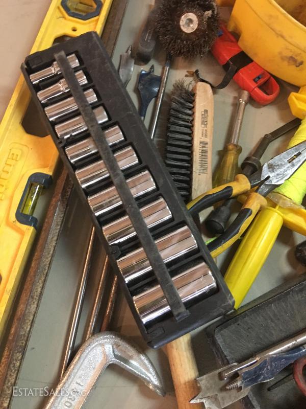 Lot of Hand Tools Level, Sockets, Bits, Wrenches