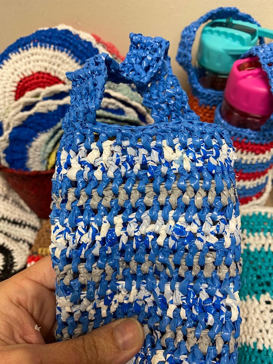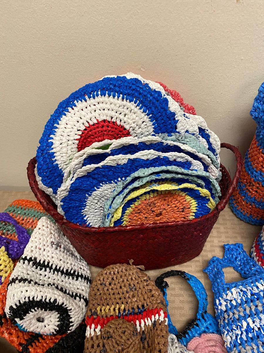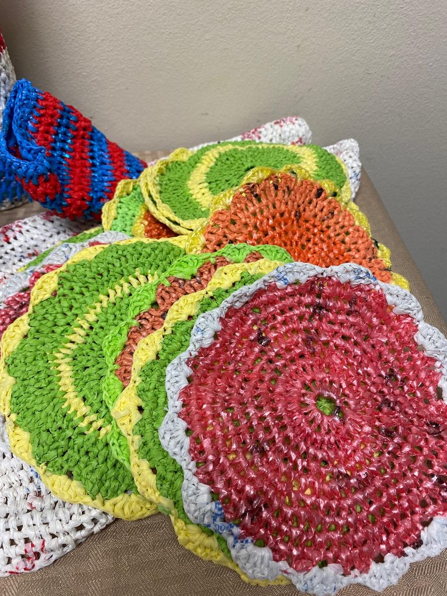 Lot of handmade knotted/crochet plastic bag doilies and bottle koozies. Made with thin plastic grocery style bags. In good conditions, colorful designs. Different sizes and colors.
