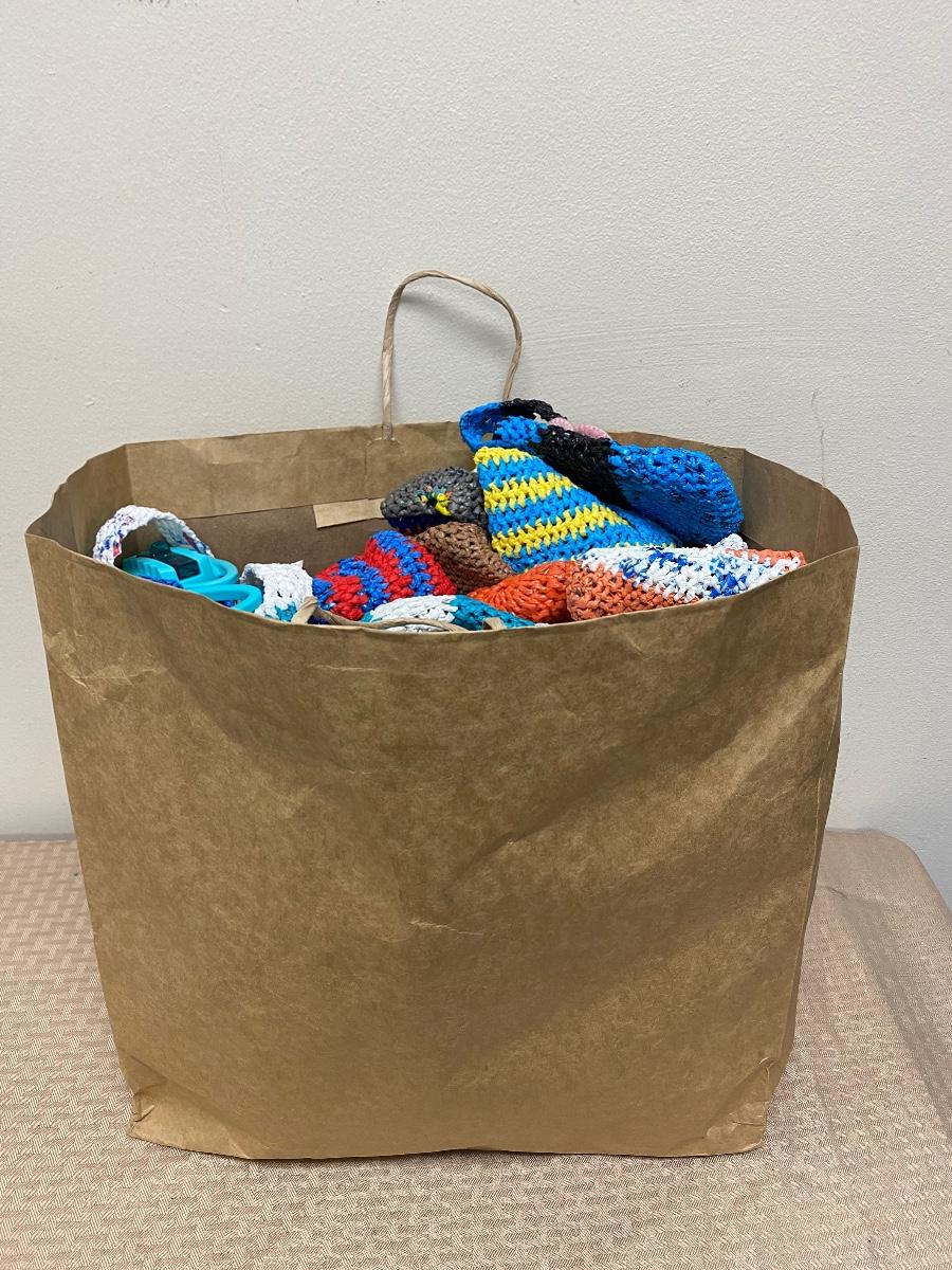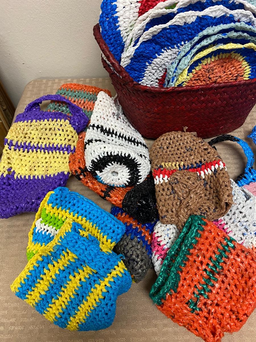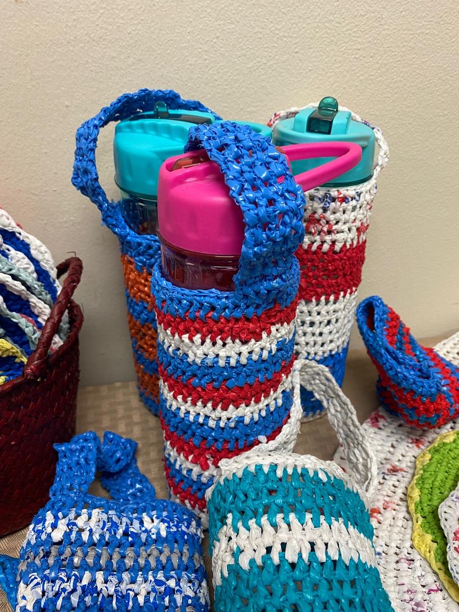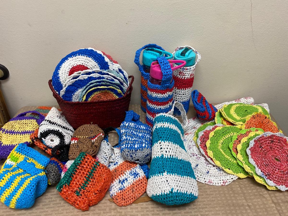 Lot of handmade knotted/crochet plastic bag doilies and bottle koozies. Made with thin plastic grocery style bags. In good conditions, colorful designs. Different sizes and colors.