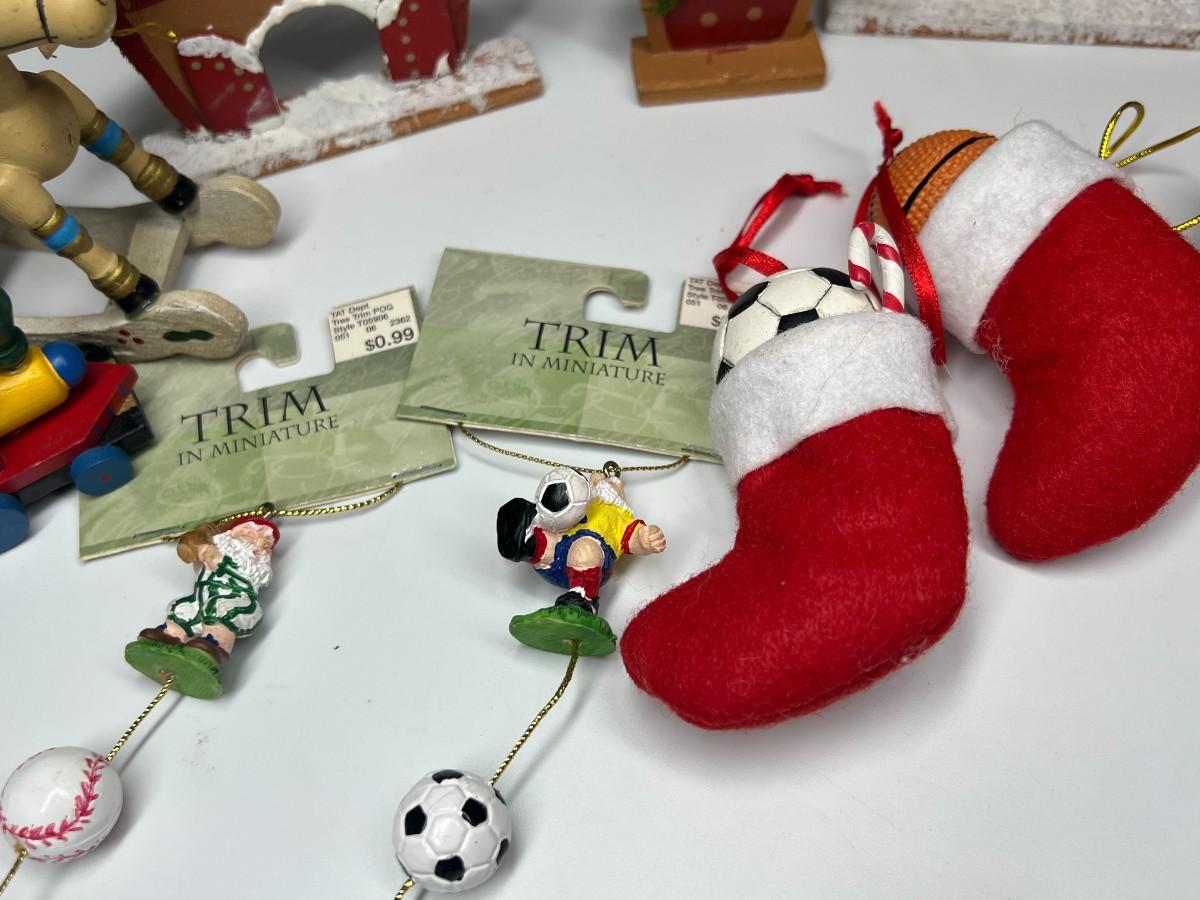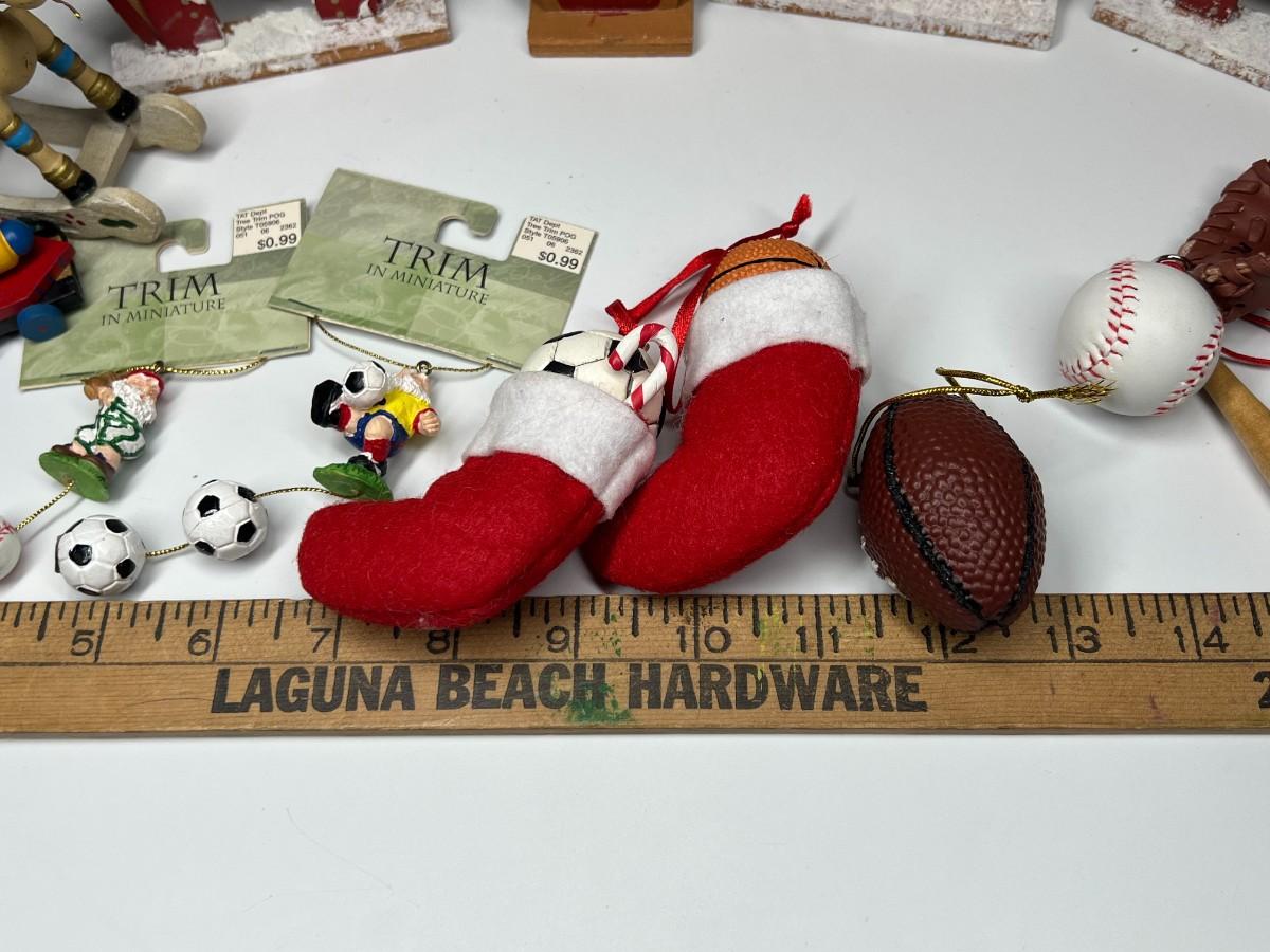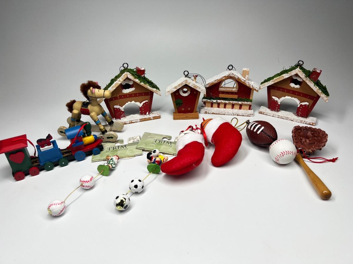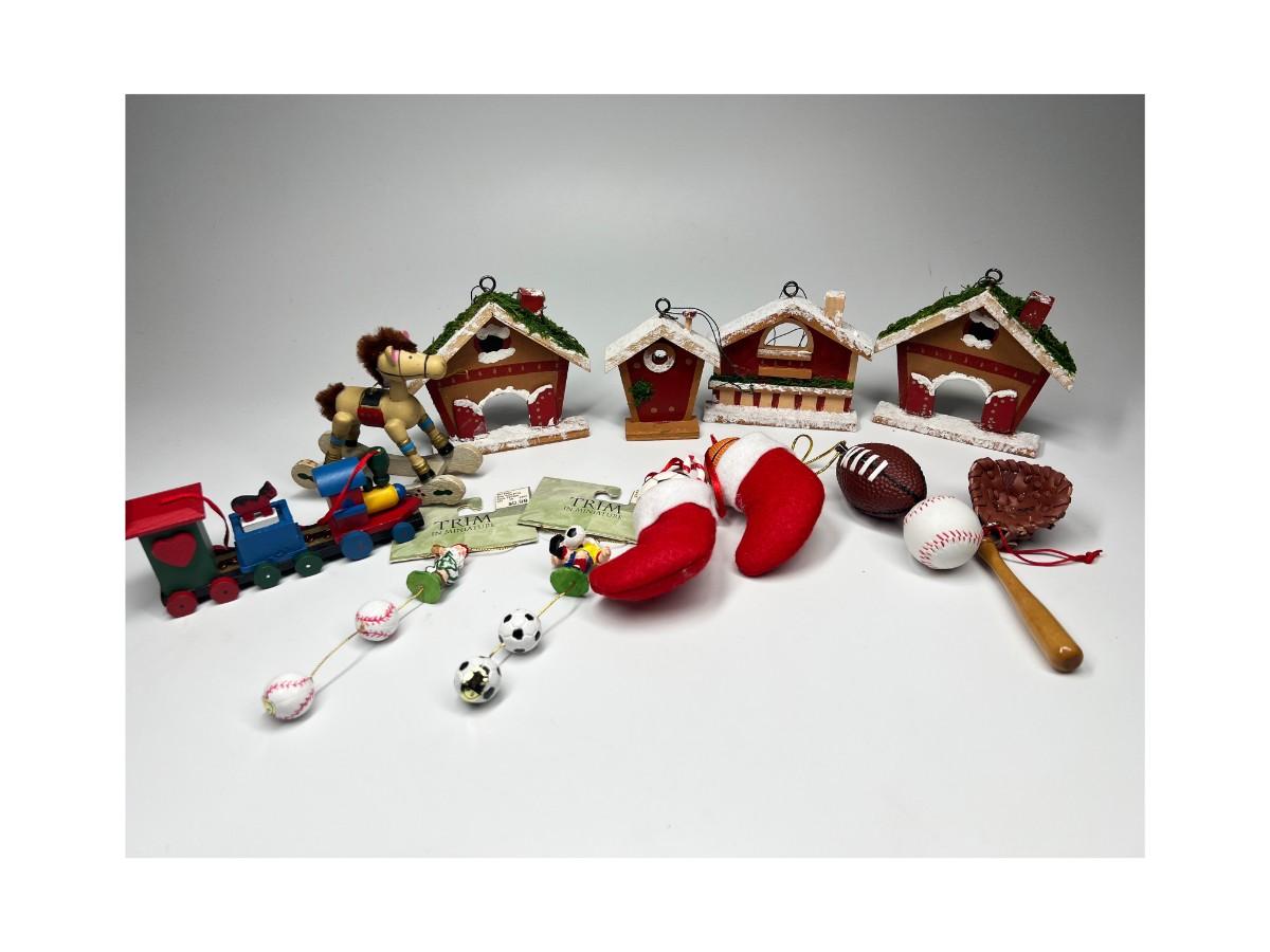 Lot of Hanging Christmas Tree Sport Ornaments, Wood Houses, Toys, & More