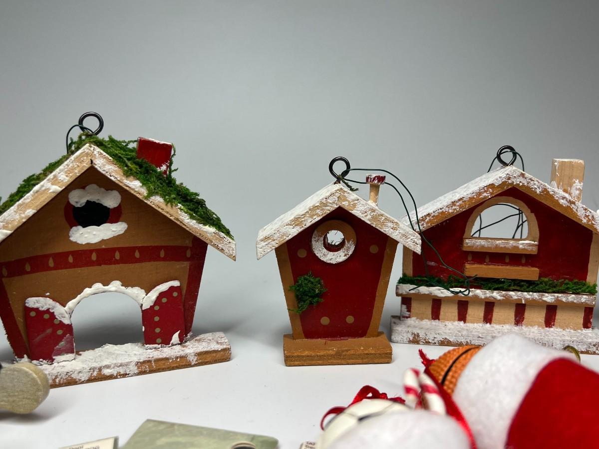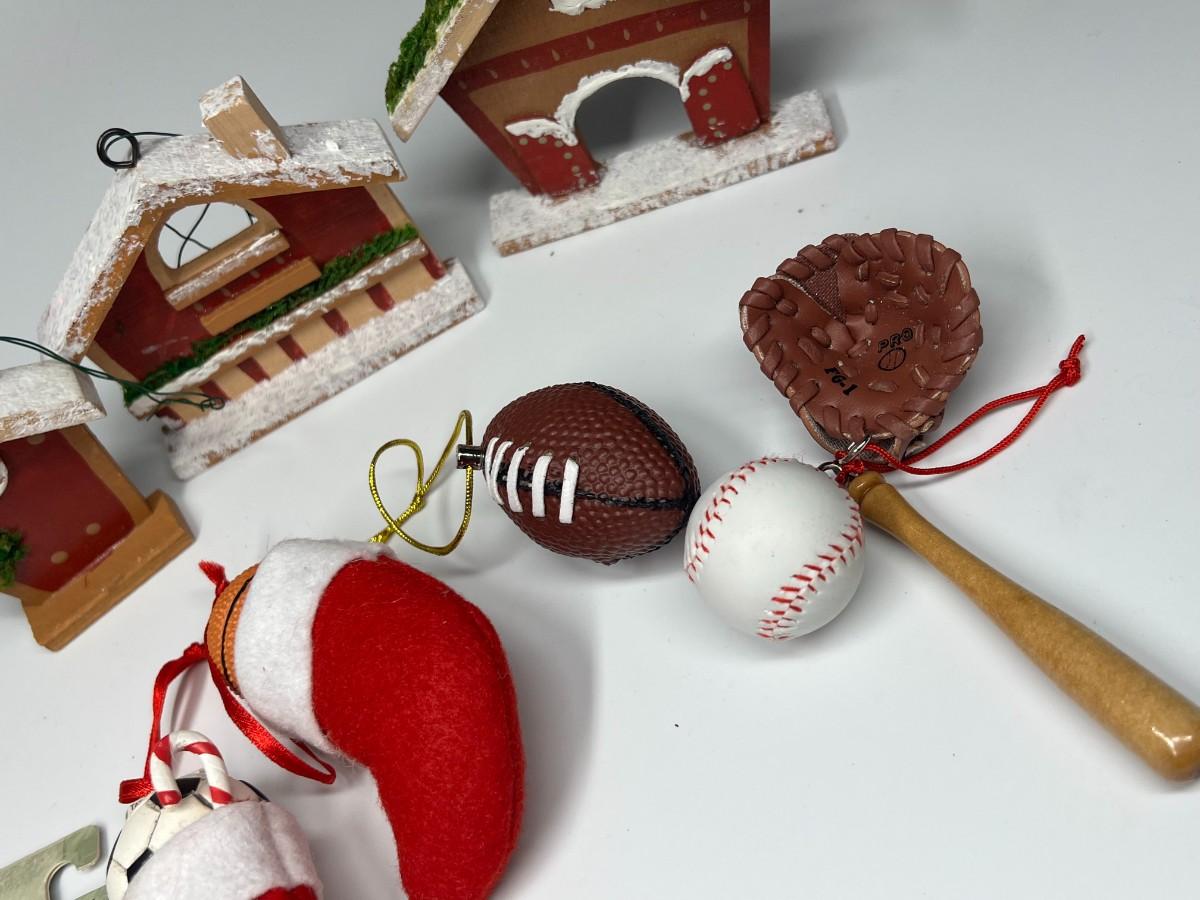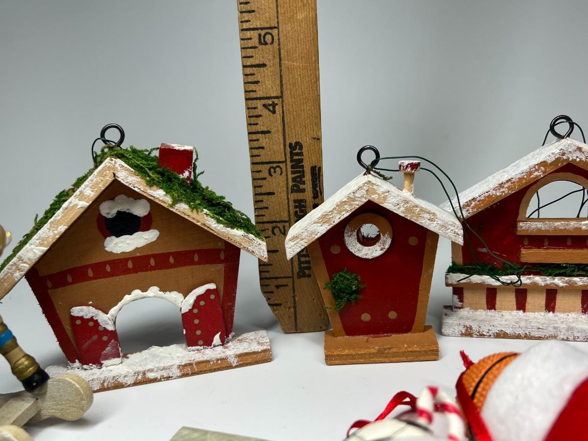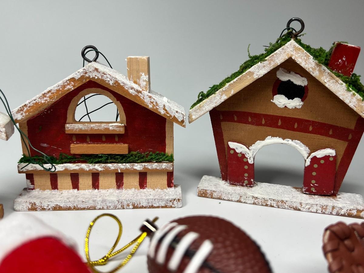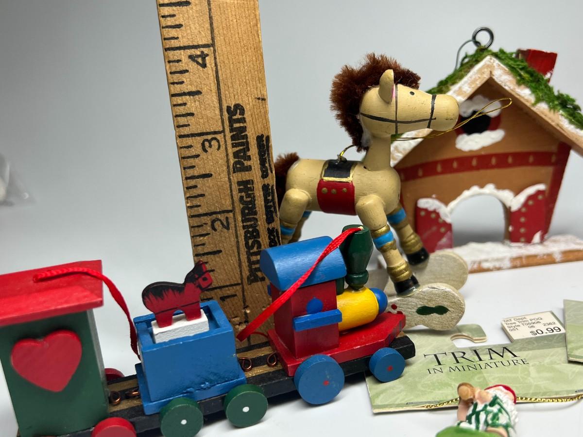 Lot of Hanging Christmas Tree Sport Ornaments, Wood Houses, Toys, & More