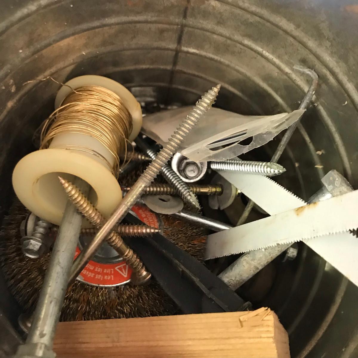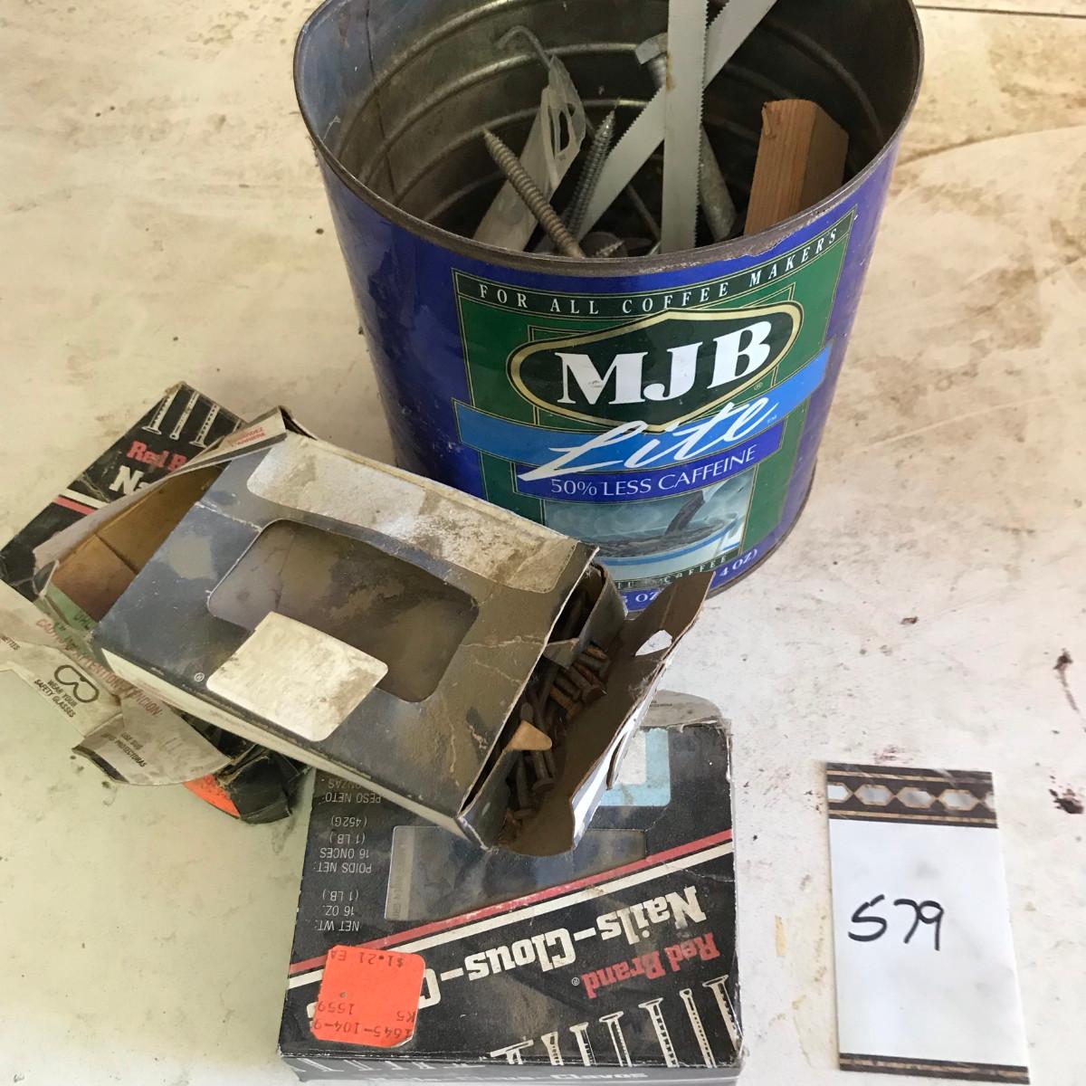3-1/3 full boxes of nails. Bin of misc hardware.